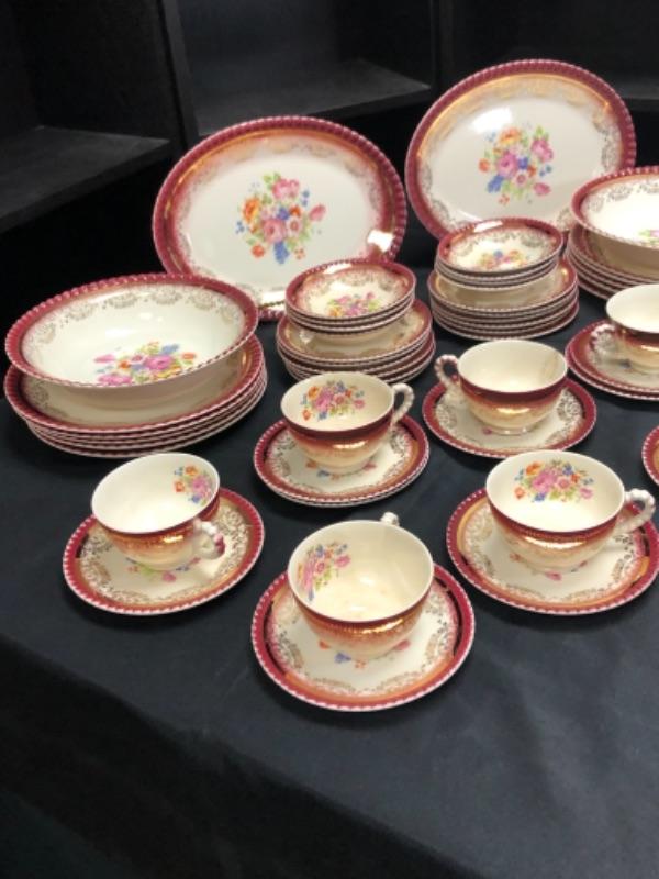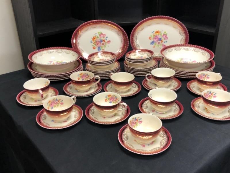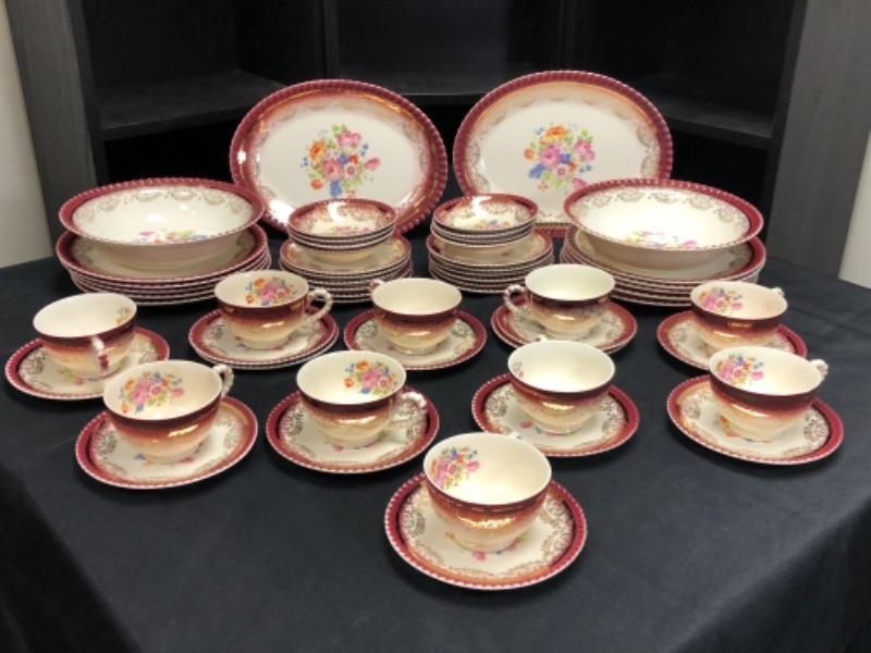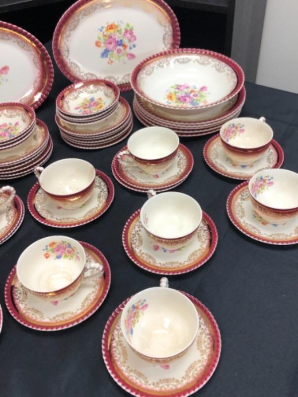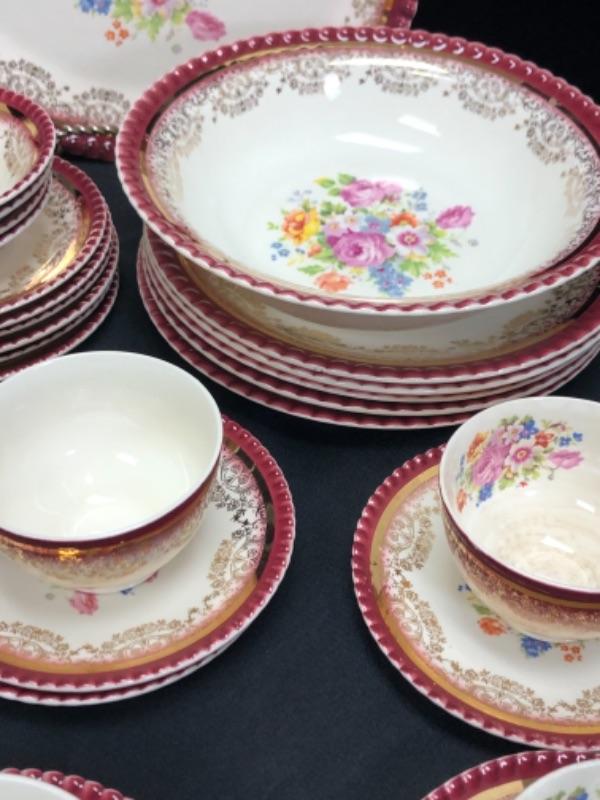 Nasco China Set, Beautiful Antique burgundy border floral pattern w/gold edge MADE IN USA