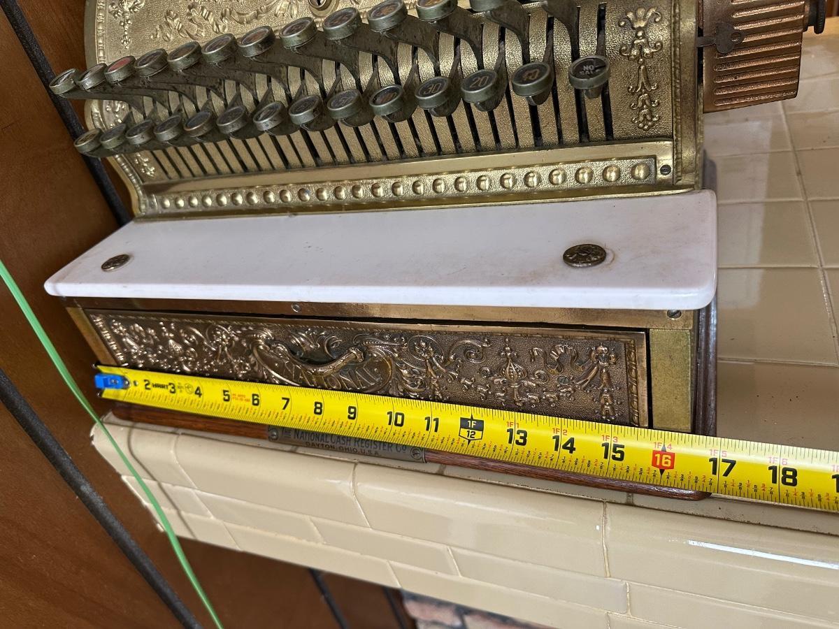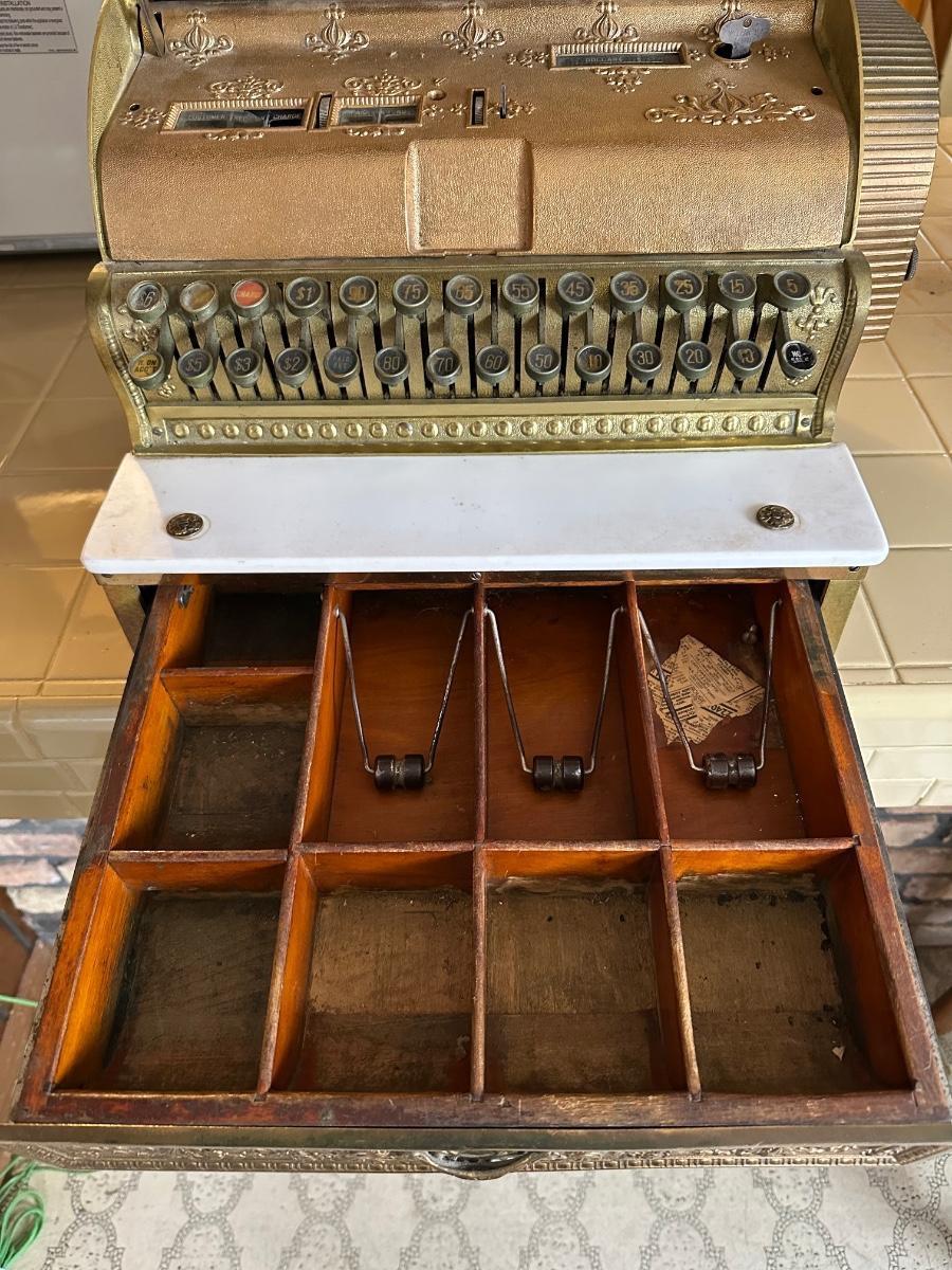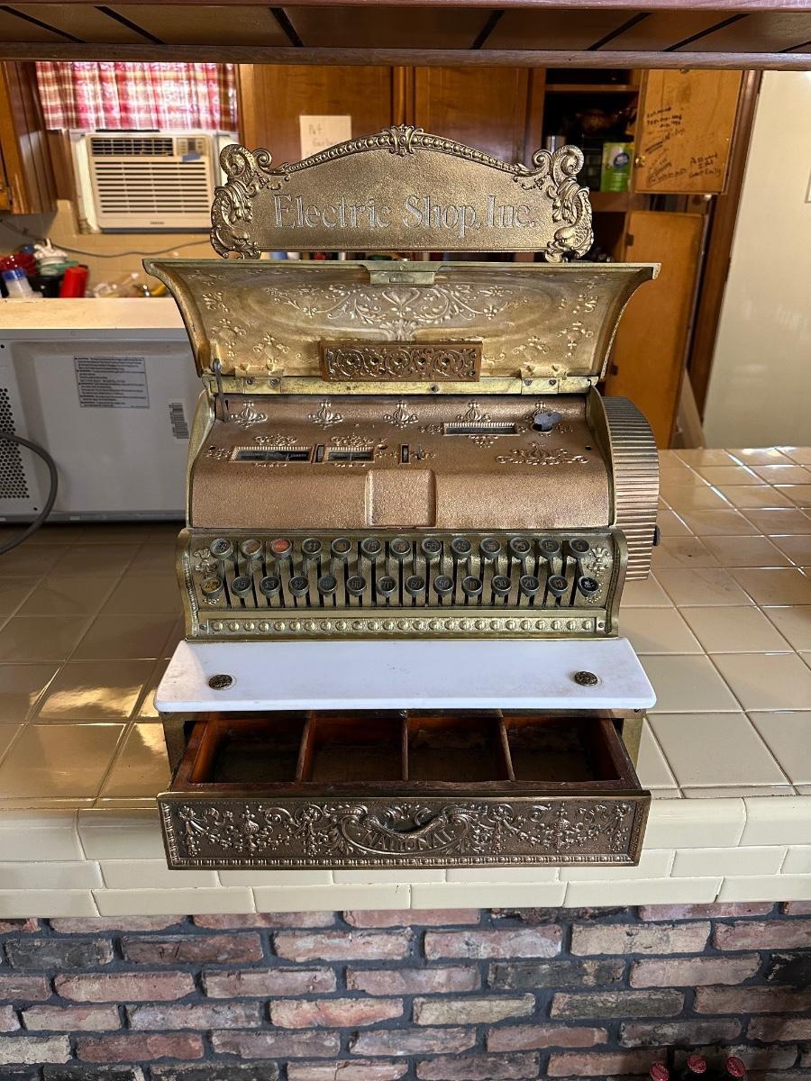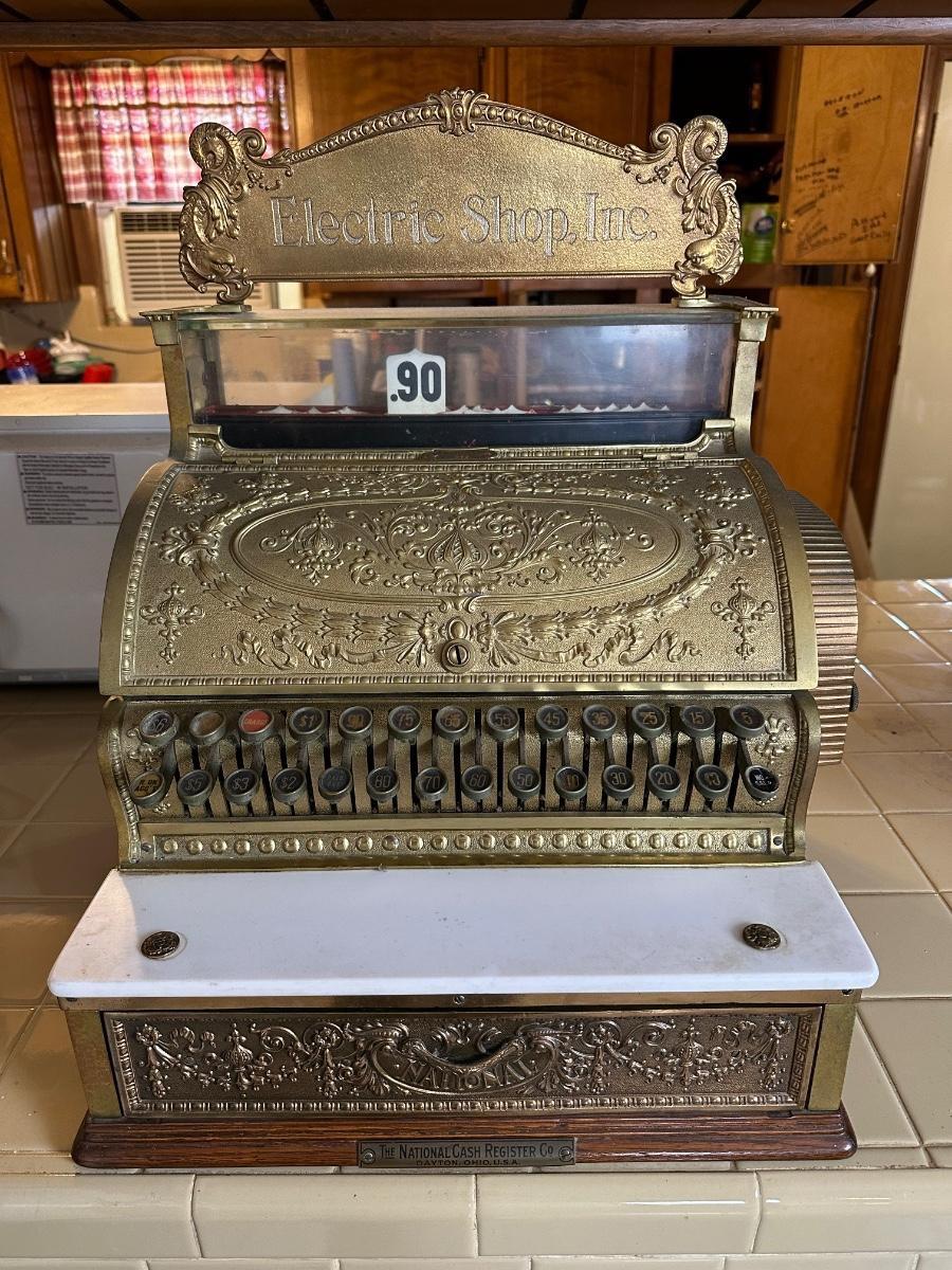 Early National Cash Register Company (NCR) ornate brass cash register with marble shelf and original wood base. Marked “Electric Shop Inc.” on top crest. Serial tag present (No. 1389893 / Model 349). Drawer opens, interior mechanisms intact. Keys do not move and register is not currently operational. Sold as-is for restoration, display, or parts. All visible parts appear present. This would work flawlessly with very little work. Beautiful Piece!!