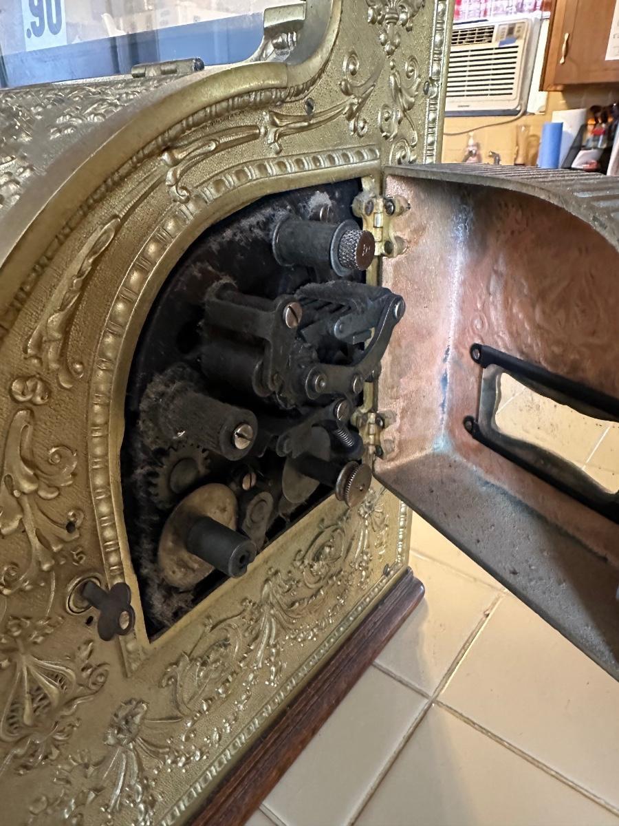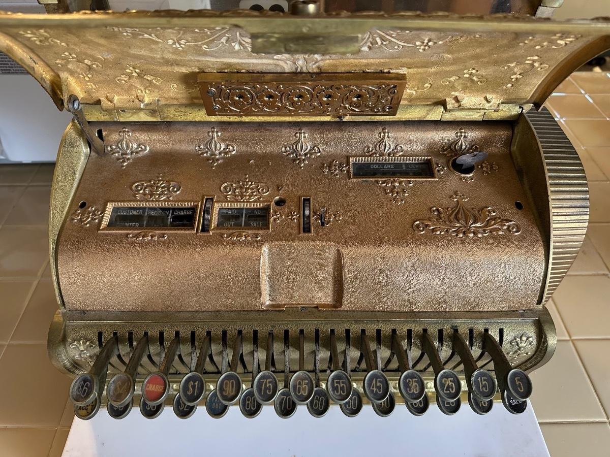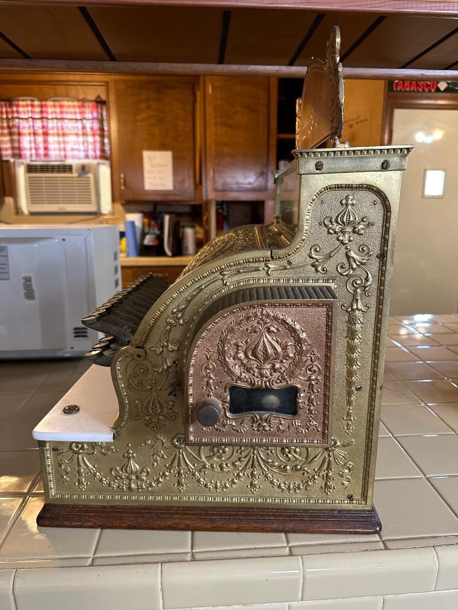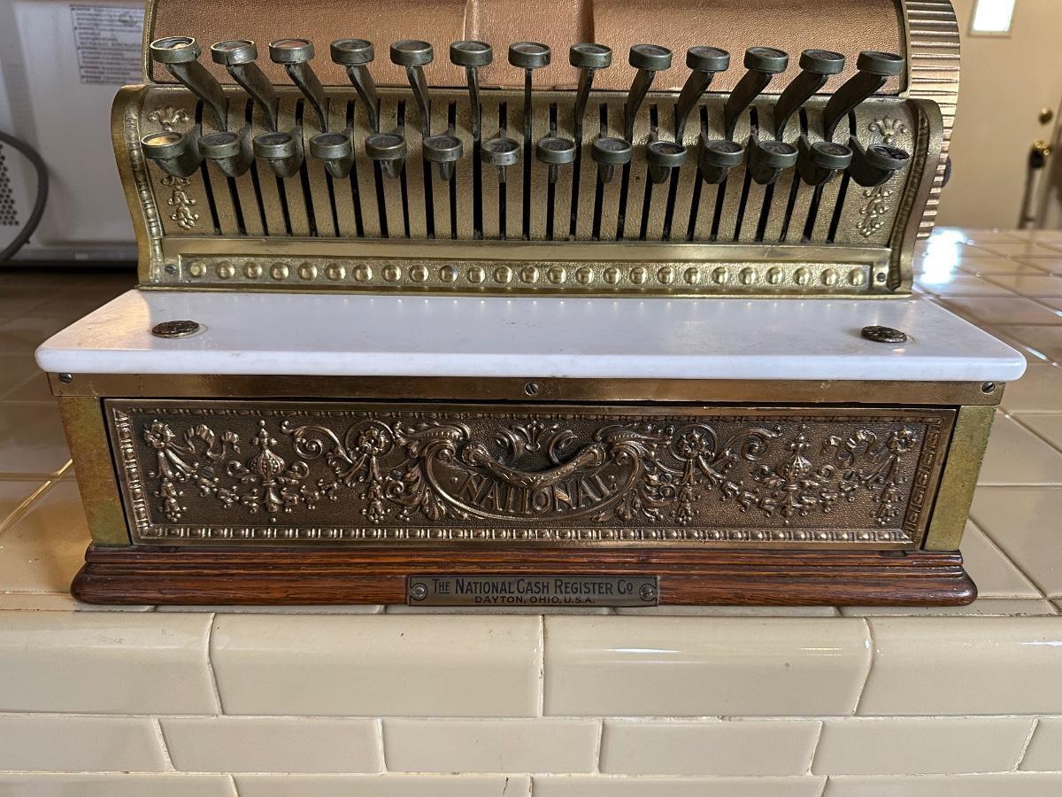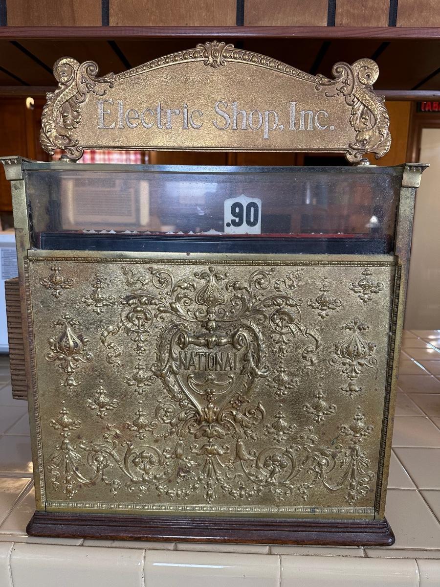 Early National Cash Register Company (NCR) ornate brass cash register with marble shelf and original wood base. Marked “Electric Shop Inc.” on top crest. Serial tag present (No. 1389893 / Model 349). Drawer opens, interior mechanisms intact. Keys do not move and register is not currently operational. Sold as-is for restoration, display, or parts. All visible parts appear present. This would work flawlessly with very little work. Beautiful Piece!!
