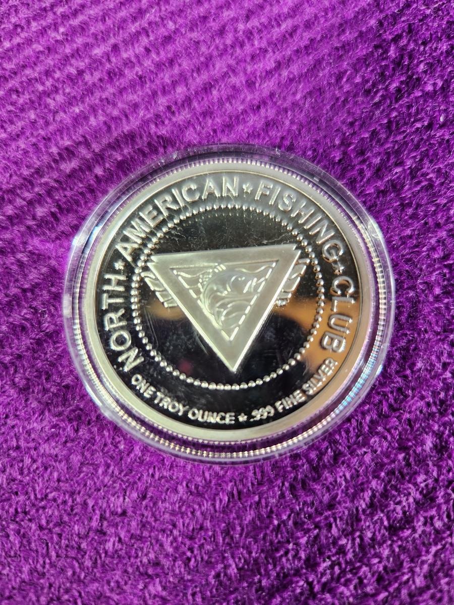 This auction lot is for a National Fishing Grand Slam Silver Coin Collection CHINOOK SALMON Coin. Encased in plastic and considered a Proof Coin, it is .999 Pure Silver, and weighs 31.1 Grams, the coin measures 39mm in diameter. Coin comes with a full-color picture card with fish information on the verso and a certificate of authentication. This coin is one of 13 different coins of this type being offered in the auction, additionally a storage case is also available elsewhere in this auction.