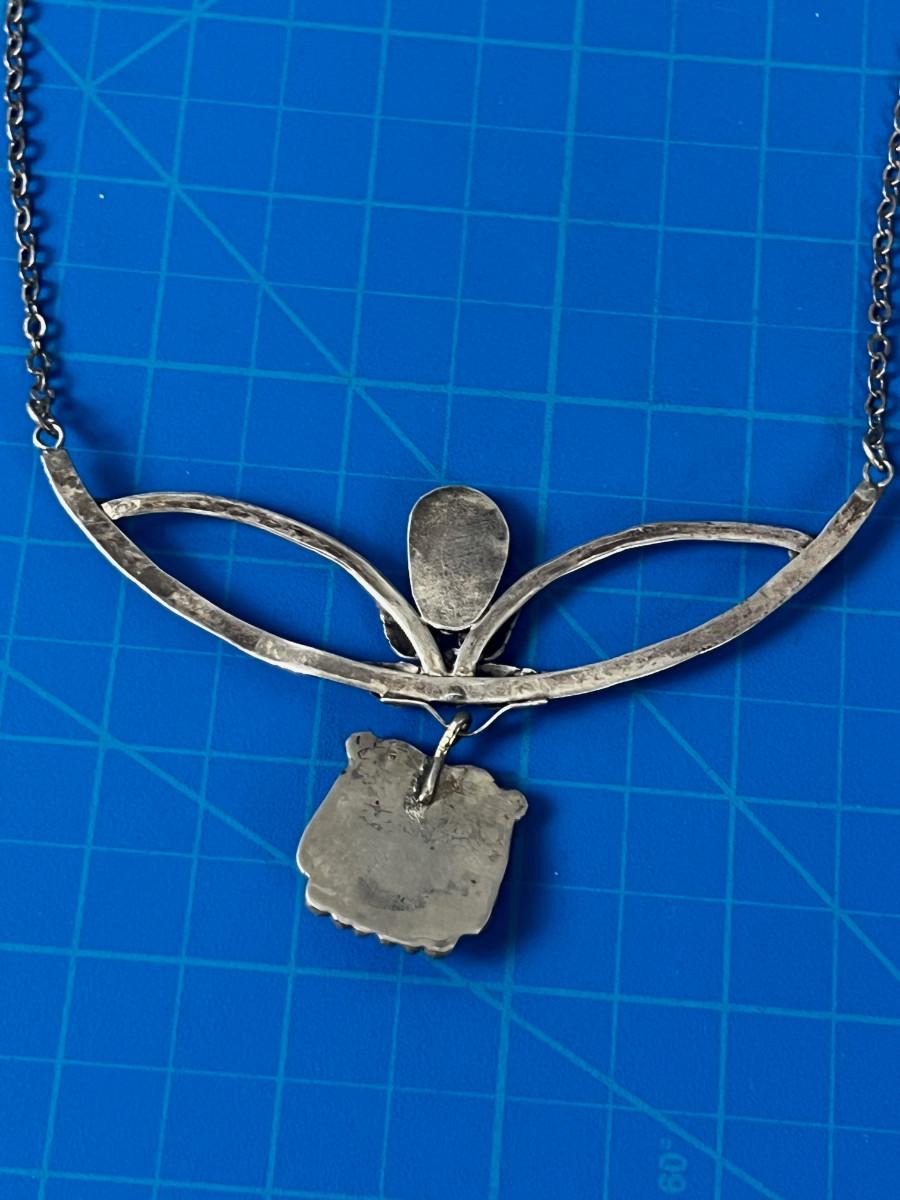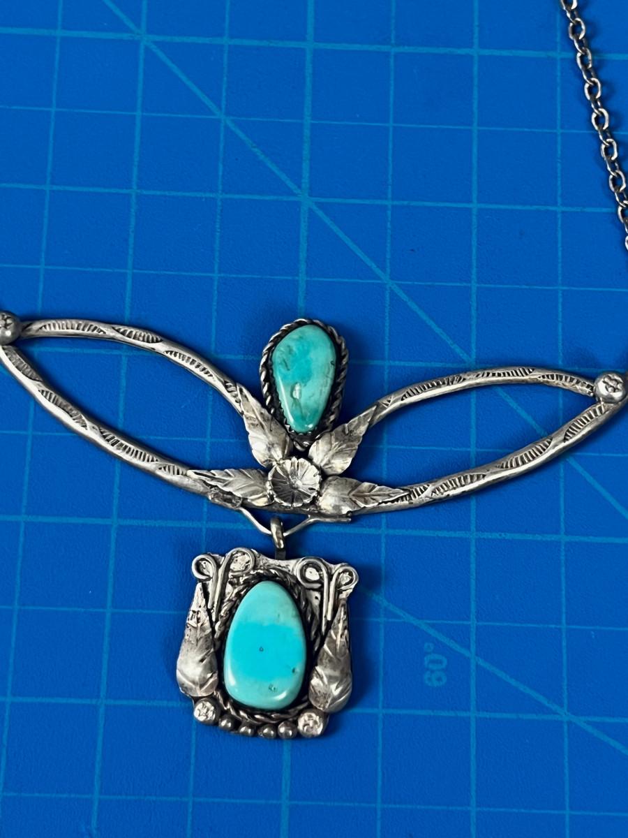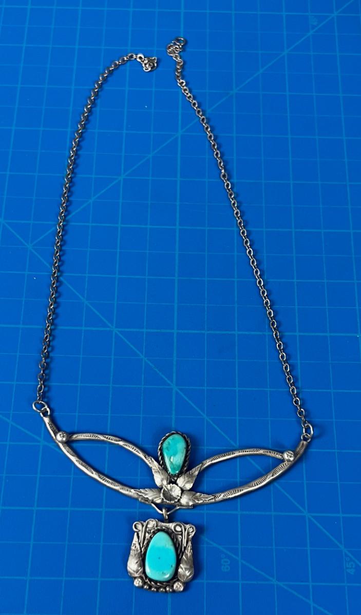Used. Still Wearable . Interesting and creative. Necklace. Silver and Turquoise. Amateur Work but Real silver and stones.