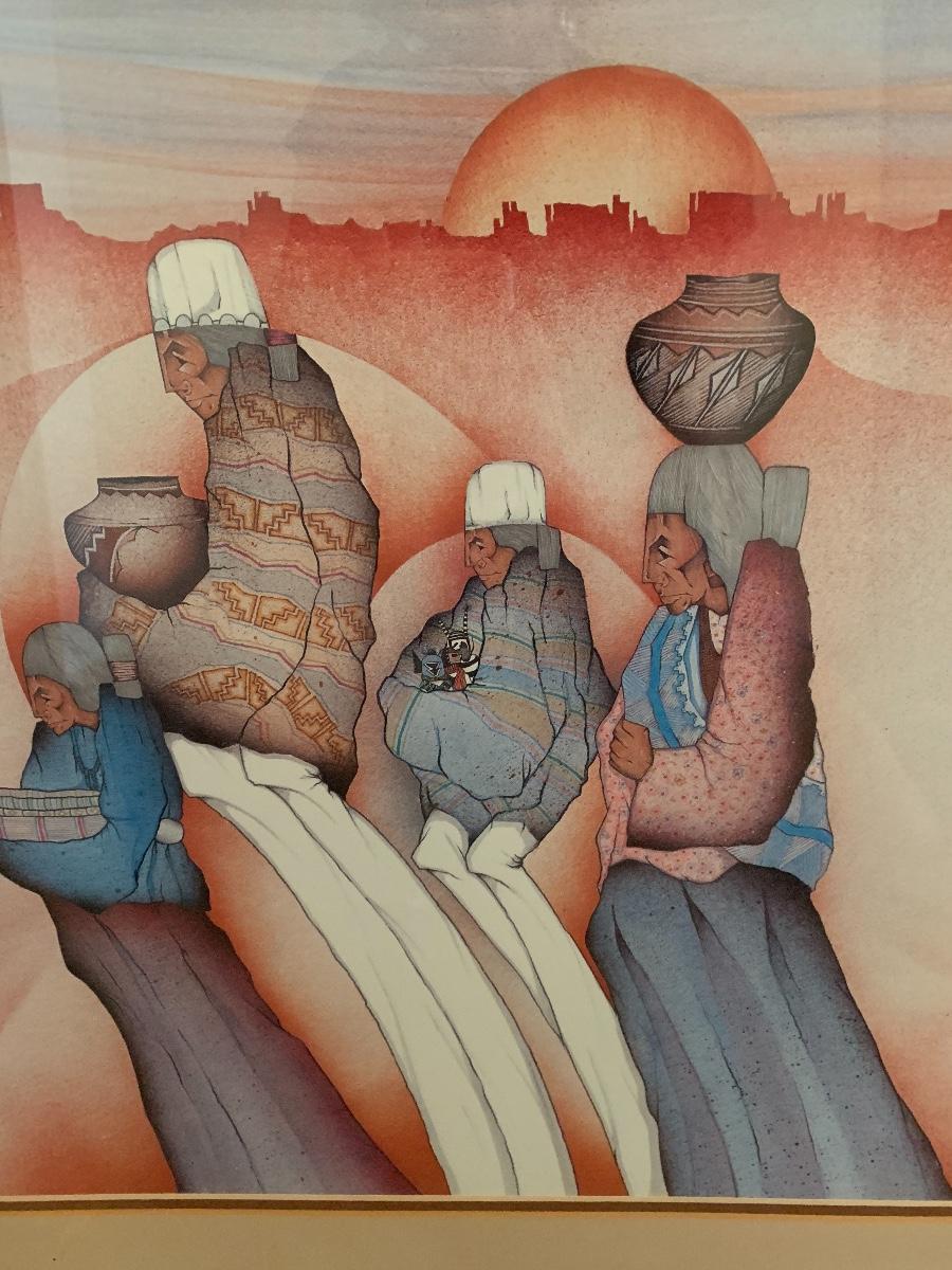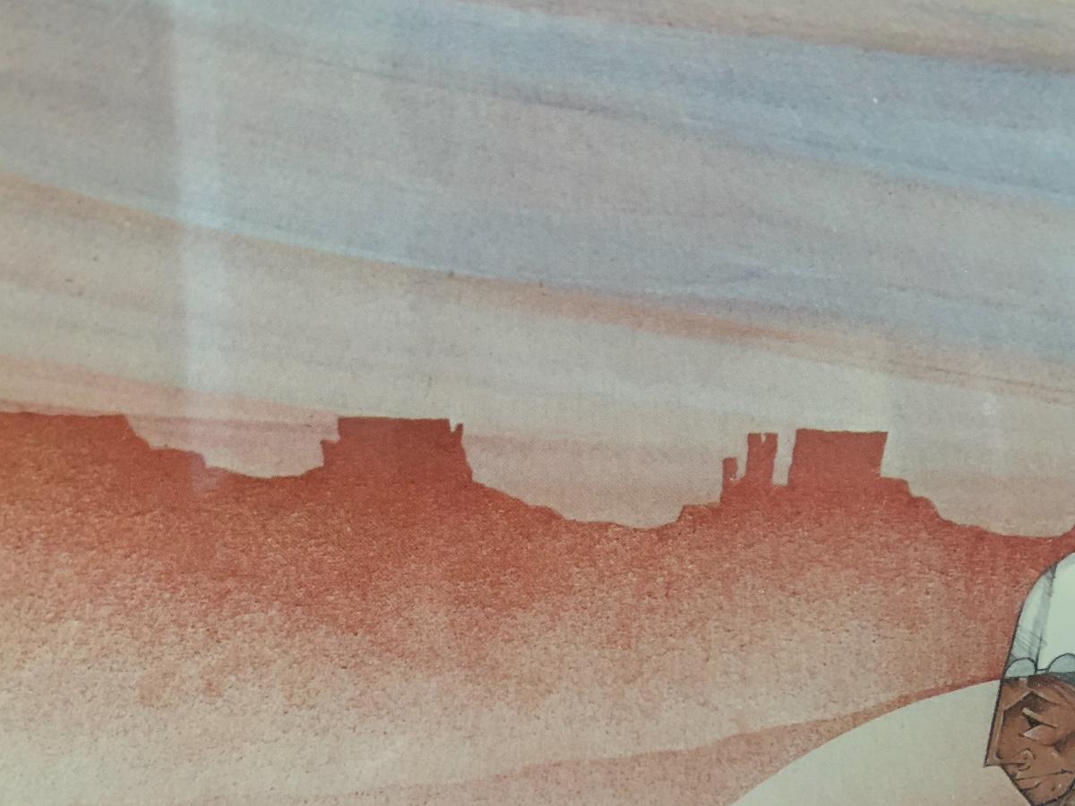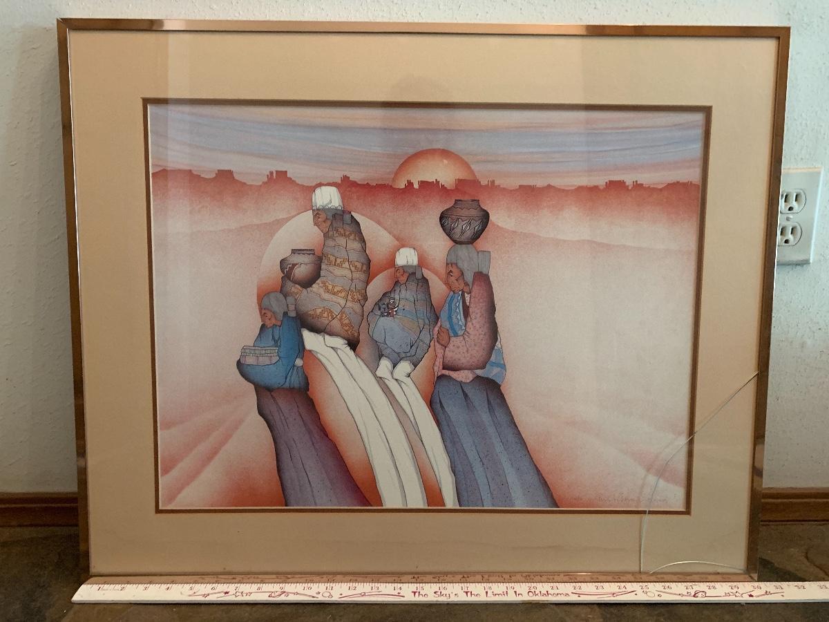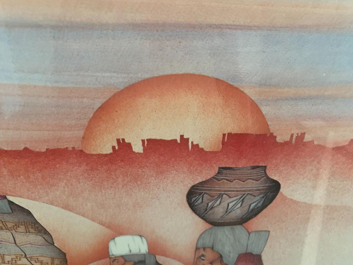 Yes, the glass is cracked, but it did not affect the painting or the matting. Whew! Lovely rendition of a Native American family trekking through the desert. Can't make out the artist name.
