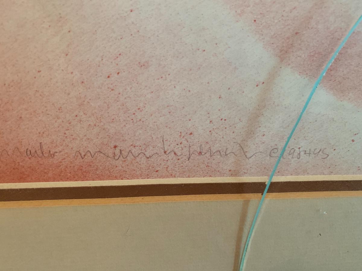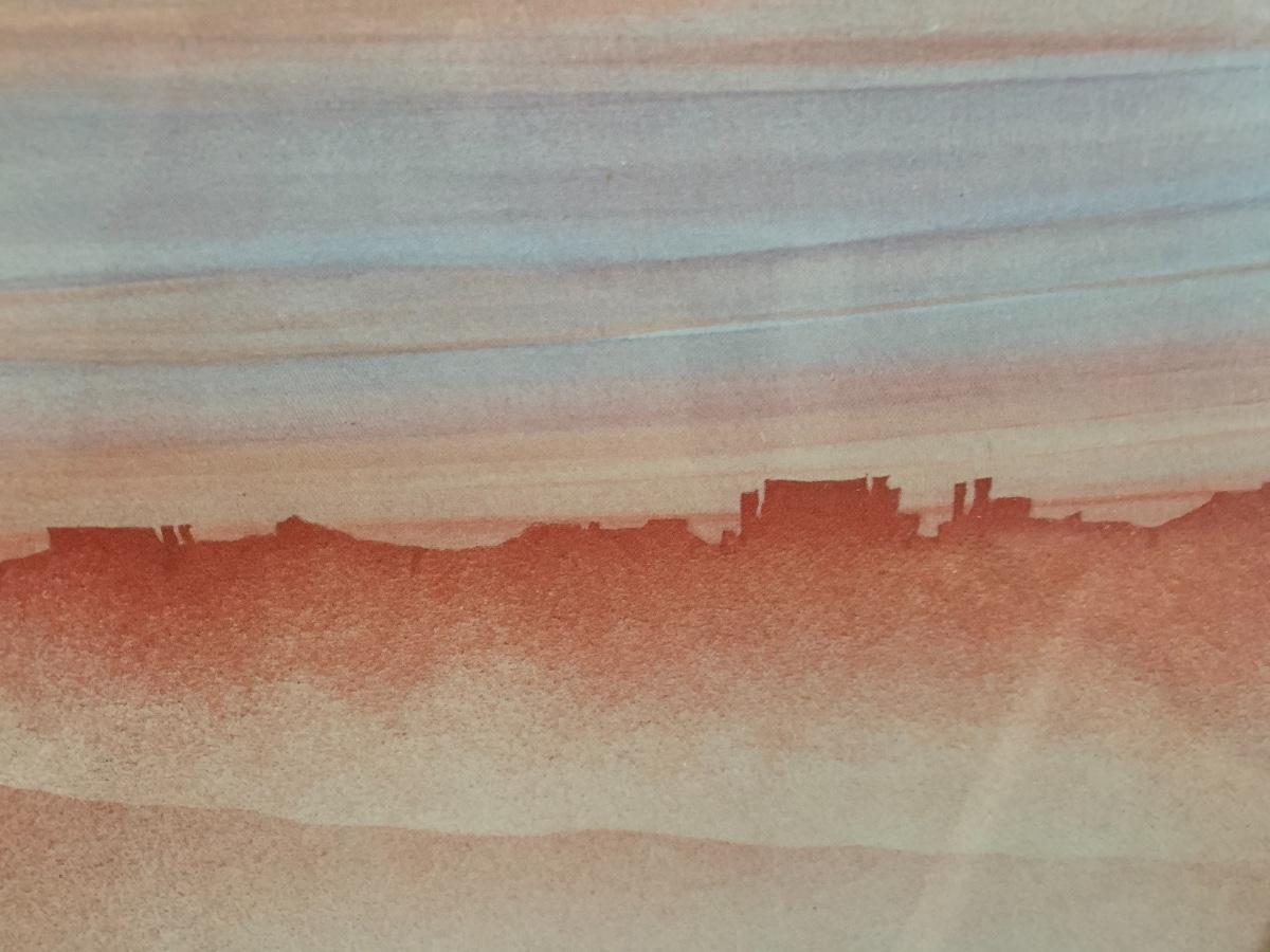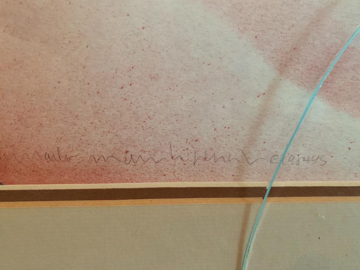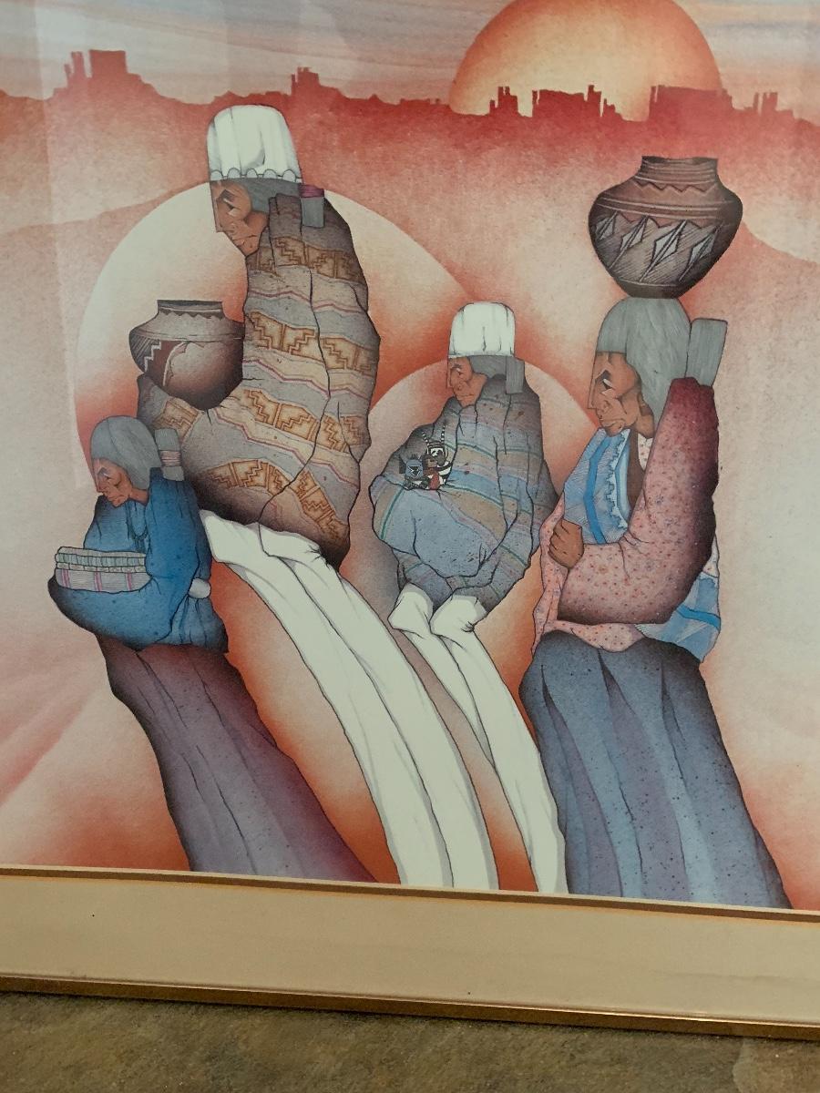 Yes, the glass is cracked, but it did not affect the painting or the matting. Whew! Lovely rendition of a Native American family trekking through the desert. Can't make out the artist name.