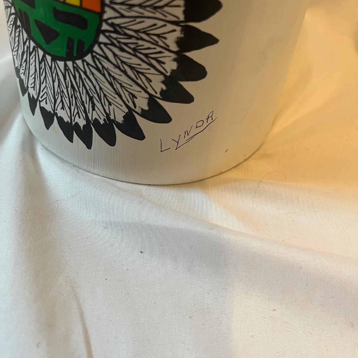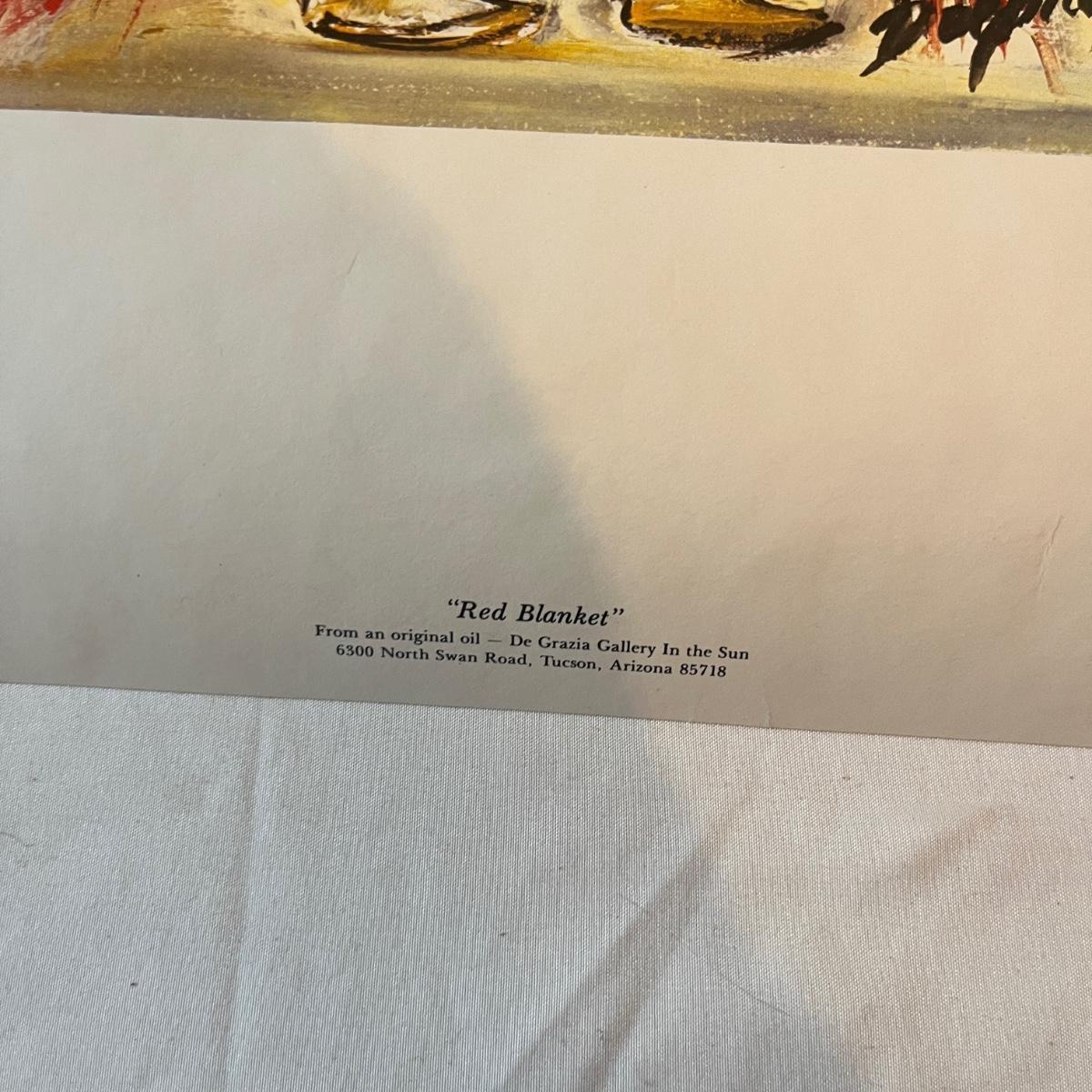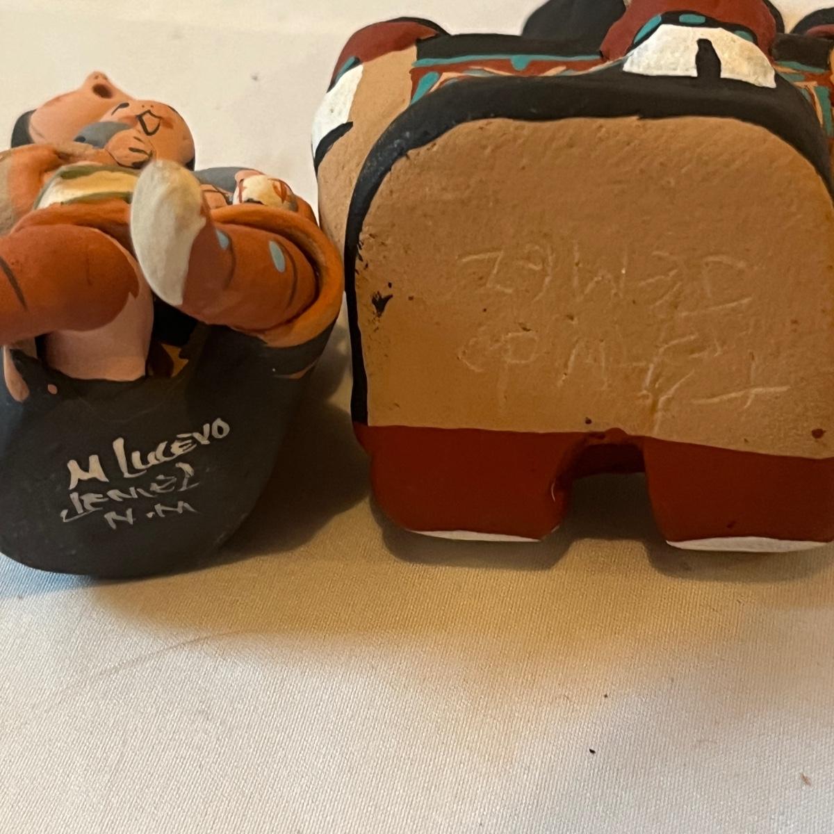 Lot includes a Wooden framed signed painting, two books, ceramic hand made bell, two signed ceramic figurines and a wooden figurine. Also includes three prints titled Red Blanket and three prints titled Feather Dancer. Prints measure 15” x 18”H and bell measures 5”D x 6”H.