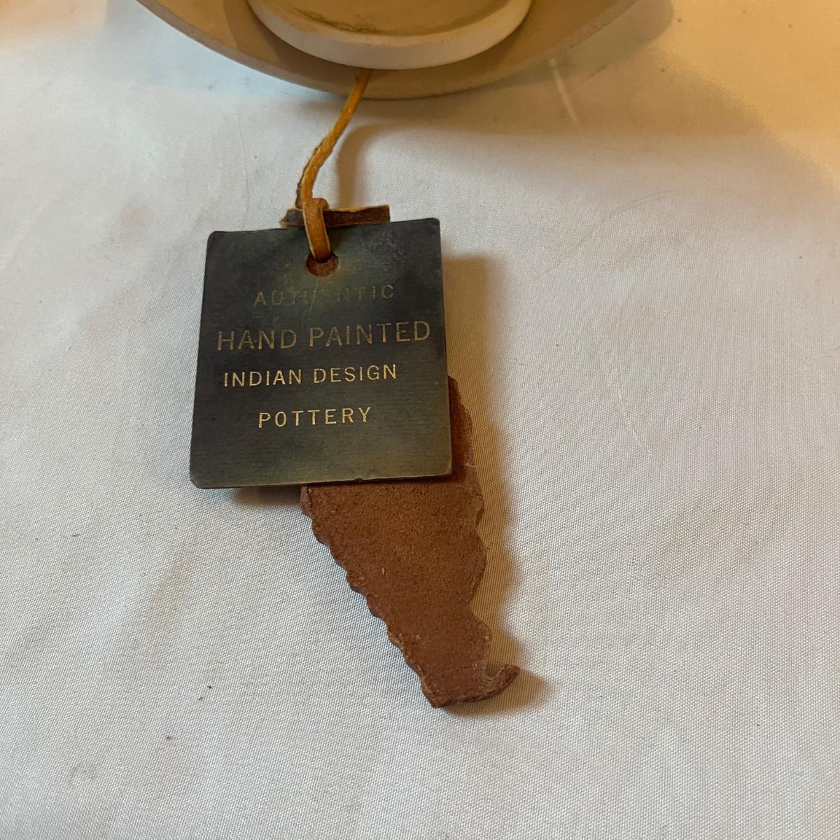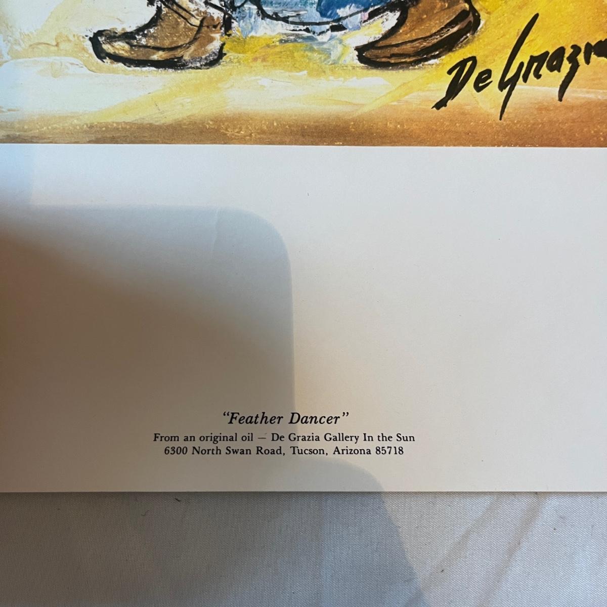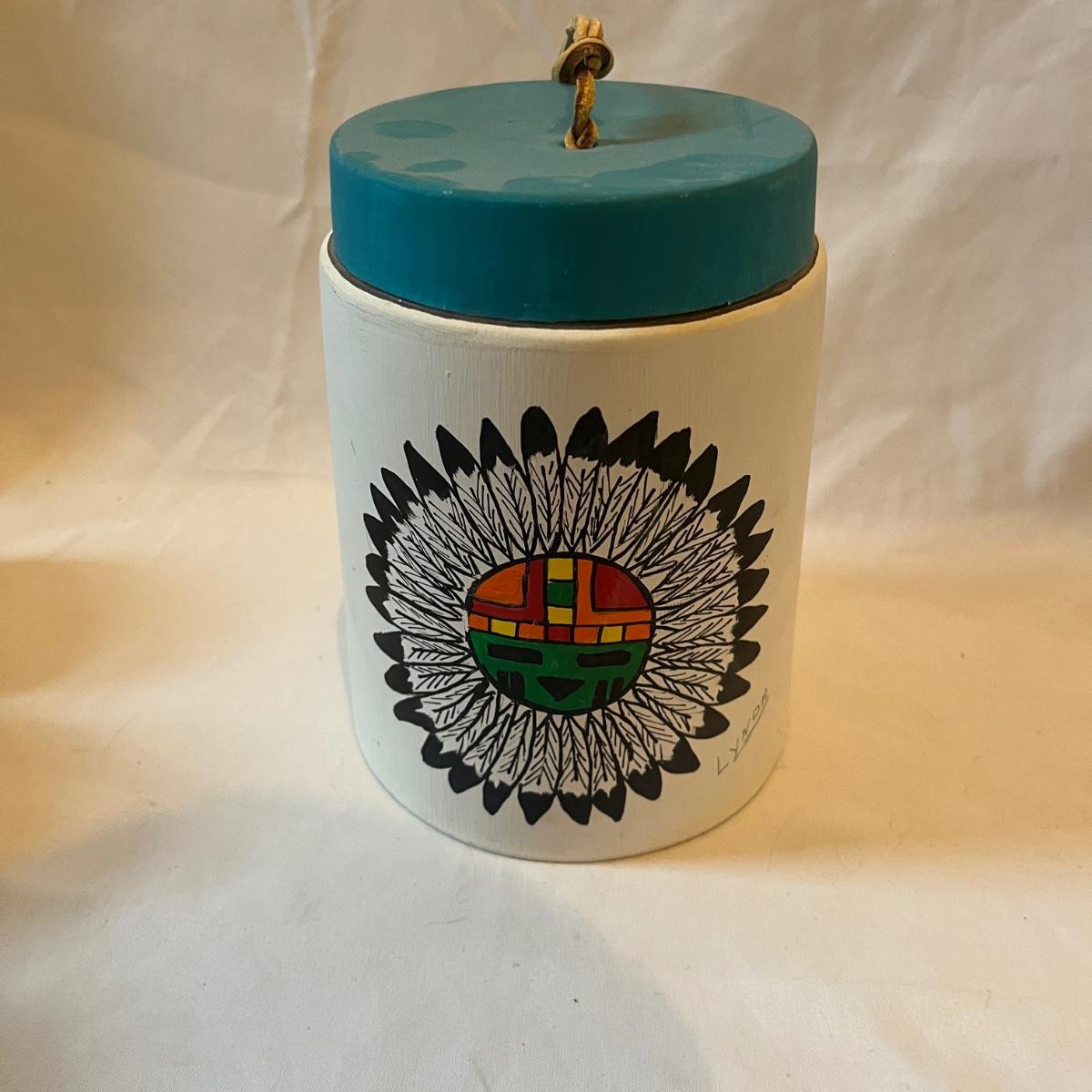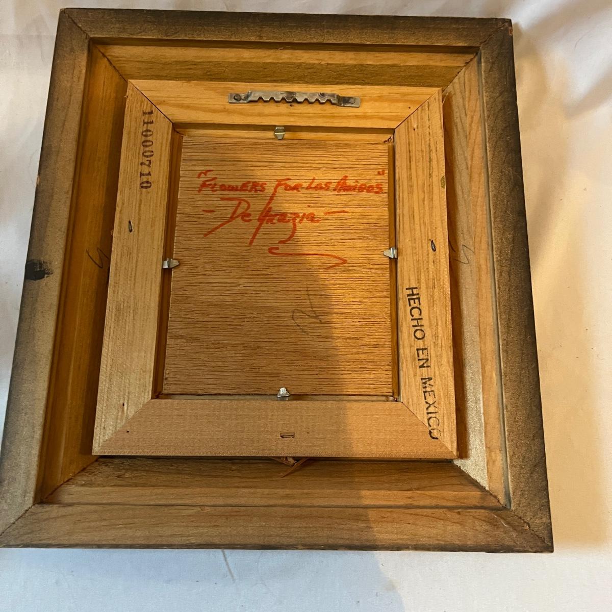 Lot includes a Wooden framed signed painting, two books, ceramic hand made bell, two signed ceramic figurines and a wooden figurine. Also includes three prints titled Red Blanket and three prints titled Feather Dancer. Prints measure 15” x 18”H and bell measures 5”D x 6”H.