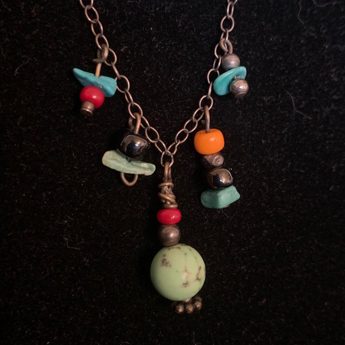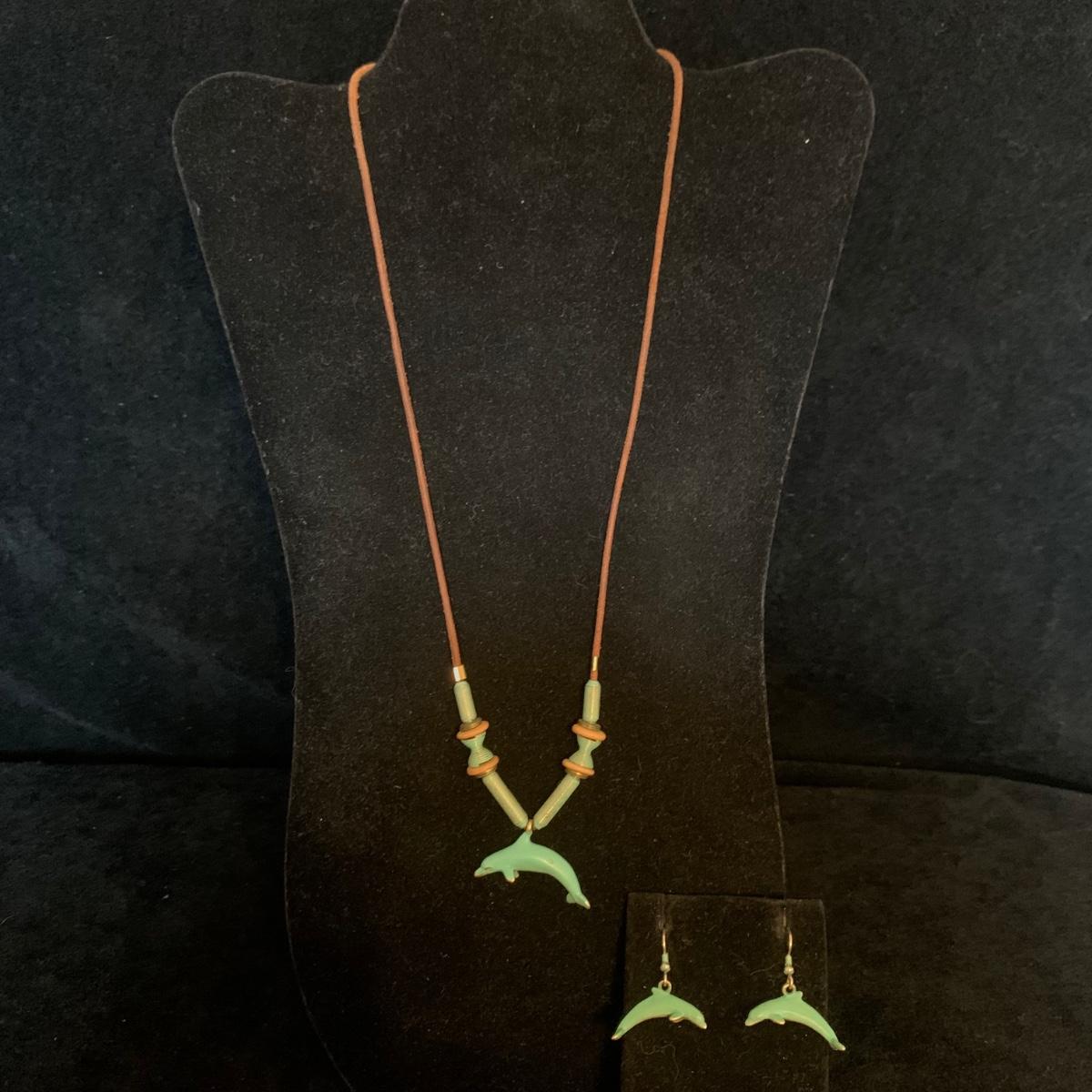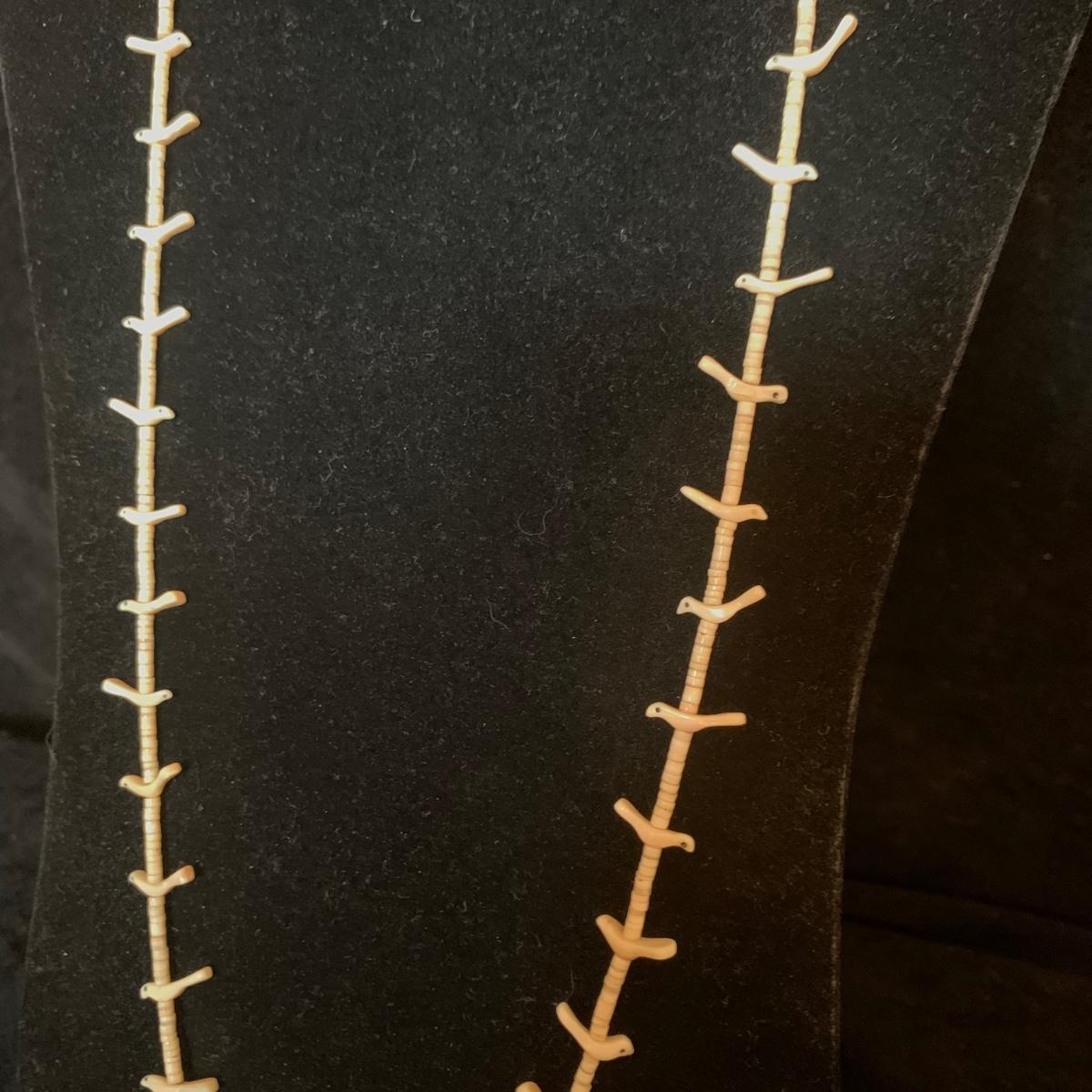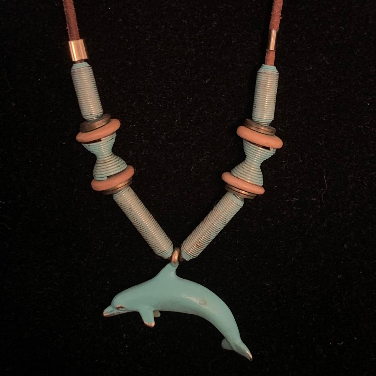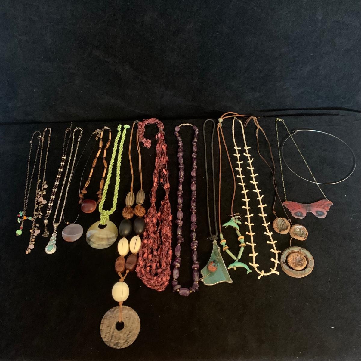 A collection of 15 necklaces plus a couple of loose clay beads. One necklace has a matching pair of earrings. According to the previous owner, the necklace with the metal dolphin pendant, its matching metal earrings, and the white heishi beaded necklace with bird fetishes are Native American made. The necklaces are made from a variety of materials. Most have beads. There is some metal, some leather? And one fabric necklace. Necklaces range from 18”-34”.