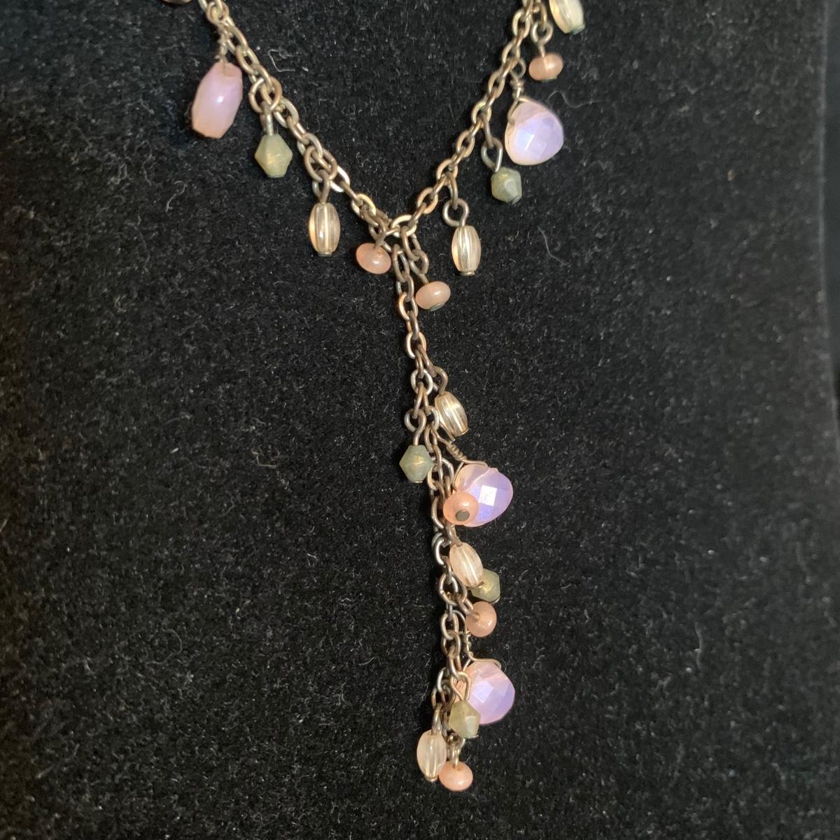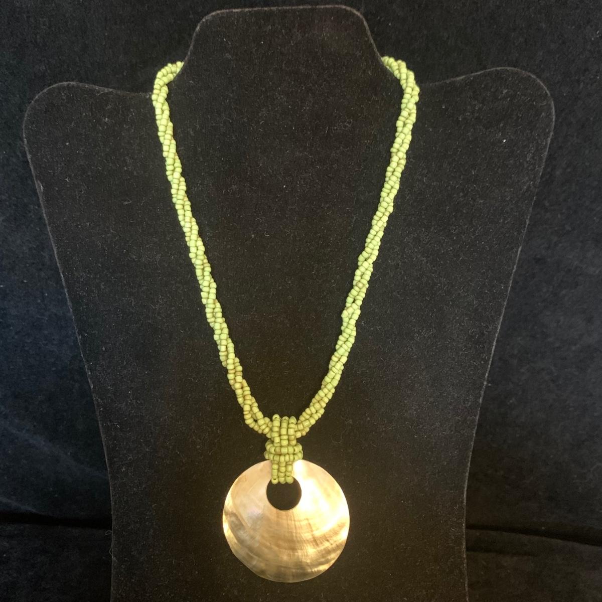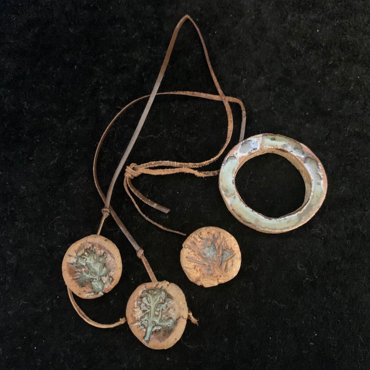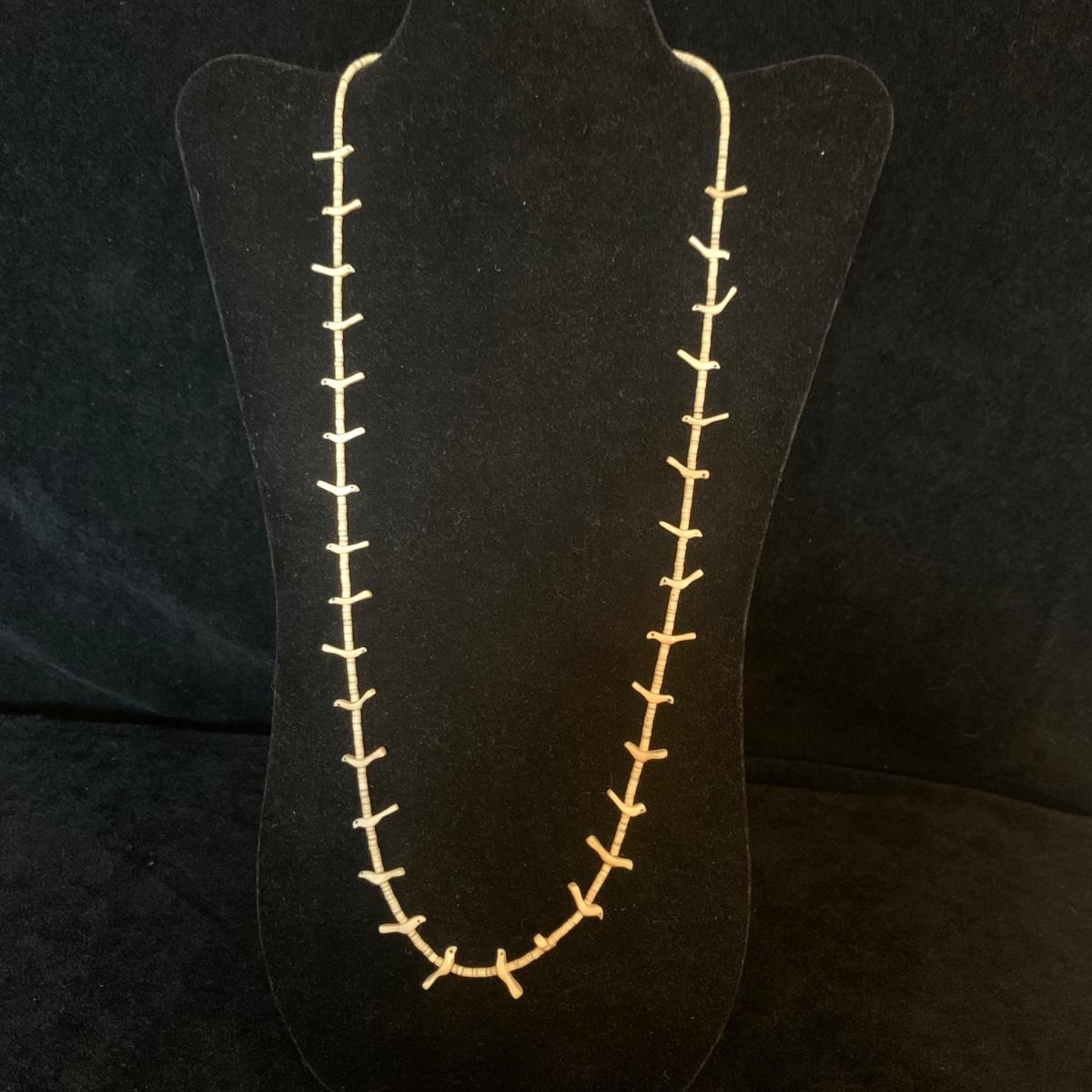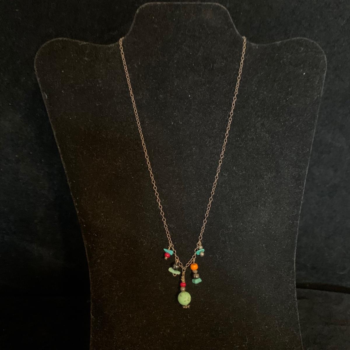 A collection of 15 necklaces plus a couple of loose clay beads. One necklace has a matching pair of earrings. According to the previous owner, the necklace with the metal dolphin pendant, its matching metal earrings, and the white heishi beaded necklace with bird fetishes are Native American made. The necklaces are made from a variety of materials. Most have beads. There is some metal, some leather? And one fabric necklace. Necklaces range from 18”-34”.