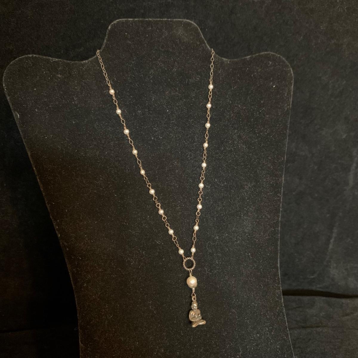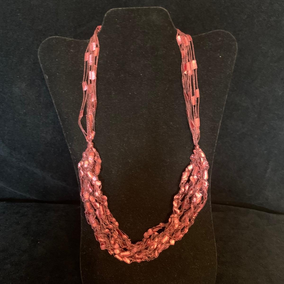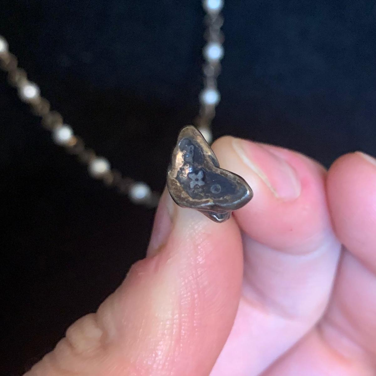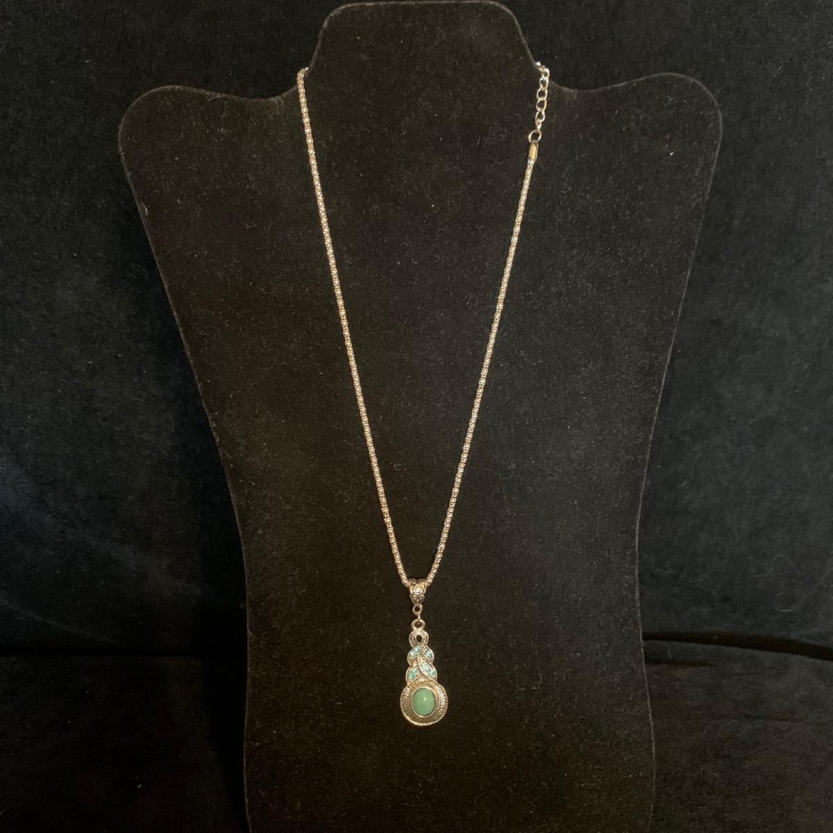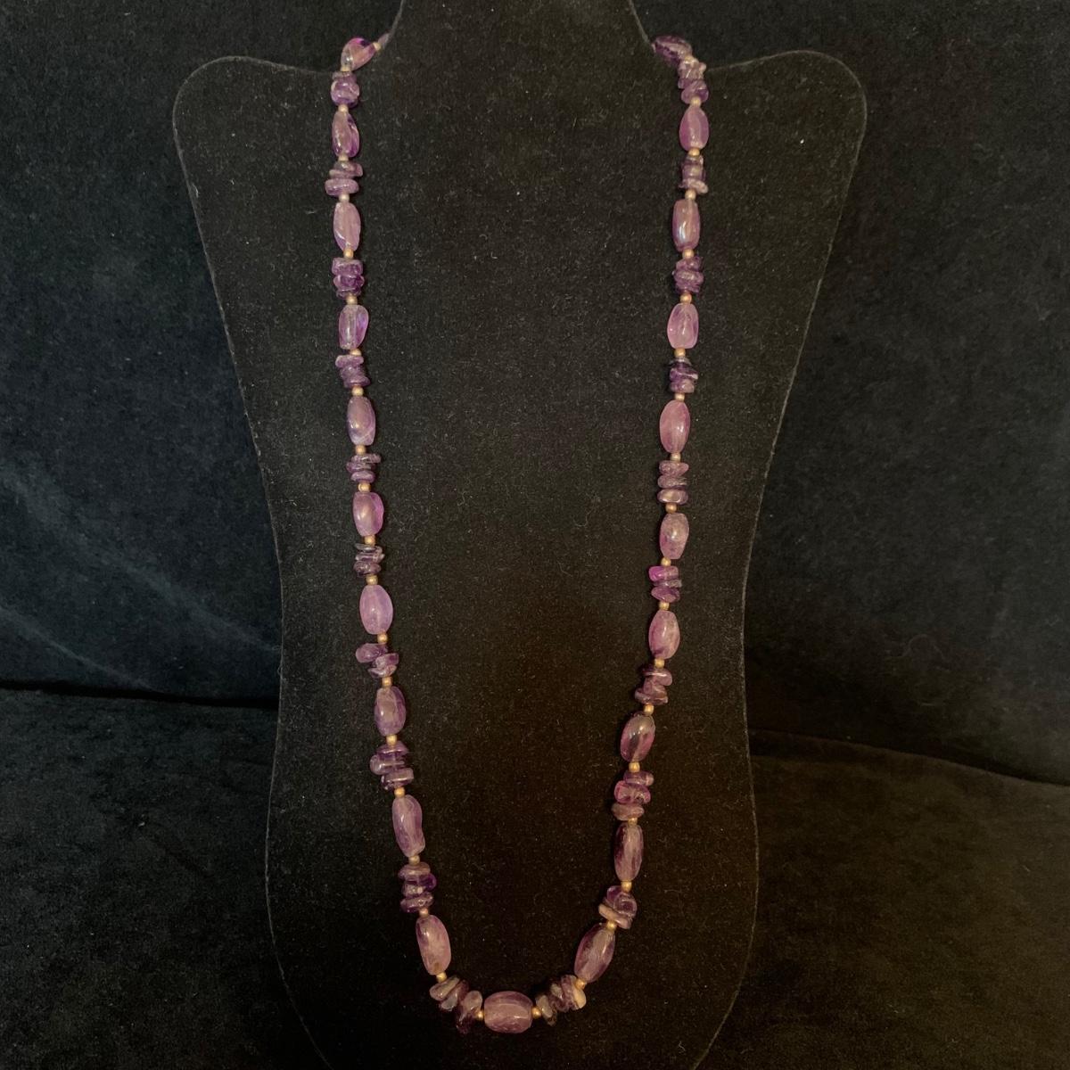 A collection of 15 necklaces plus a couple of loose clay beads. One necklace has a matching pair of earrings. According to the previous owner, the necklace with the metal dolphin pendant, its matching metal earrings, and the white heishi beaded necklace with bird fetishes are Native American made. The necklaces are made from a variety of materials. Most have beads. There is some metal, some leather? And one fabric necklace. Necklaces range from 18”-34”.
