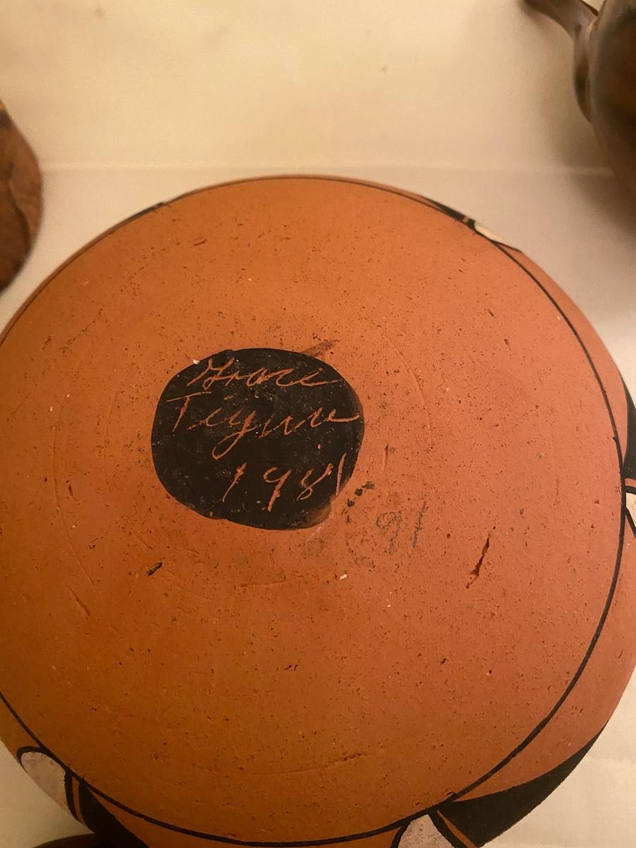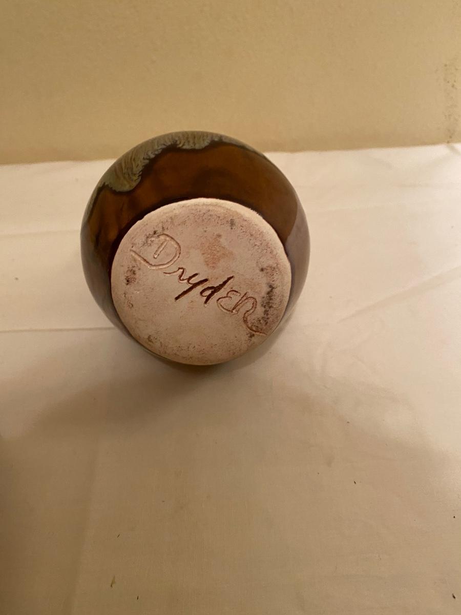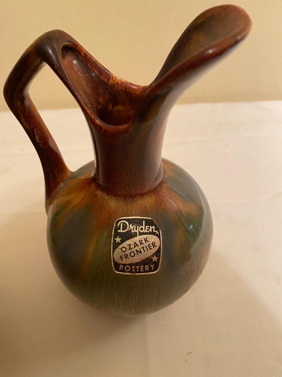 Native American collectibles lot Small Dryden Ozark Frontier Pottery vase 6-1/2h; signed pottery bowl 7w; faux wood candle holder and painted rock