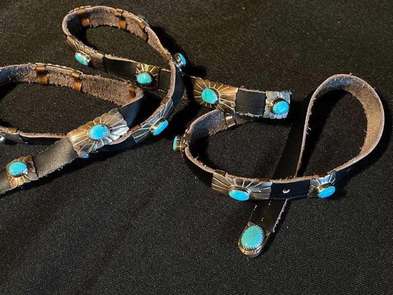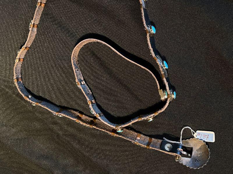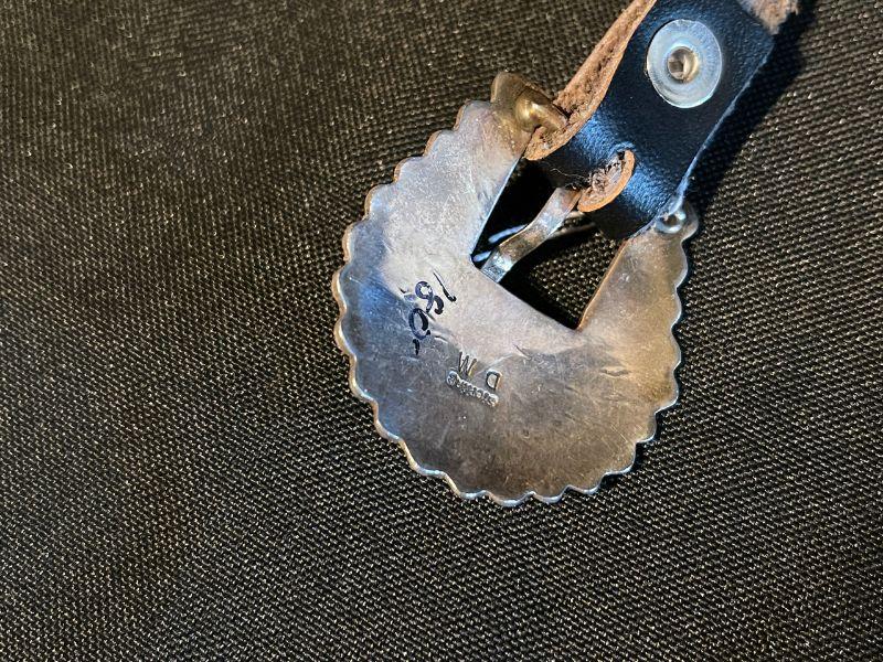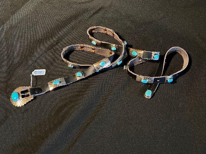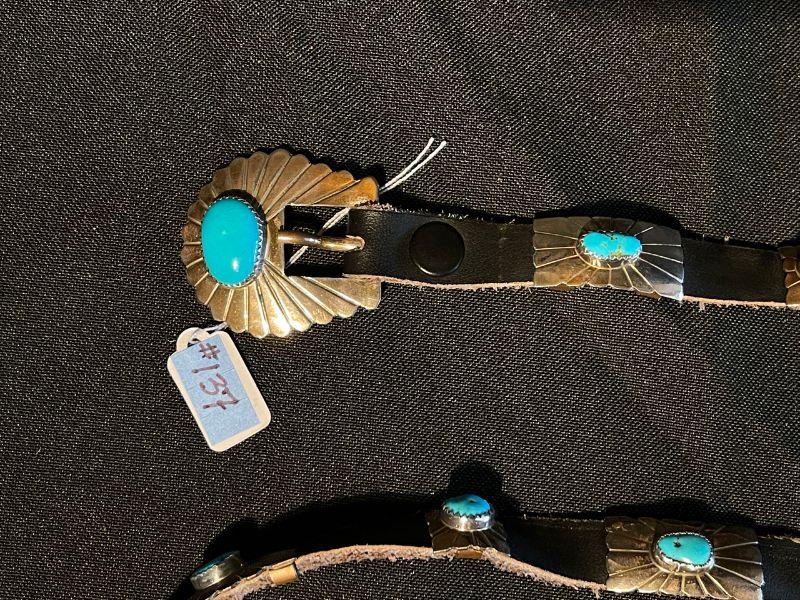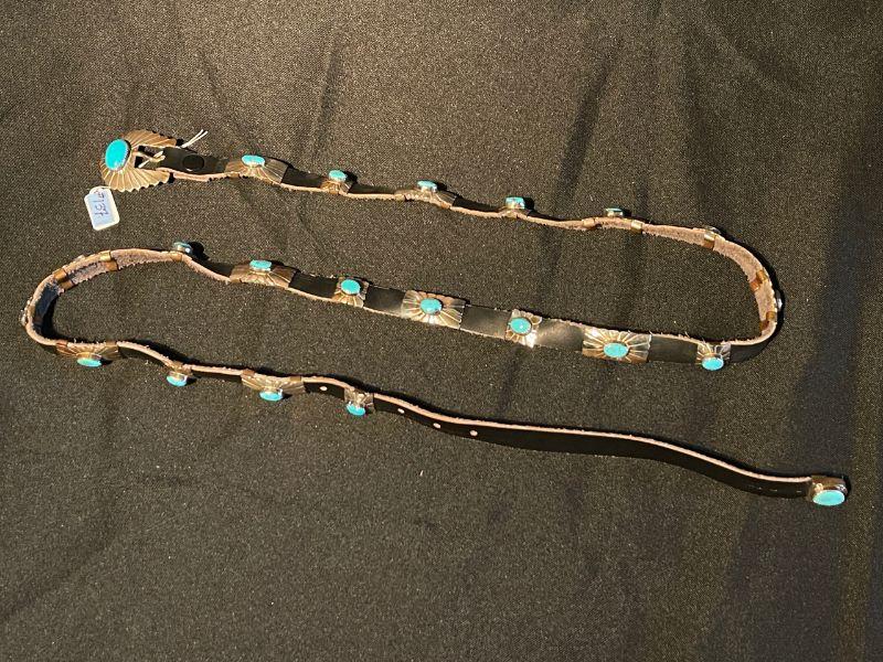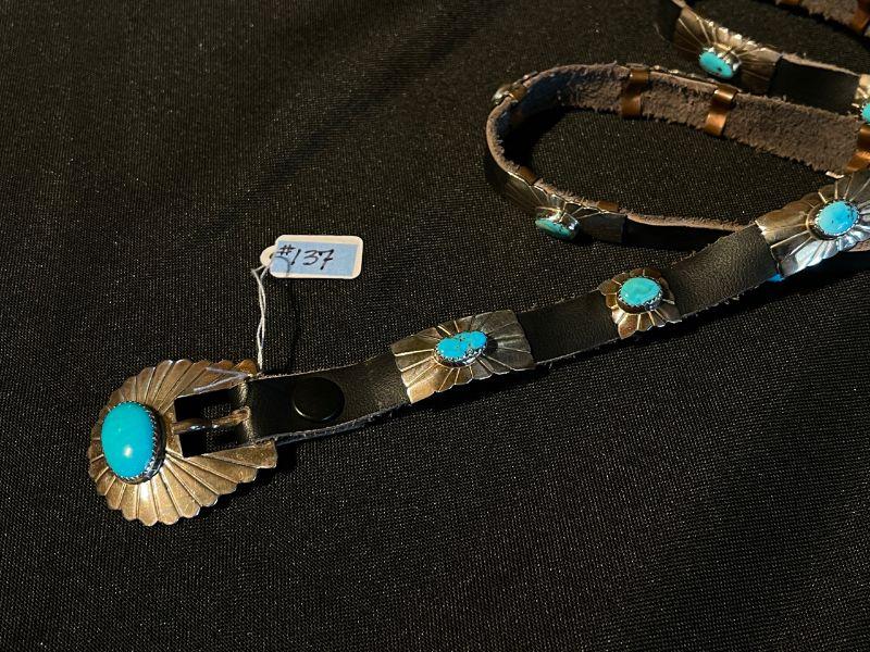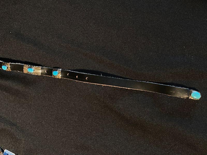 This hand-crafted belt, stamp-signed D.M. Is crafted of solid sterling silver. The buckle, 20 concho (including spacers), and the belt tip are all set with bright blue turquoise stones, and are strung on a 1/2” wide black leather belt. Very little, if any wear is noted.