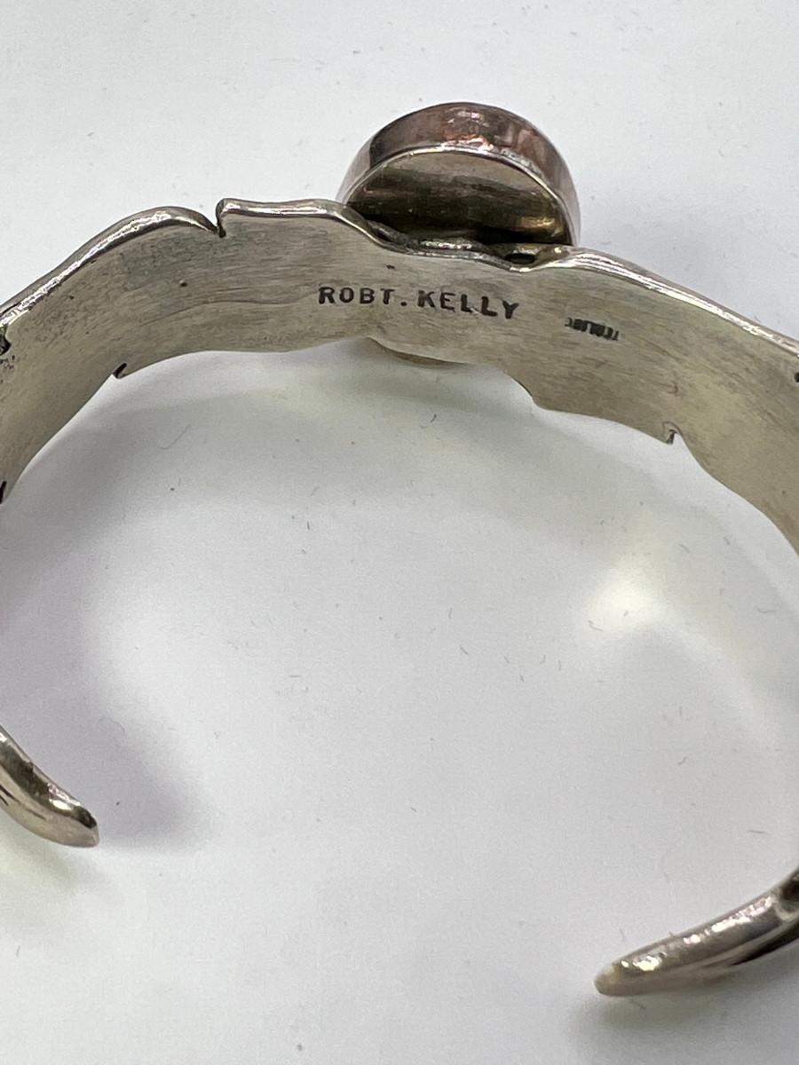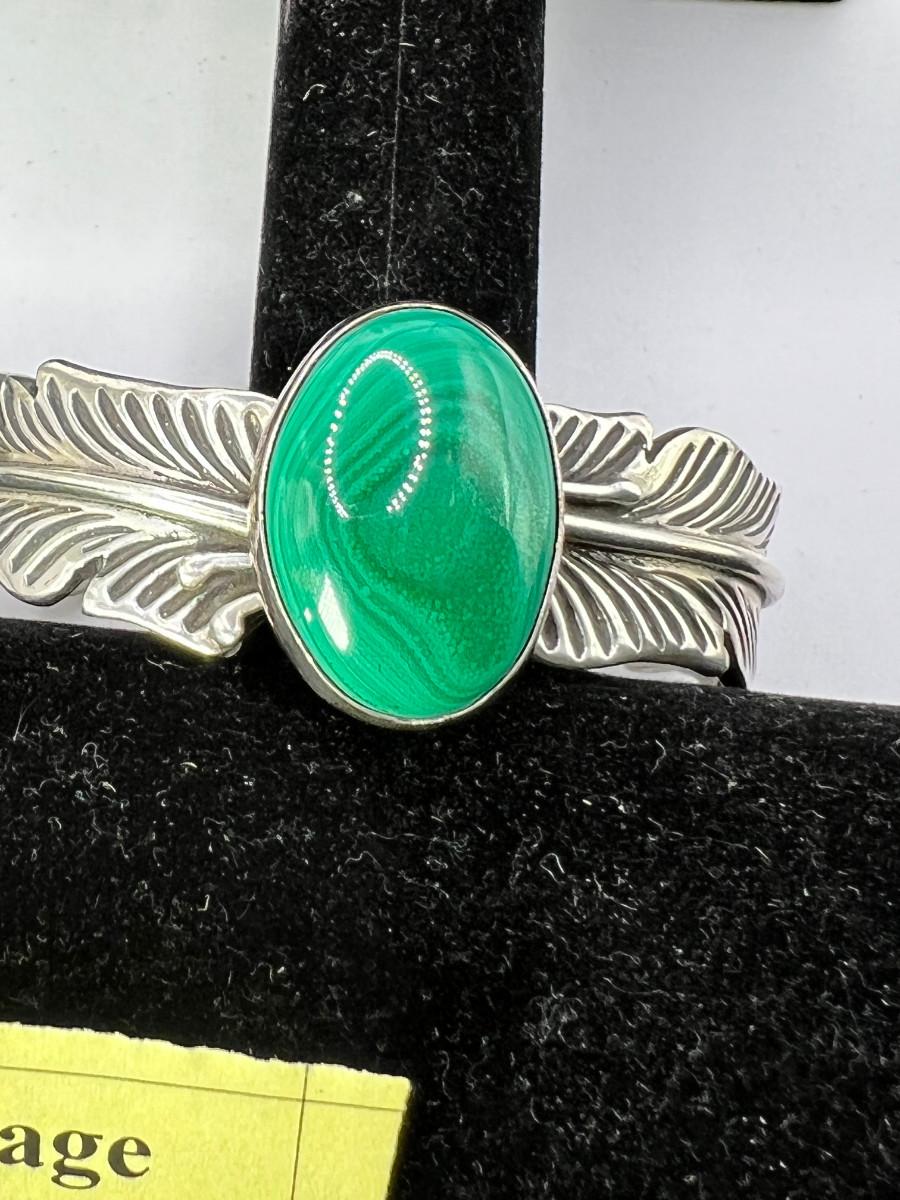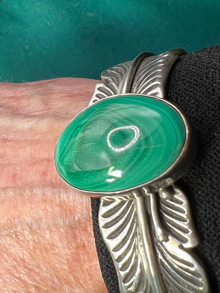 Native American hallmark Robert Kelly Sterling cuff bracelet with malachite stone