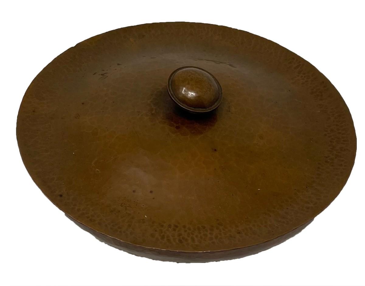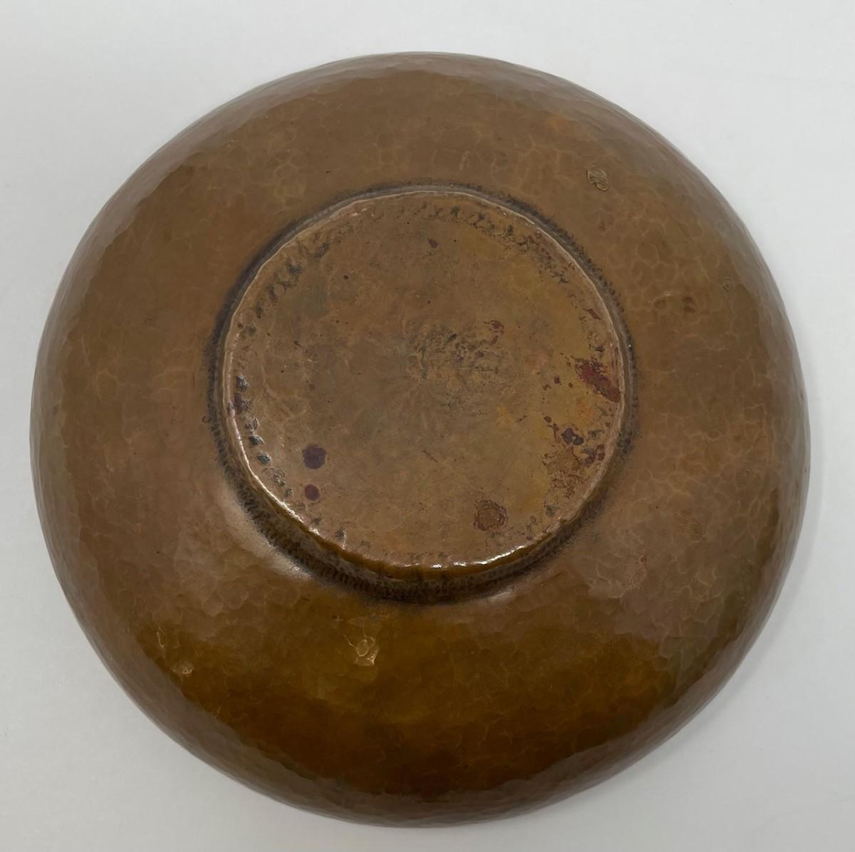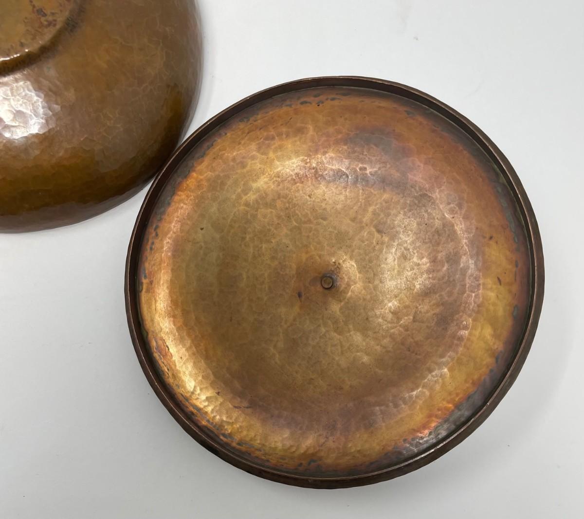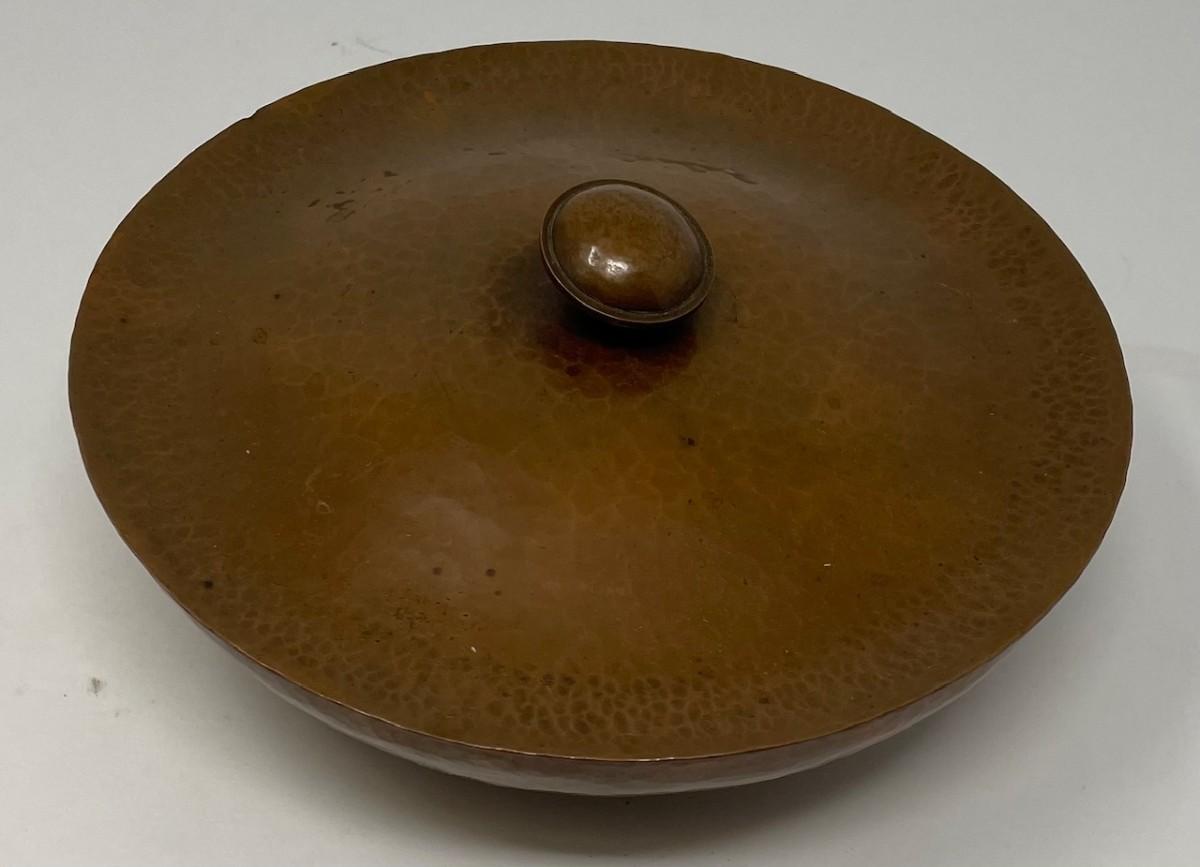 Description: Native American Hammered Copper Bowl / Lid. Design in the middle of the dish; Material: Copper; Measurement approximate: 2.5 h x 7 w (Inches)