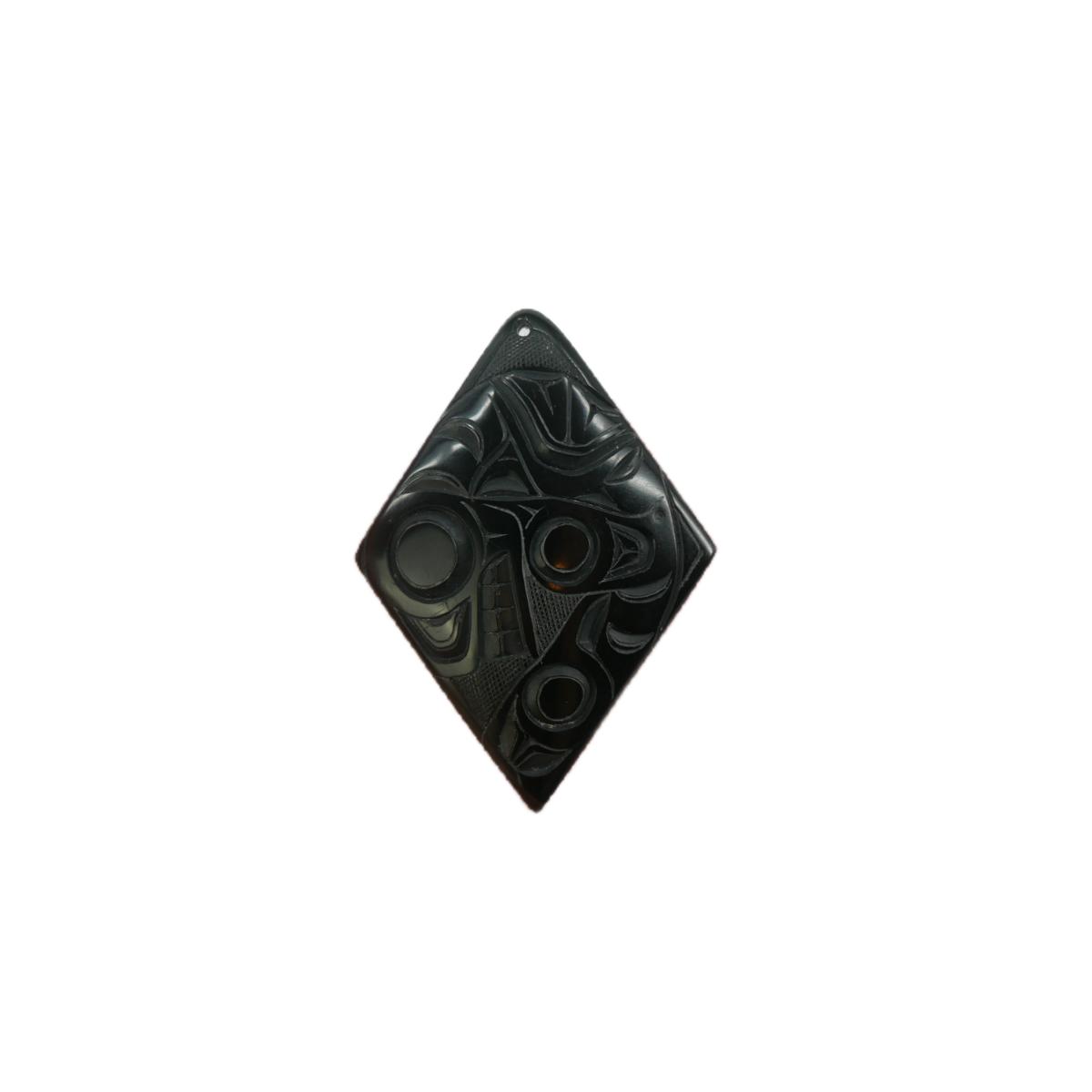 Native American hand-carved diamond shaped stone pendant art piece. Intricate and beautiful etchings, signed by artist "RAD King" on back. Measures approximately L 2" x W 2.75" and weighs 31g. Has a hole to attach a necklace. Wonderful craftsmanship! Excellent condition. (J15)