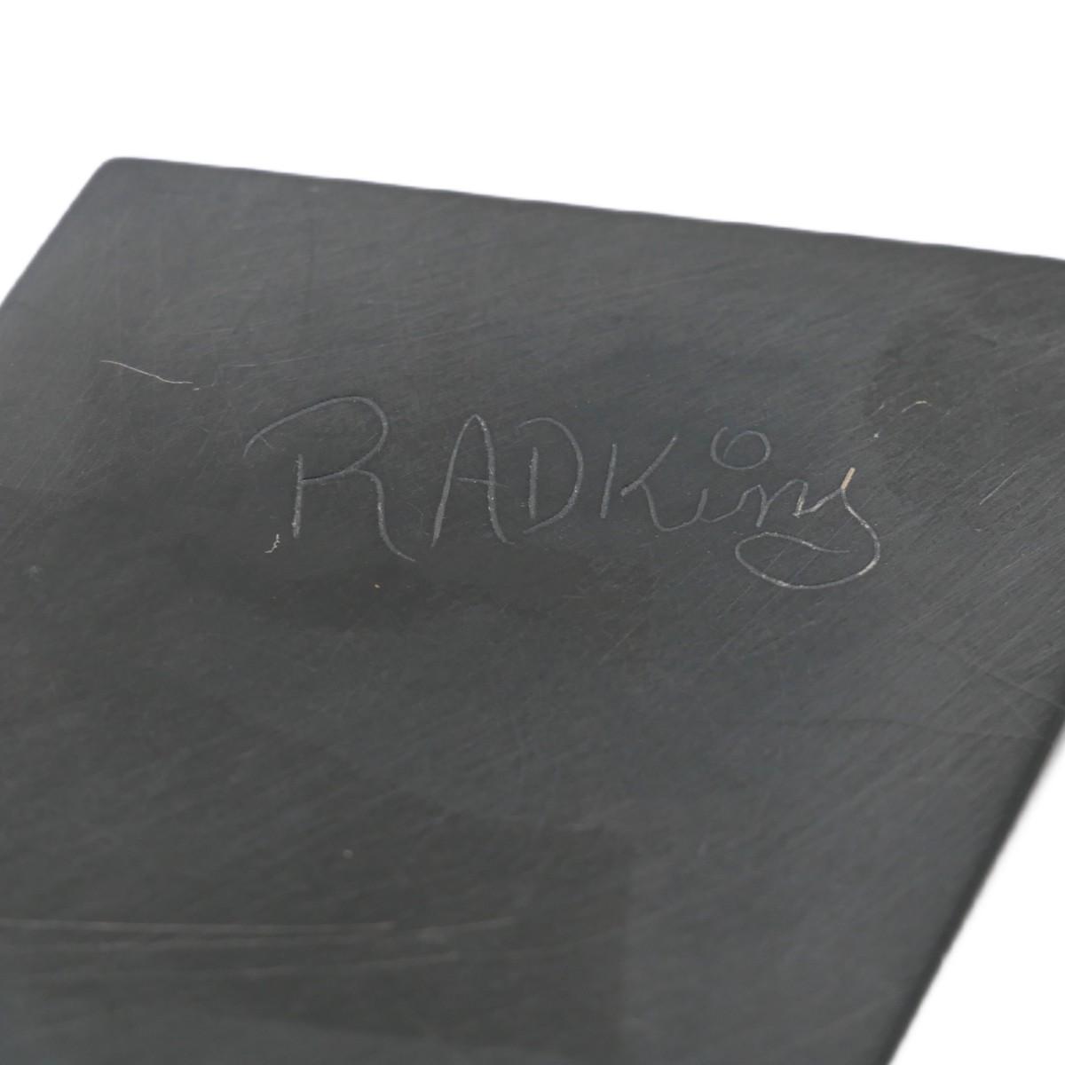 Native American hand-carved diamond shaped stone pendant art piece. Intricate and beautiful etchings, signed by artist "RAD King" on back. Measures approximately L 2" x W 2.75" and weighs 31g. Has a hole to attach a necklace. Wonderful craftsmanship! Excellent condition. (J15)