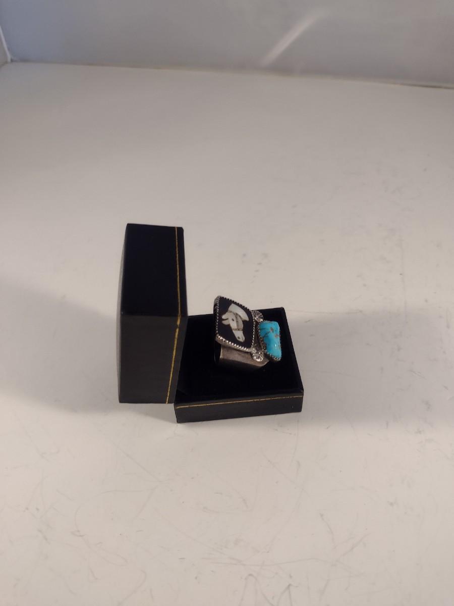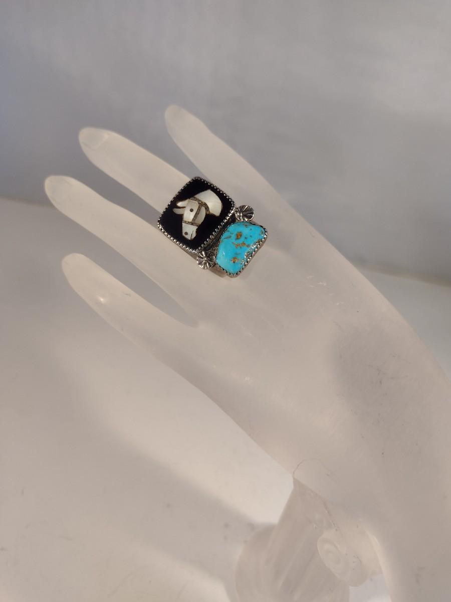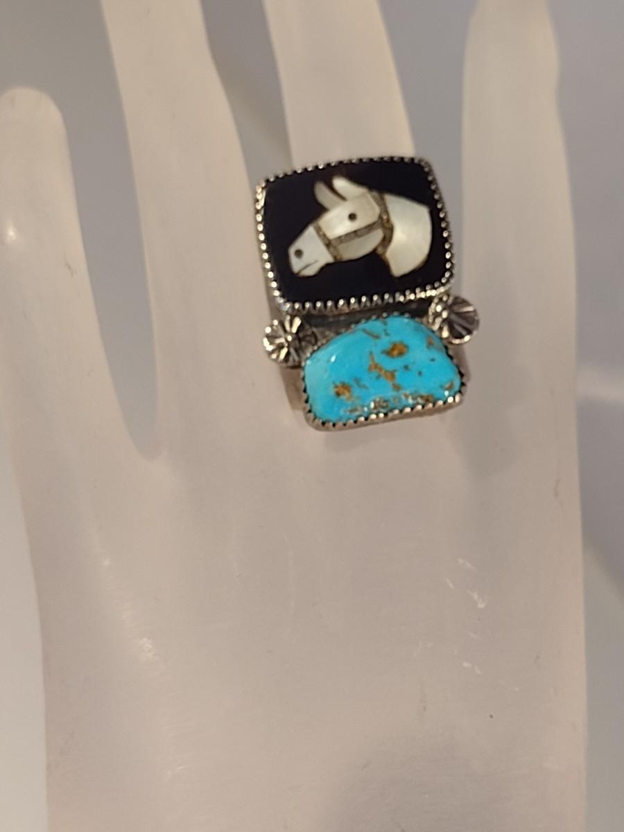 Native American Hand-Crafted Zuni Ring Mother of Pearl Horse Set in Onyx Base with Turquoise Stone (#5)
