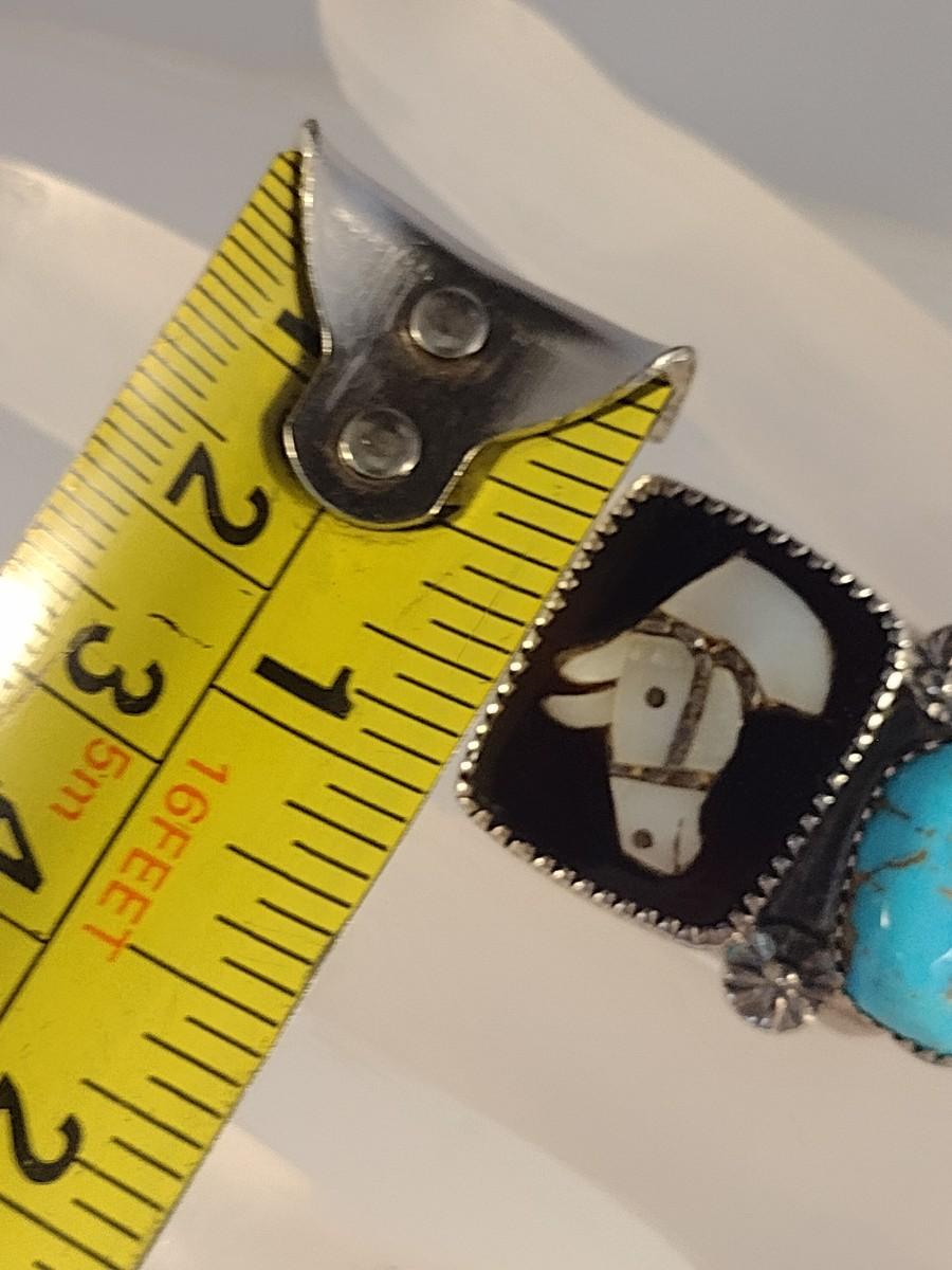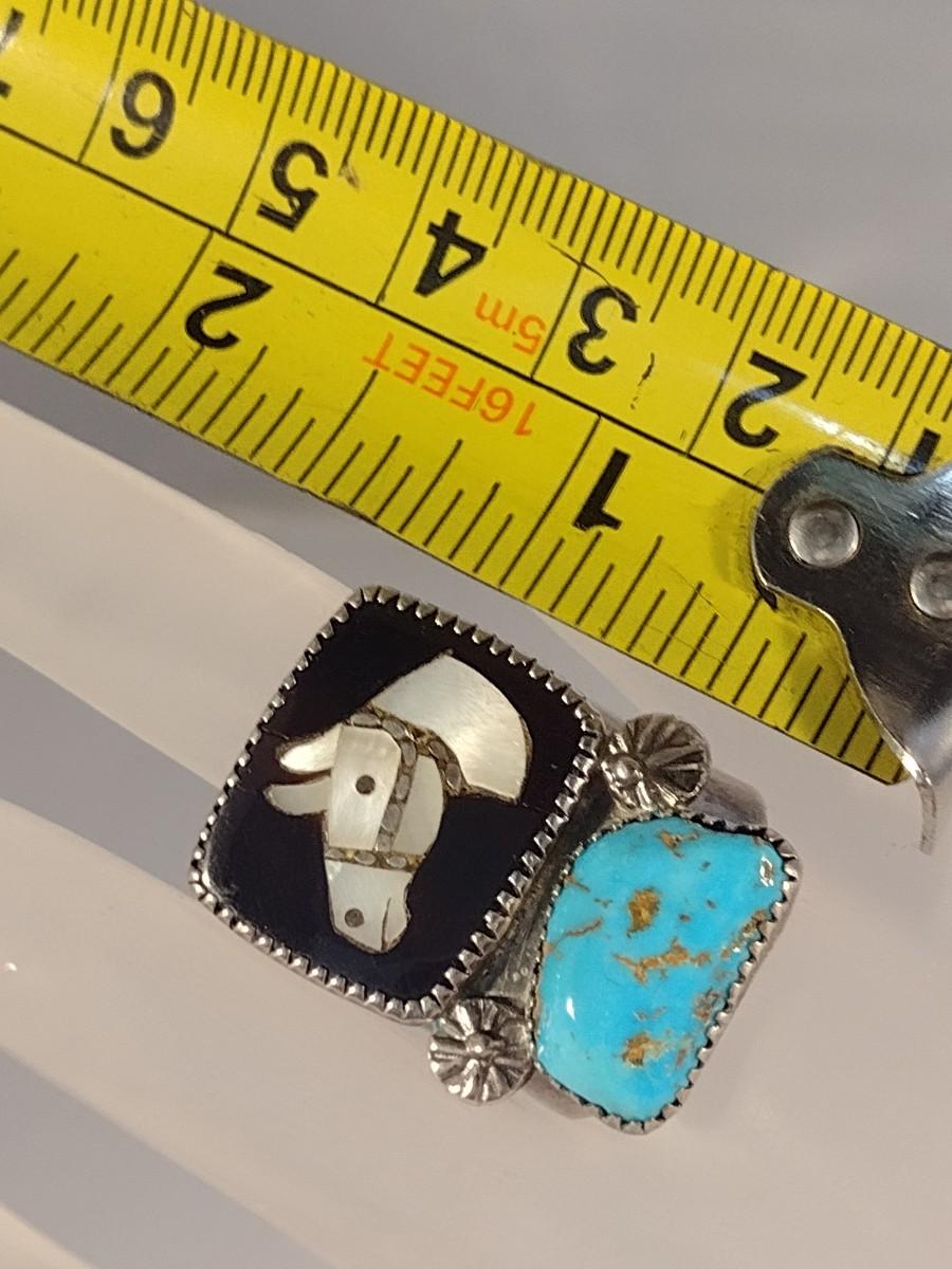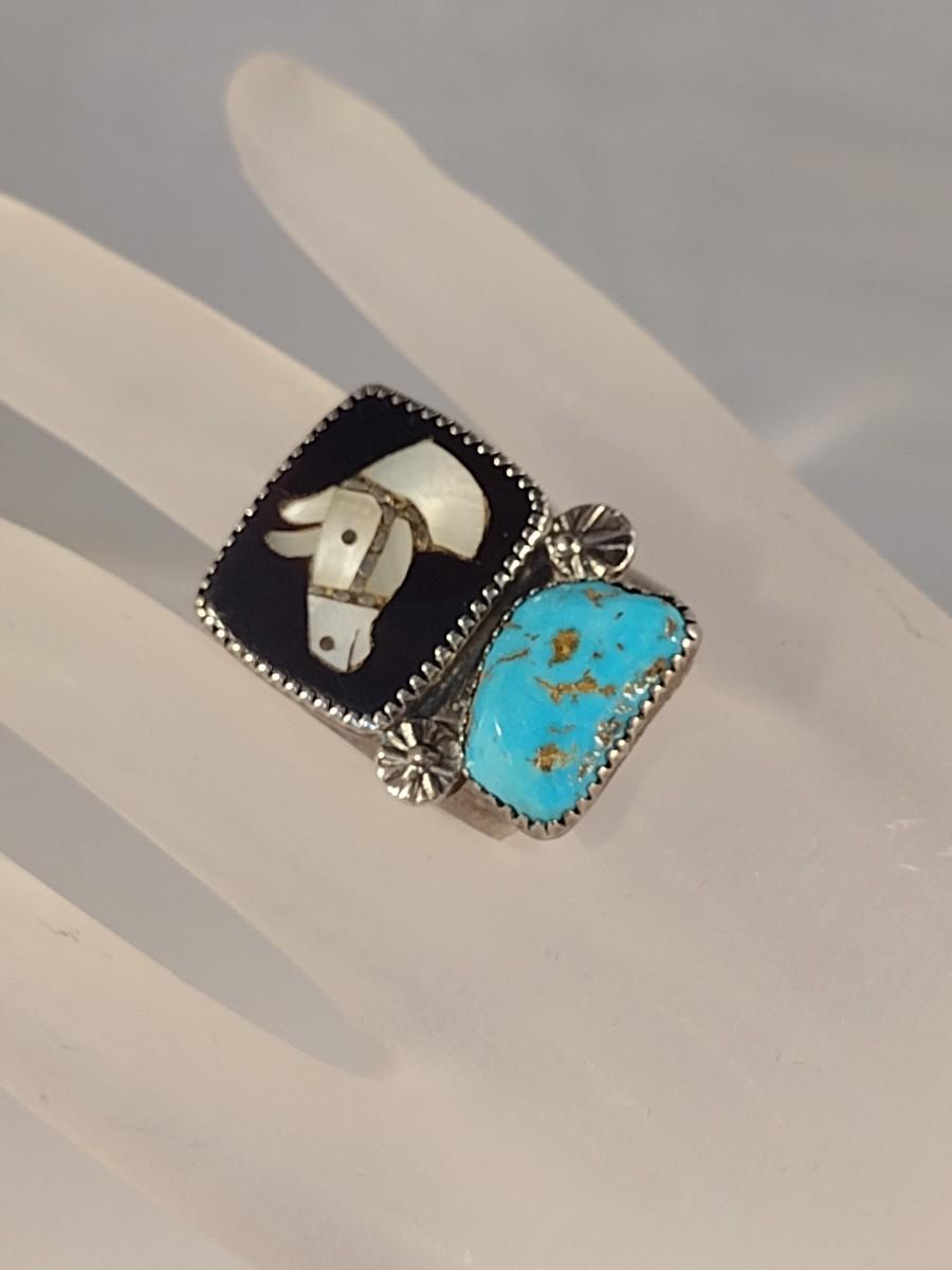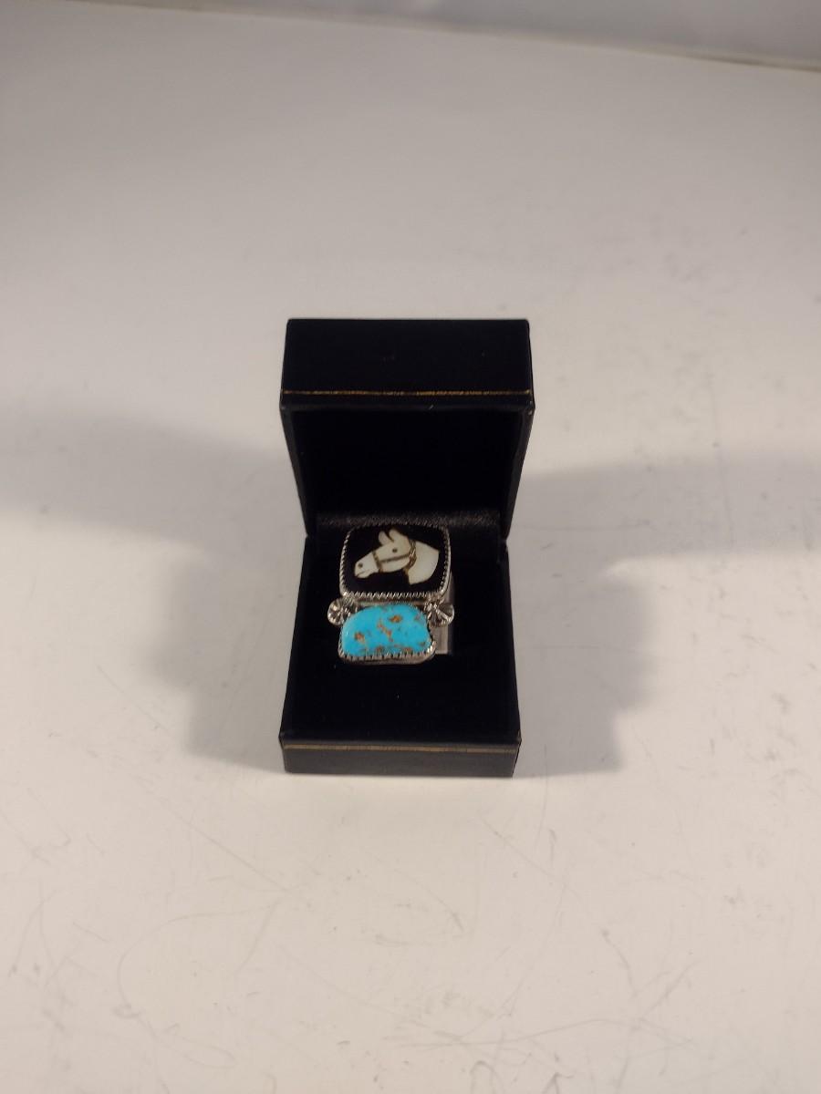 Native American Hand-Crafted Zuni Ring Mother of Pearl Horse Set in Onyx Base with Turquoise Stone (#5)