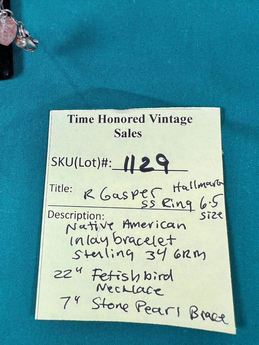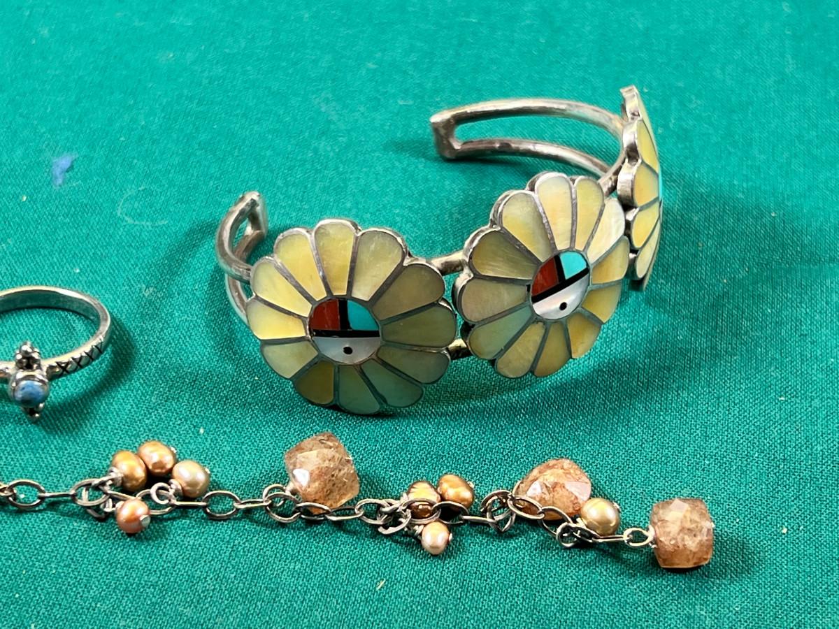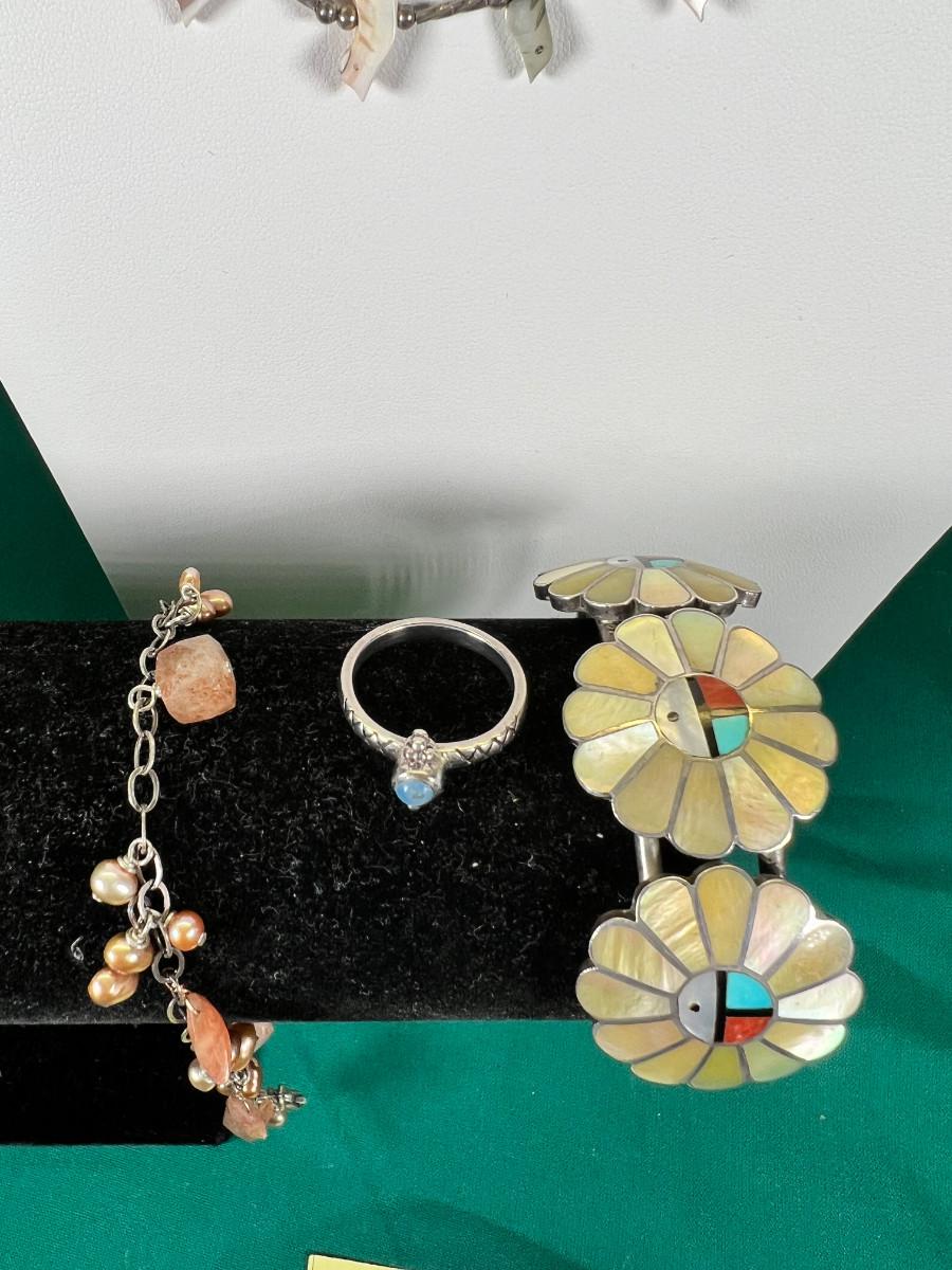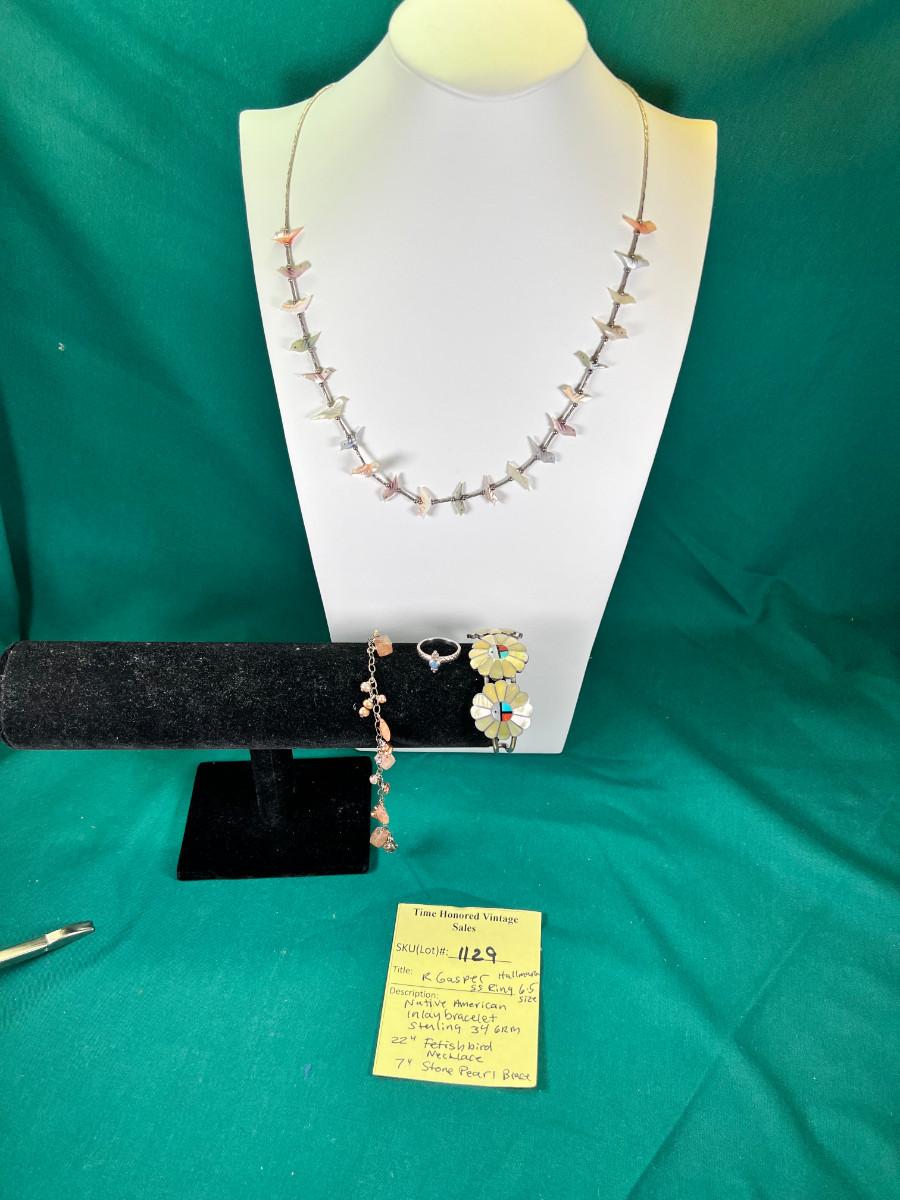 American Inlaid sterling bracelet, 22" fetish necklace, 7" stone and pearl bracelet, 22 ring 6.5