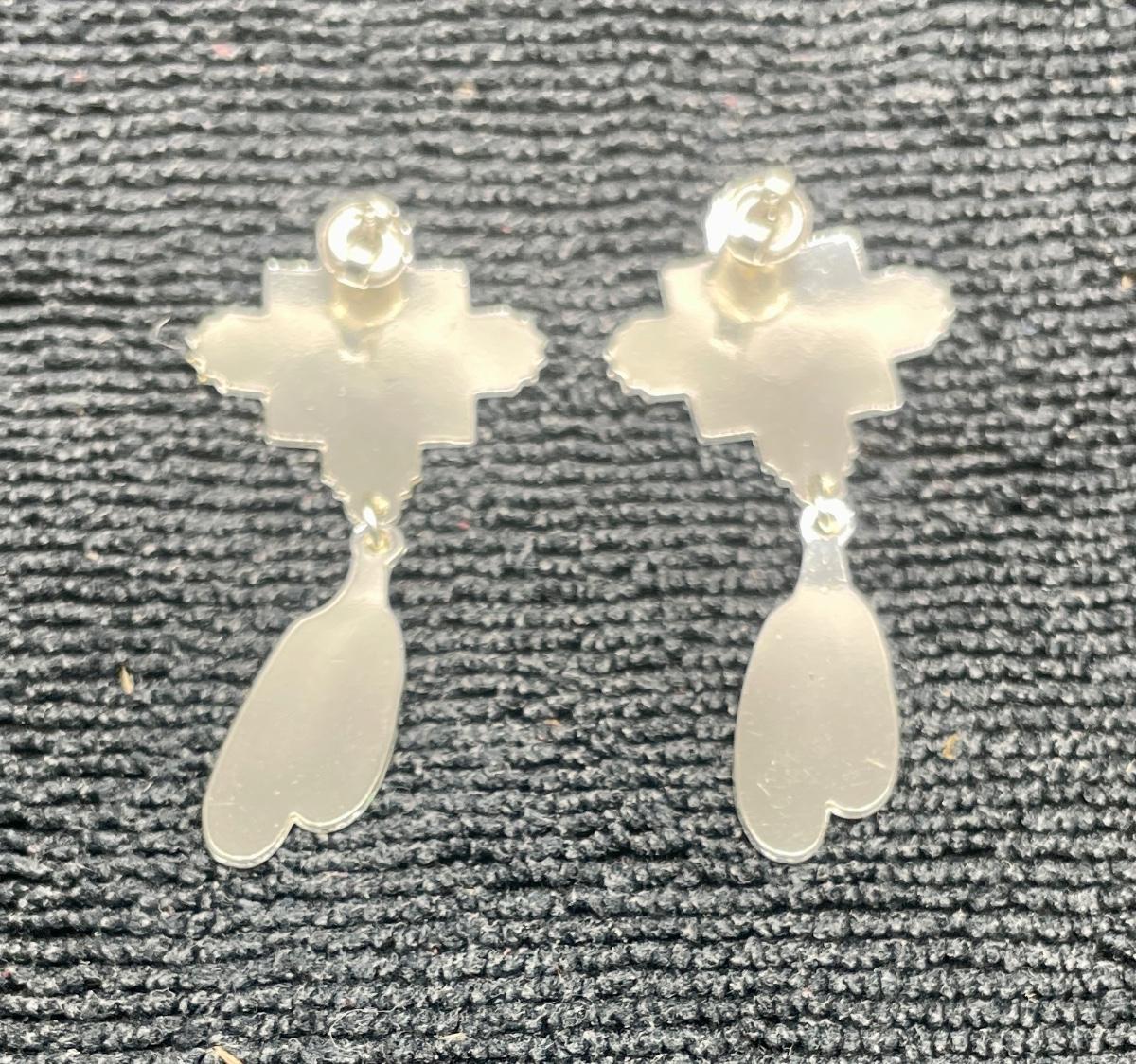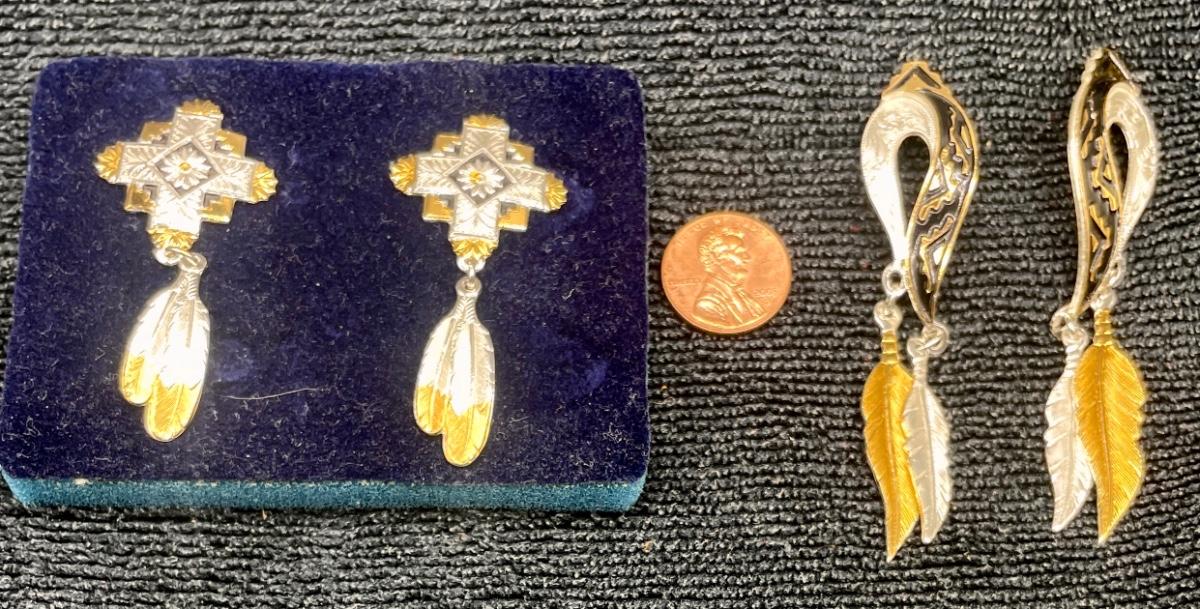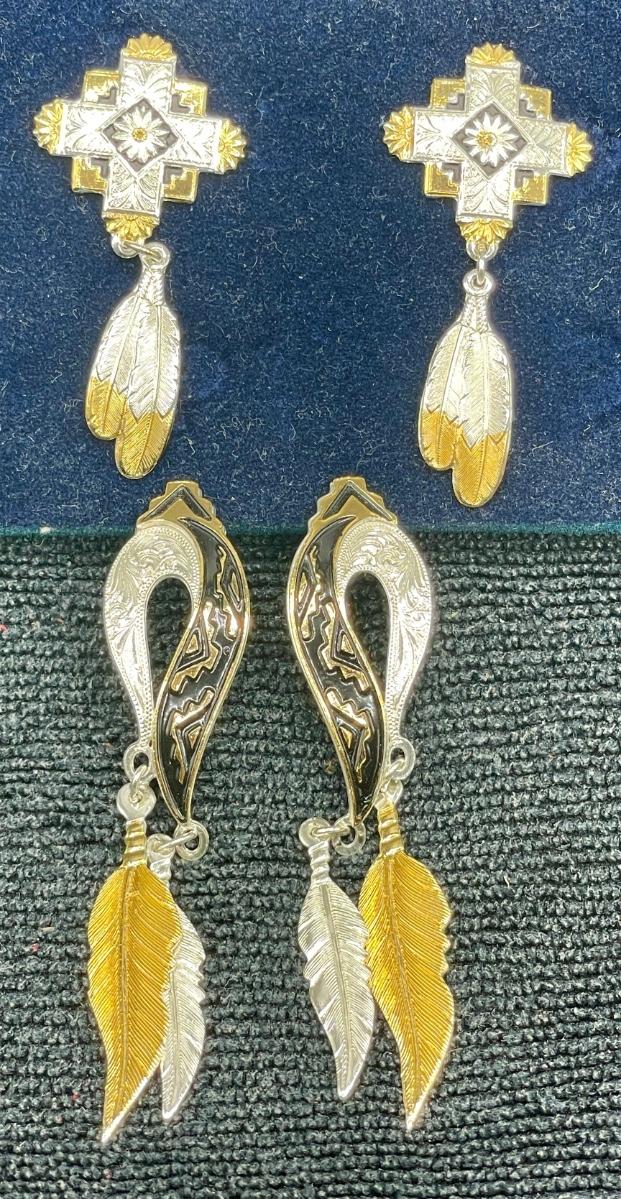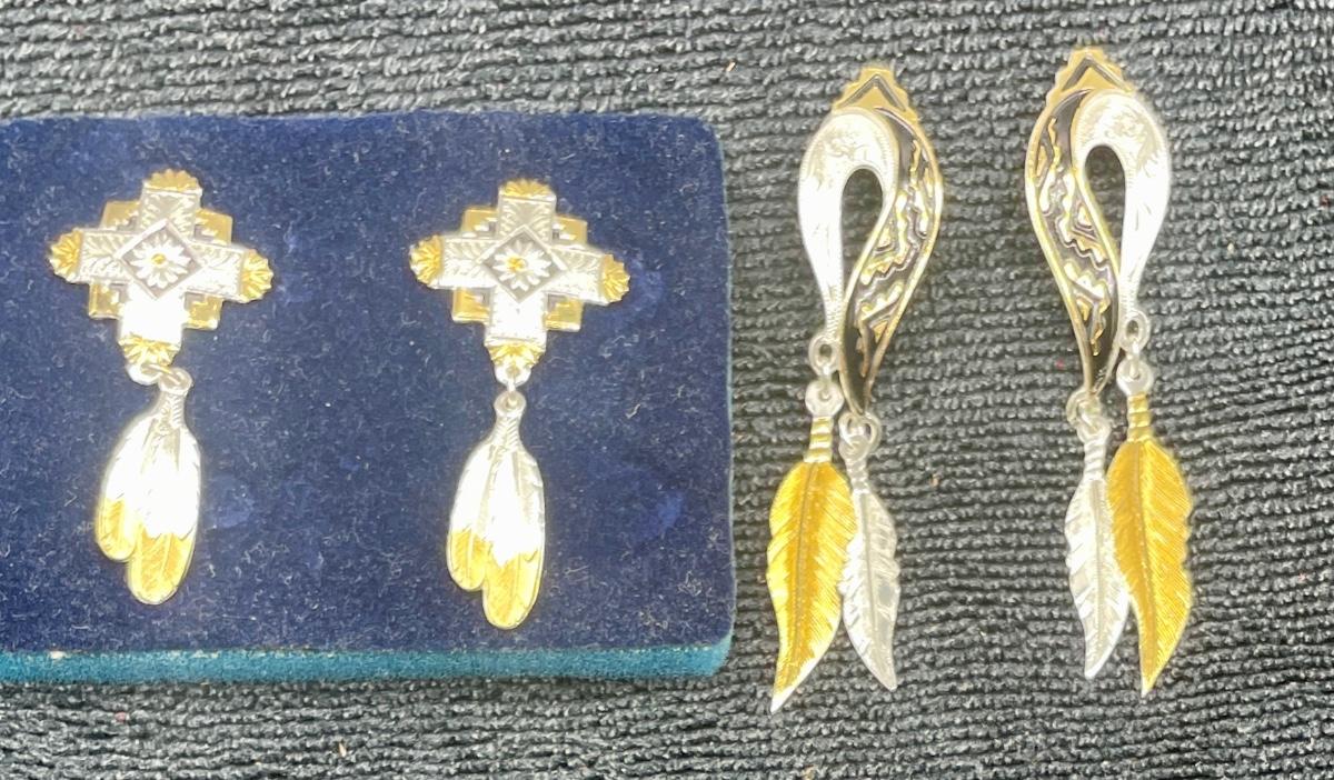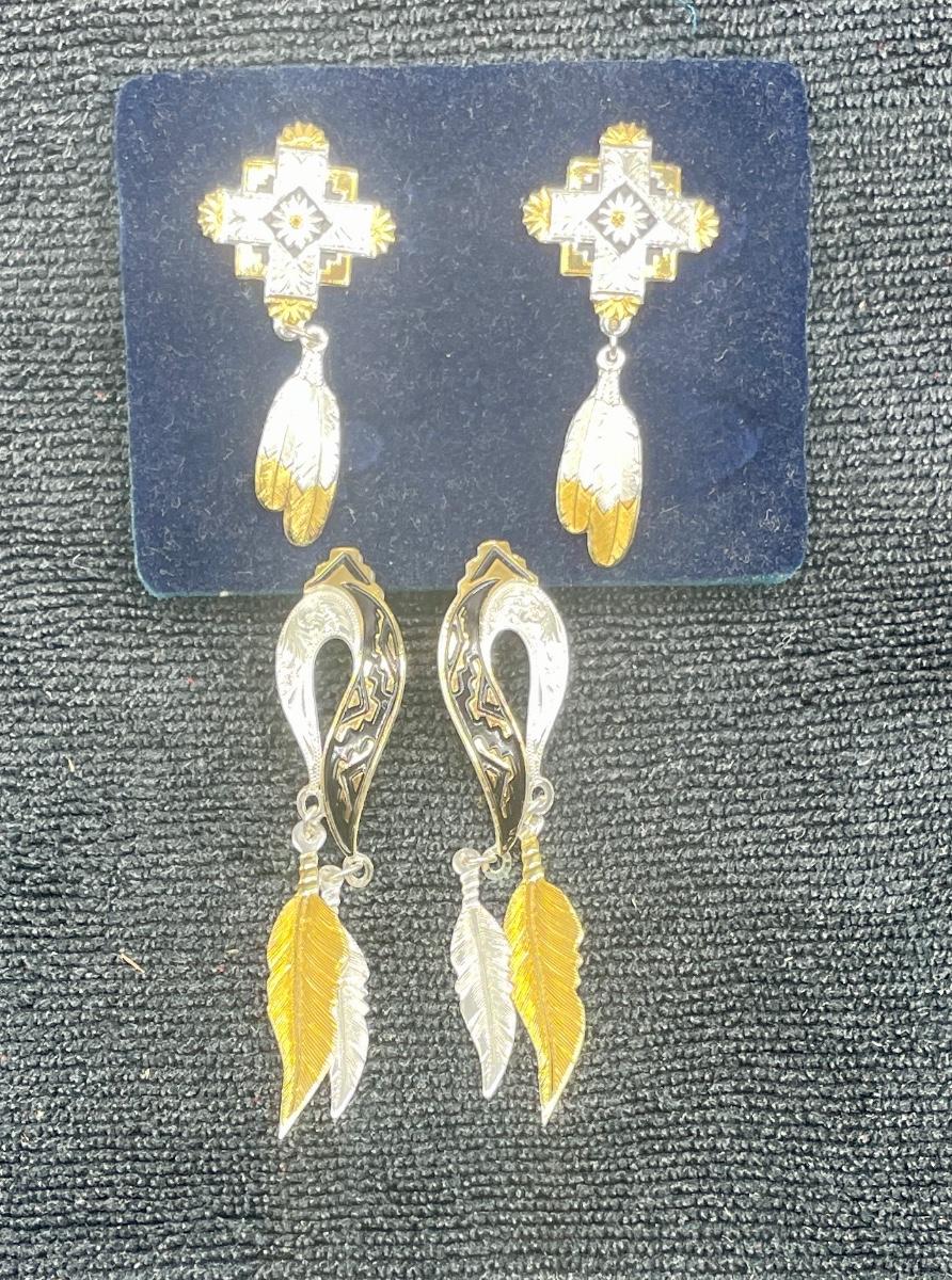 Both pair of pierced ear earrings have dangling feathers. Polished silvertone and goldtone elements. In good condition.