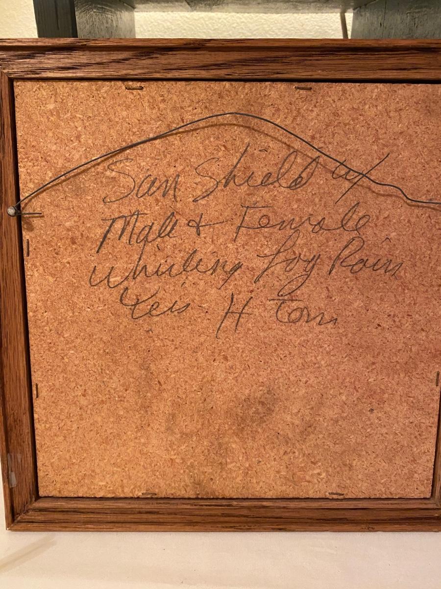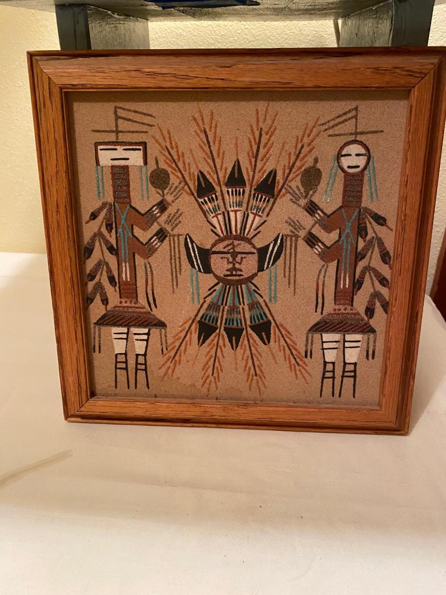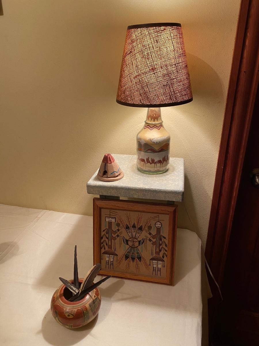 Small sand painting, lamp with burlap shade; signed framed sand painting, small pottery bowl with feathers, incense burner. Sand painting is a sunshield with male and female whirling log rain ties, signed. Lamp is approx 15h, sand painting is approx 9-1/4 square.