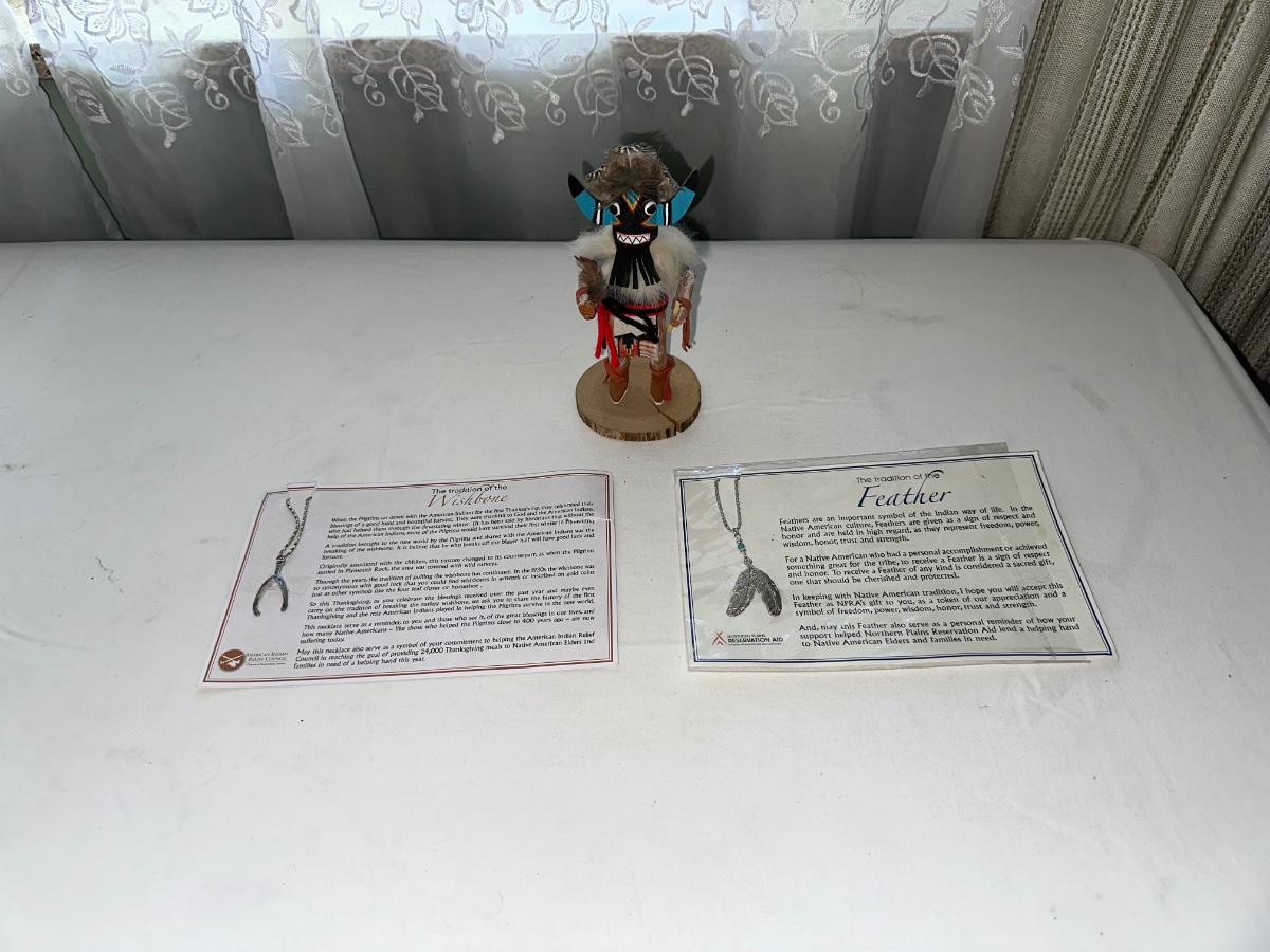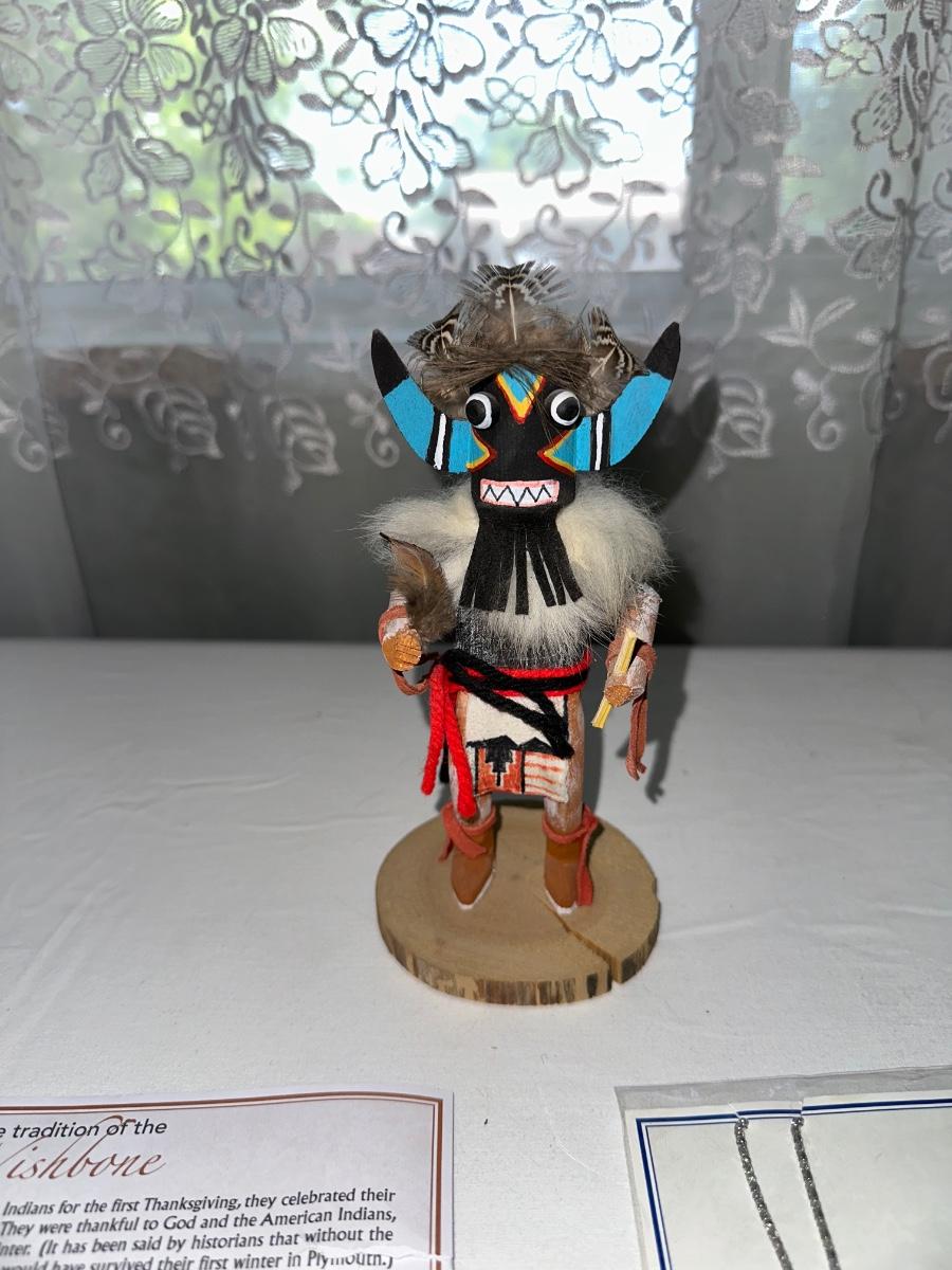 NATIVE AMERICAN MADE KACHINA, WISHBONE NECKLACE AND FEATHER NECKLACE