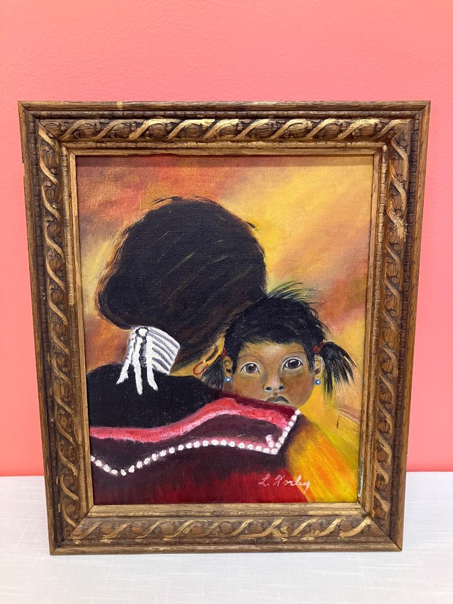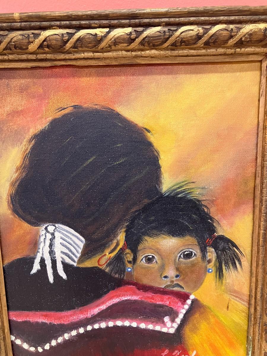 Original oil on canvas of Native American mother and child. 17" H x 14" W, framed