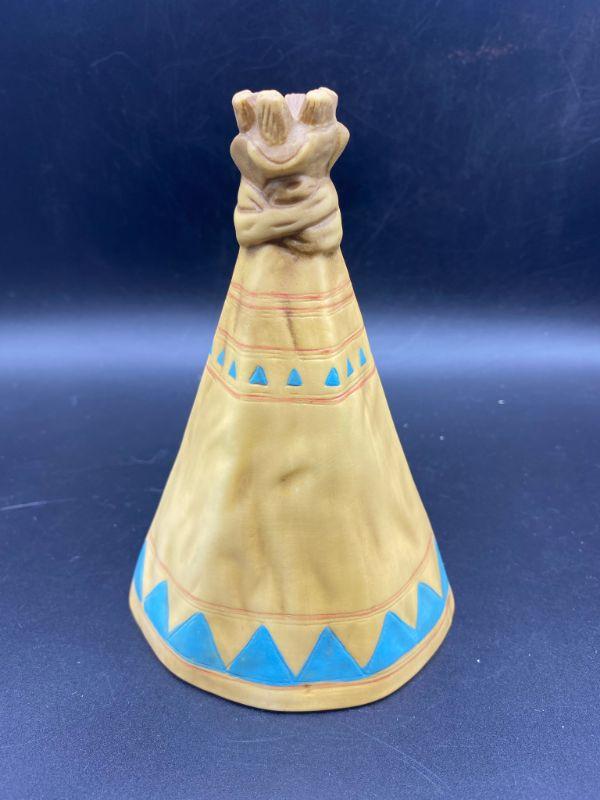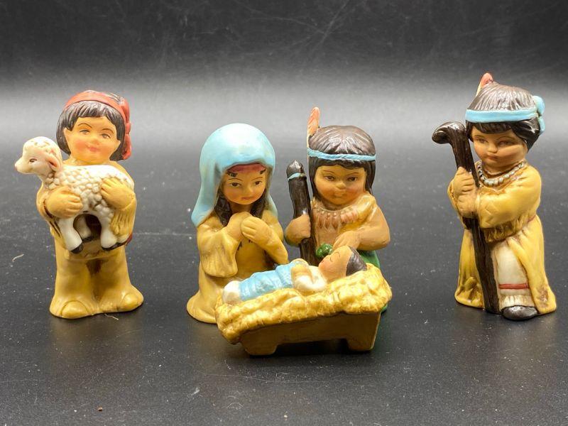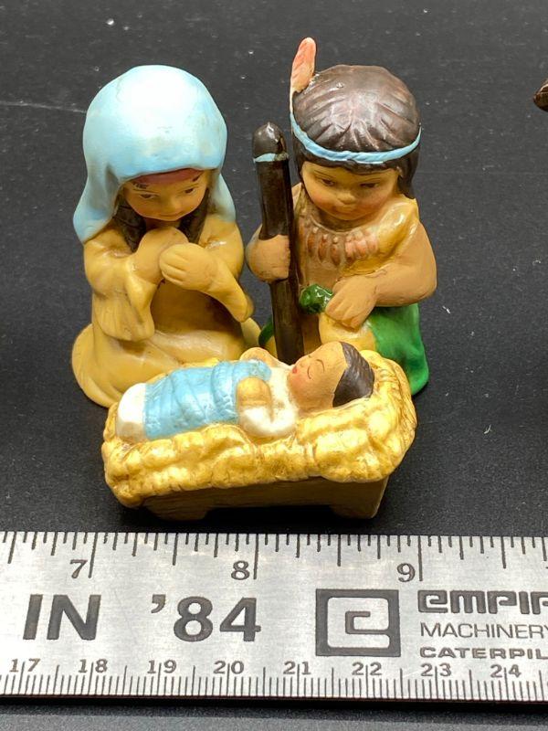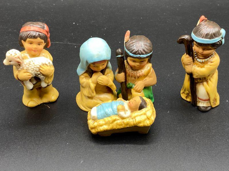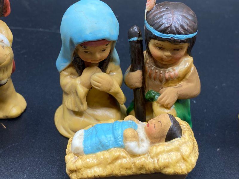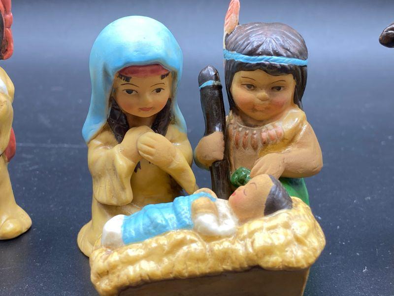 Small Native American themed Nativity scene. 6 pieces total. The teepee was found much later in the process, that is why it is pictured last Figurines are about 3" size.