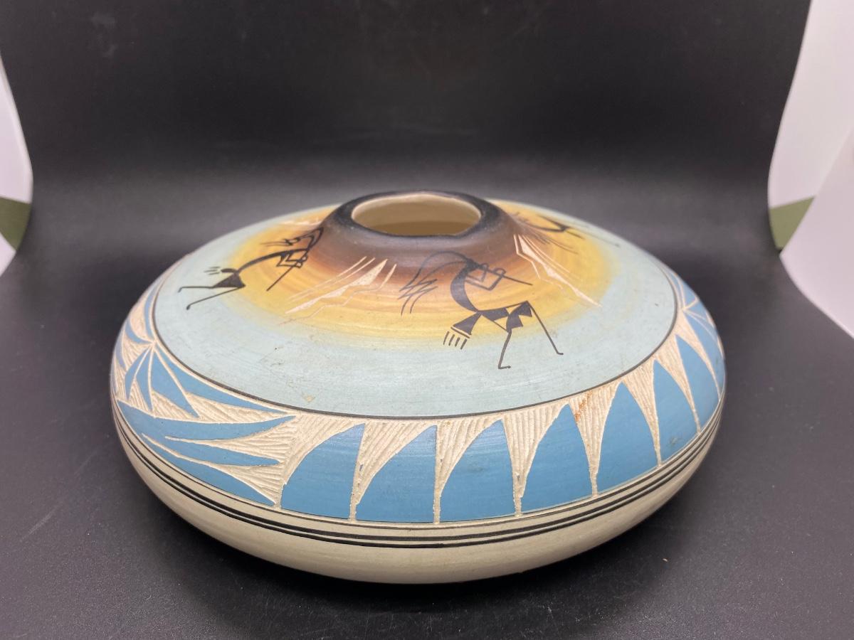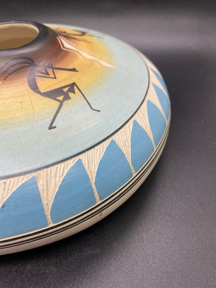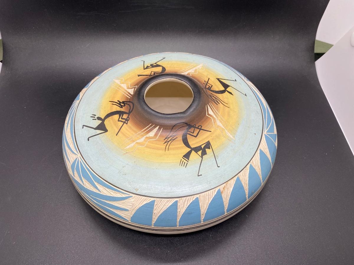 Native American Navajo Artist Alvin Colorful Painted Etched Seed Bowl