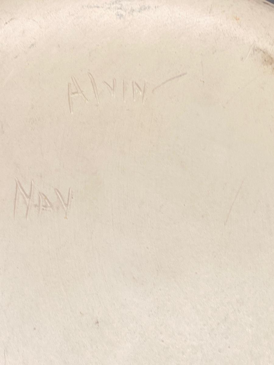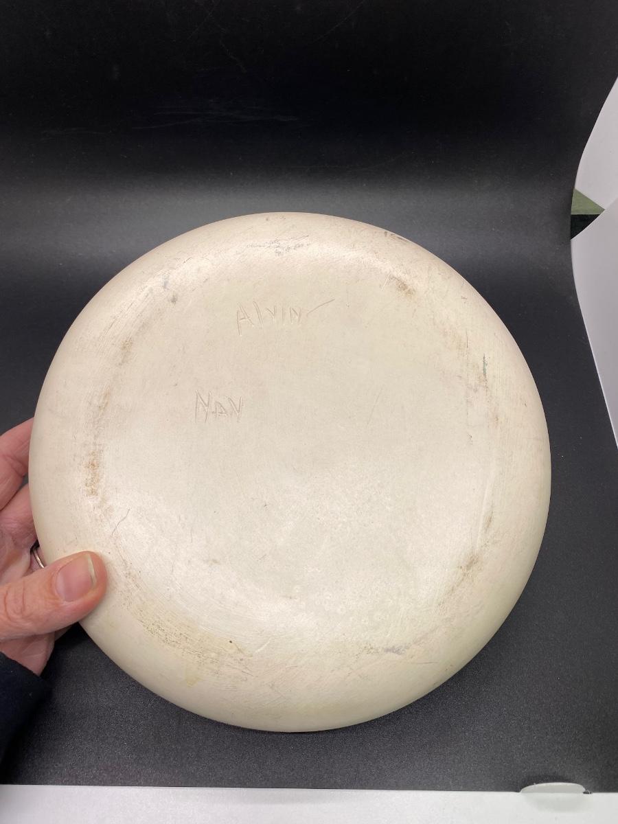 Native American Navajo pottery seed bowl. Hand painted and etched pattern beautifully crafted. Signed on the bottom Alvin Nav. In good condition. About 7" diameter.