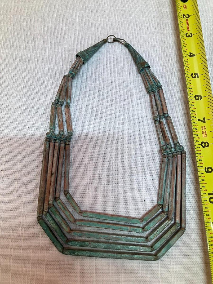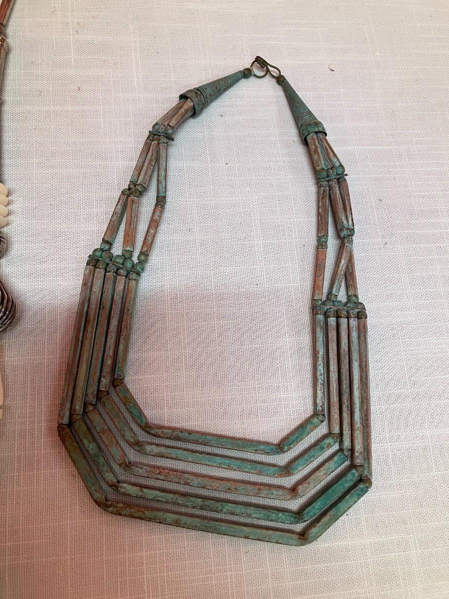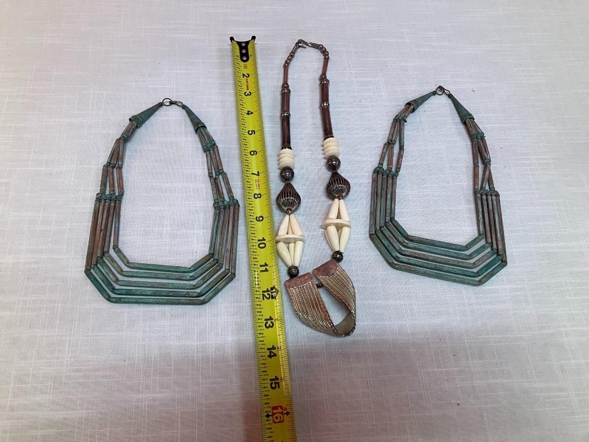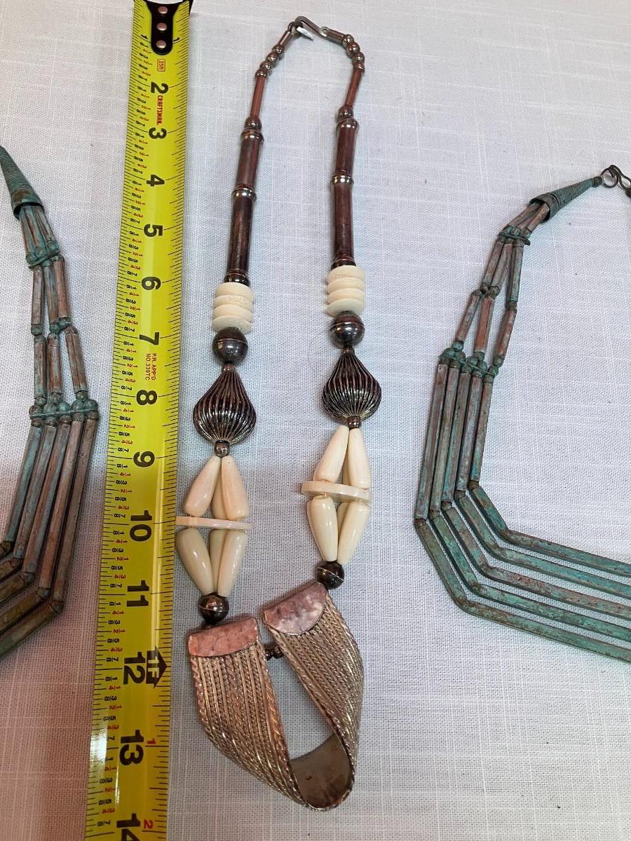 3 necklaces: 2 copper with natural patina and 1 silver plate with authentic bone (bovine or deer) beads