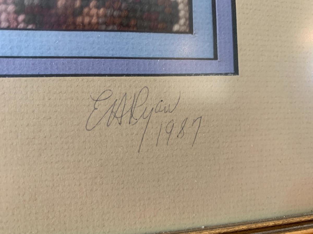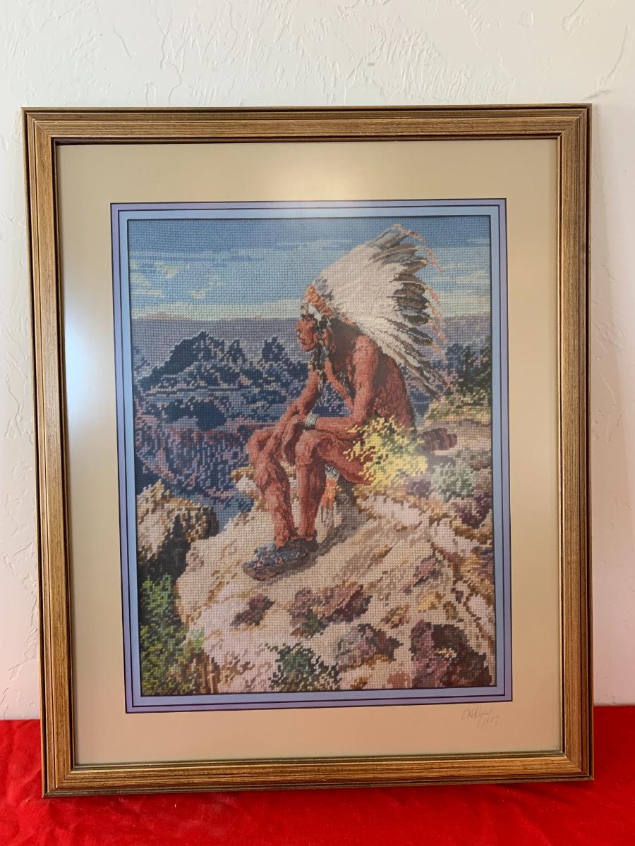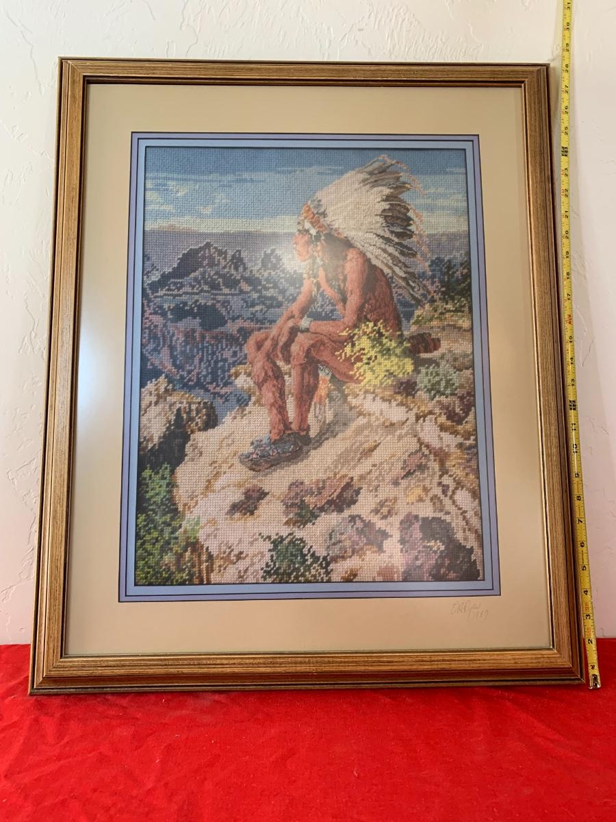Professionally framed and behind glass Native American Needlepoint art signed by B. Ryan 1987 in great condition (23 inches X28 inches)