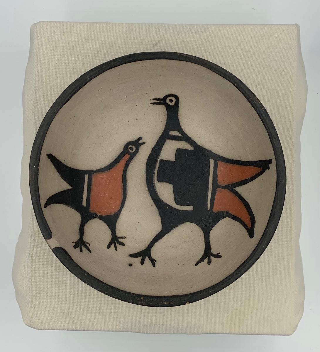 Fantastic 2" x 6“ pottery bowl with two birds depicted. This piece is in excellent condition and would make a great addition to your collection! The White spot on the rim is part of the design and not a chip!