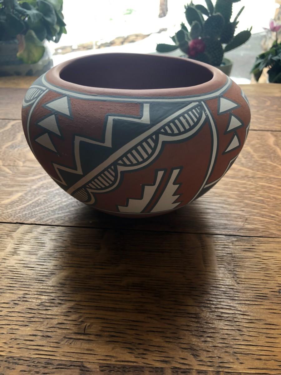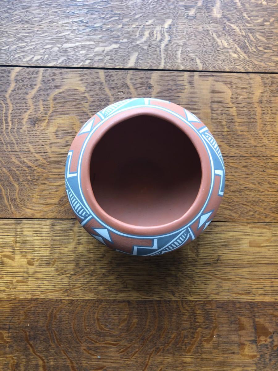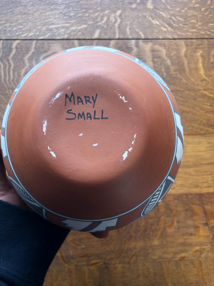 This Native American Pottery Vase is signed by Mary Small and is excellent condition with no chips, checks or cracks. 4.5in tall and 7in wide