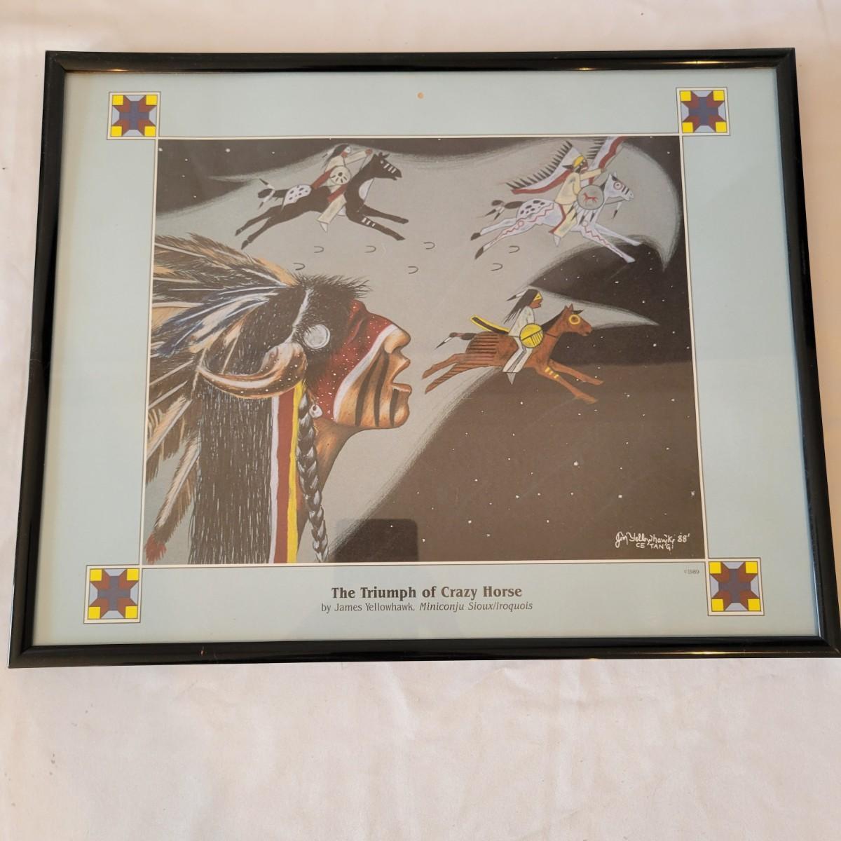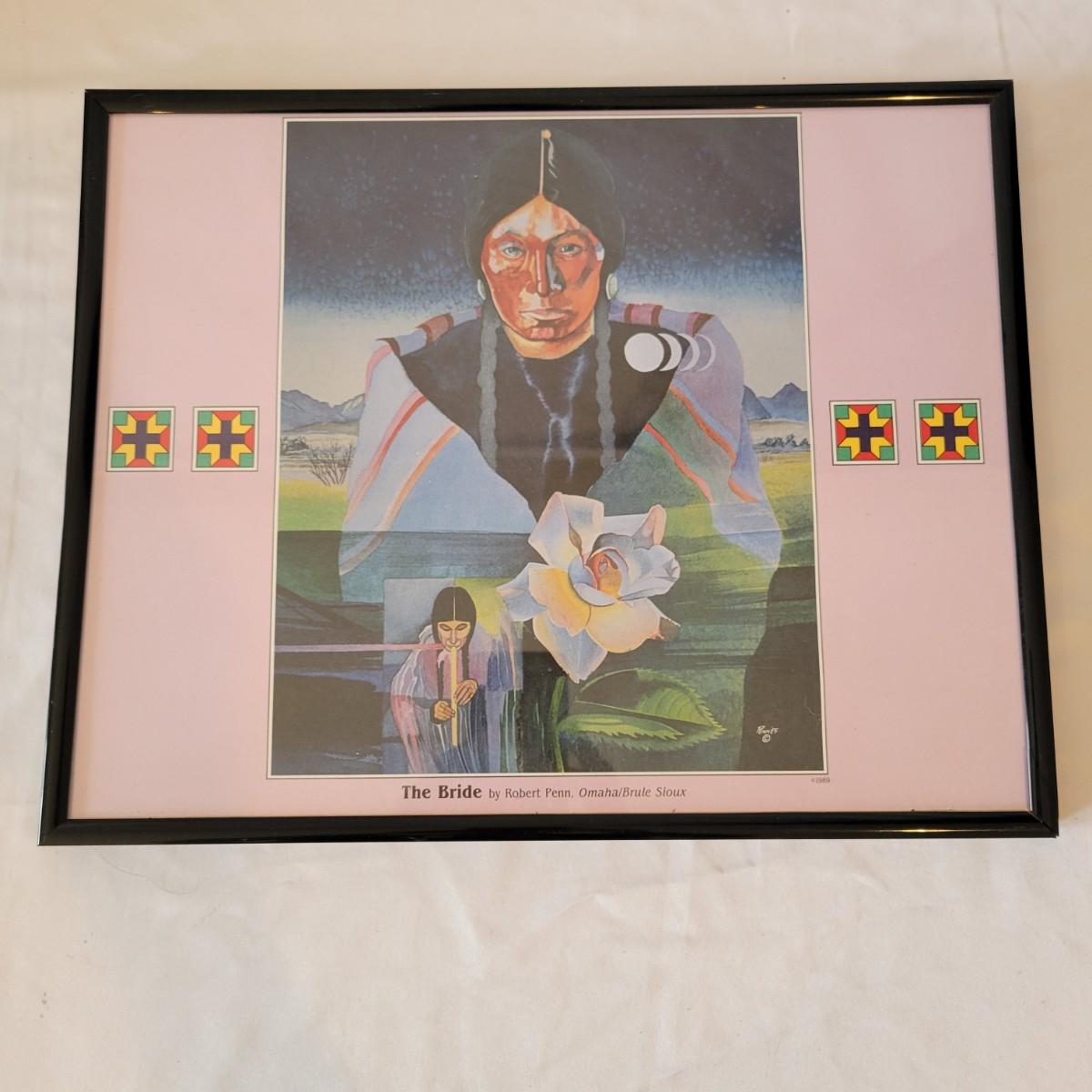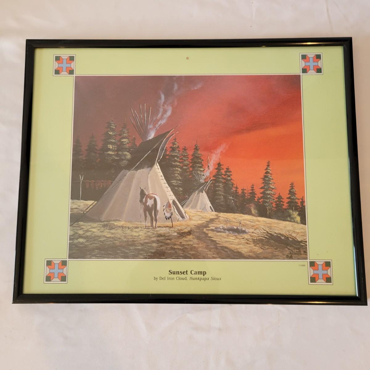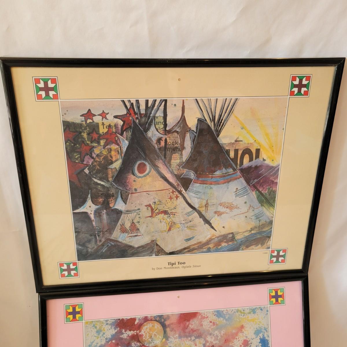 An assortment of Native American framed prints and dreamcatchers. Included is a Cherokee Pow Wow poster in a plastic slip frame that measures approximately 16" x 20". Also includes ten prints in plastic clip frames that depicts a variety of scenes of western Native Americans. Three dreamcatchers are also included. Shipping available. Shipping can be costly. We suggest contacting our preferred local shipping provider, Postage Express, with dimensions and getting an estimate before bidding: (828) 670-5501 or postageexpress@yahoo.com.