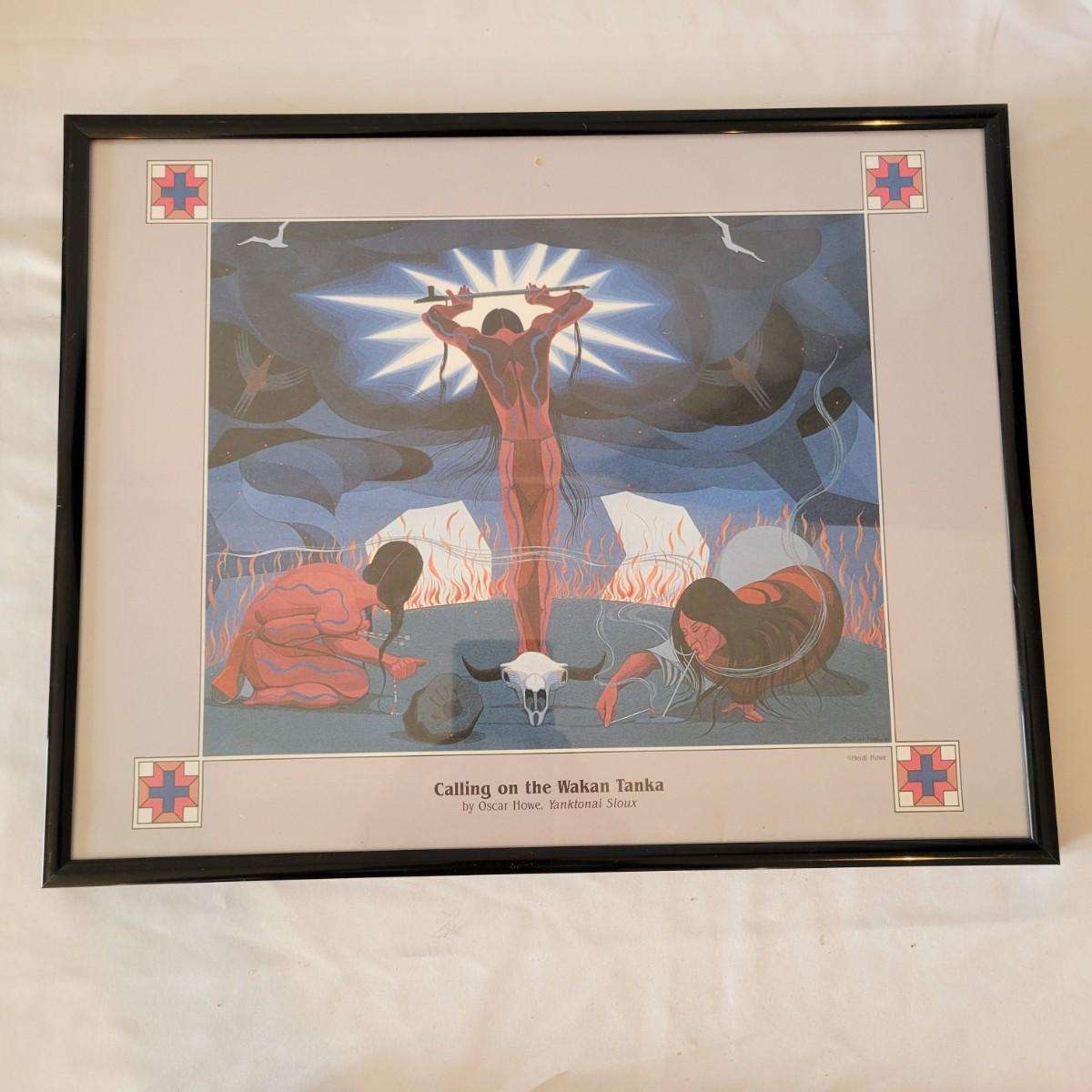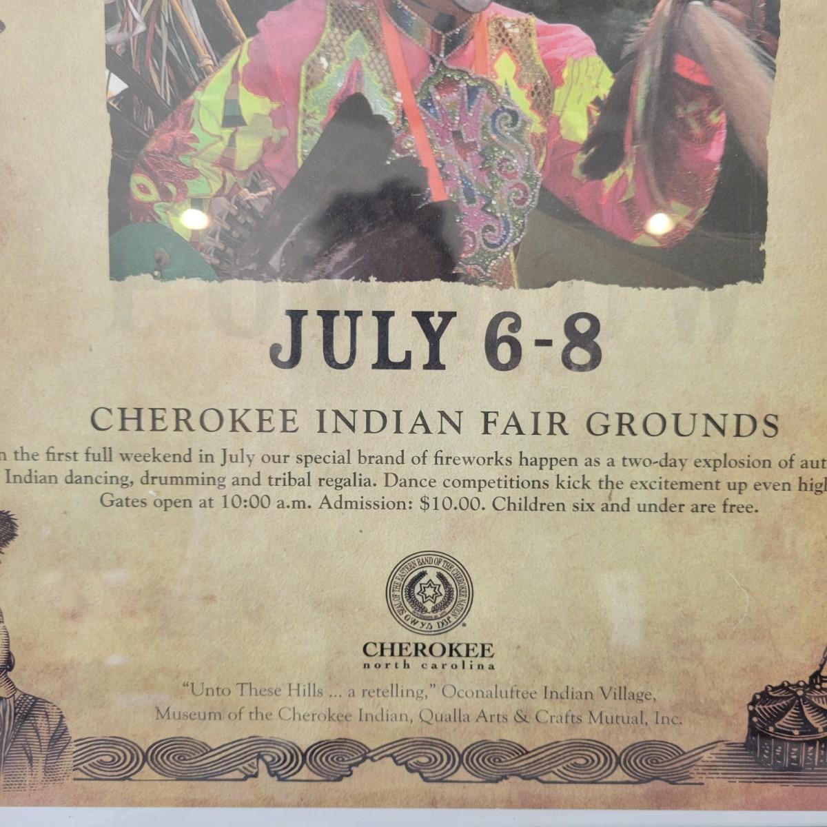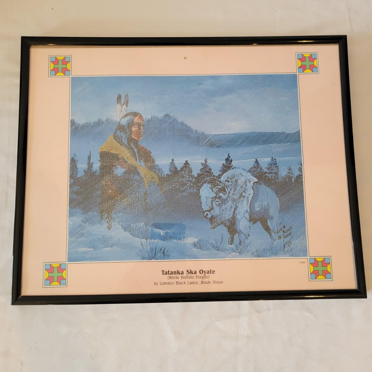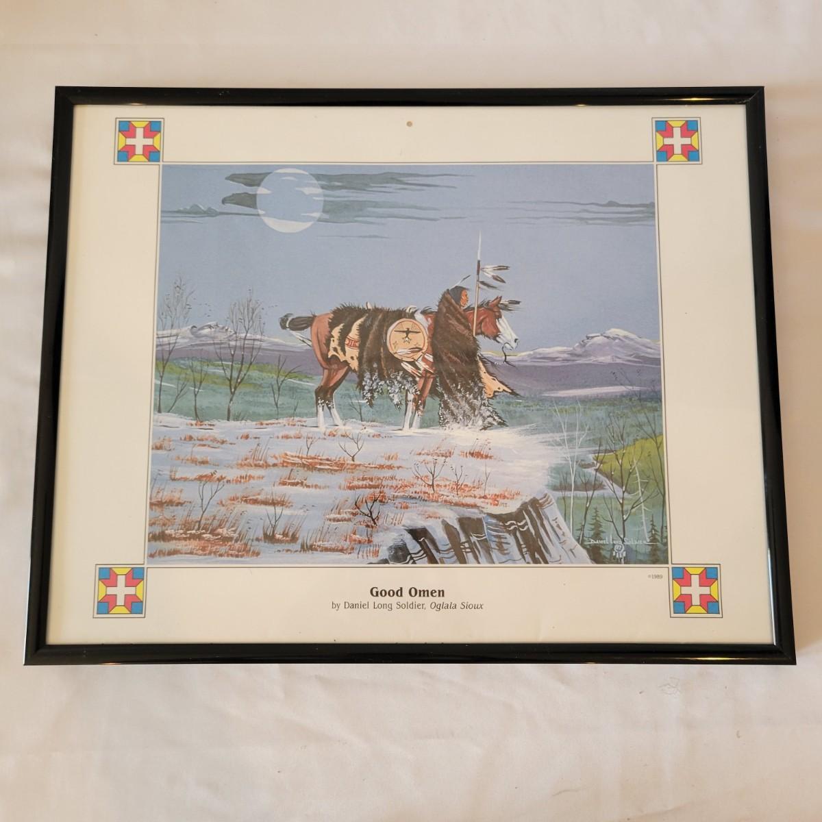 An assortment of Native American framed prints and dreamcatchers. Included is a Cherokee Pow Wow poster in a plastic slip frame that measures approximately 16" x 20". Also includes ten prints in plastic clip frames that depicts a variety of scenes of western Native Americans. Three dreamcatchers are also included. Shipping available. Shipping can be costly. We suggest contacting our preferred local shipping provider, Postage Express, with dimensions and getting an estimate before bidding: (828) 670-5501 or postageexpress@yahoo.com.