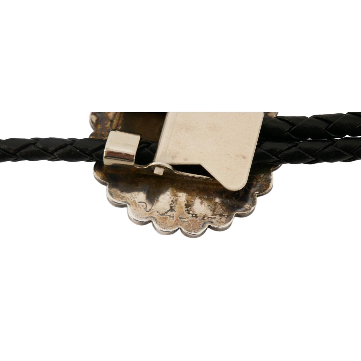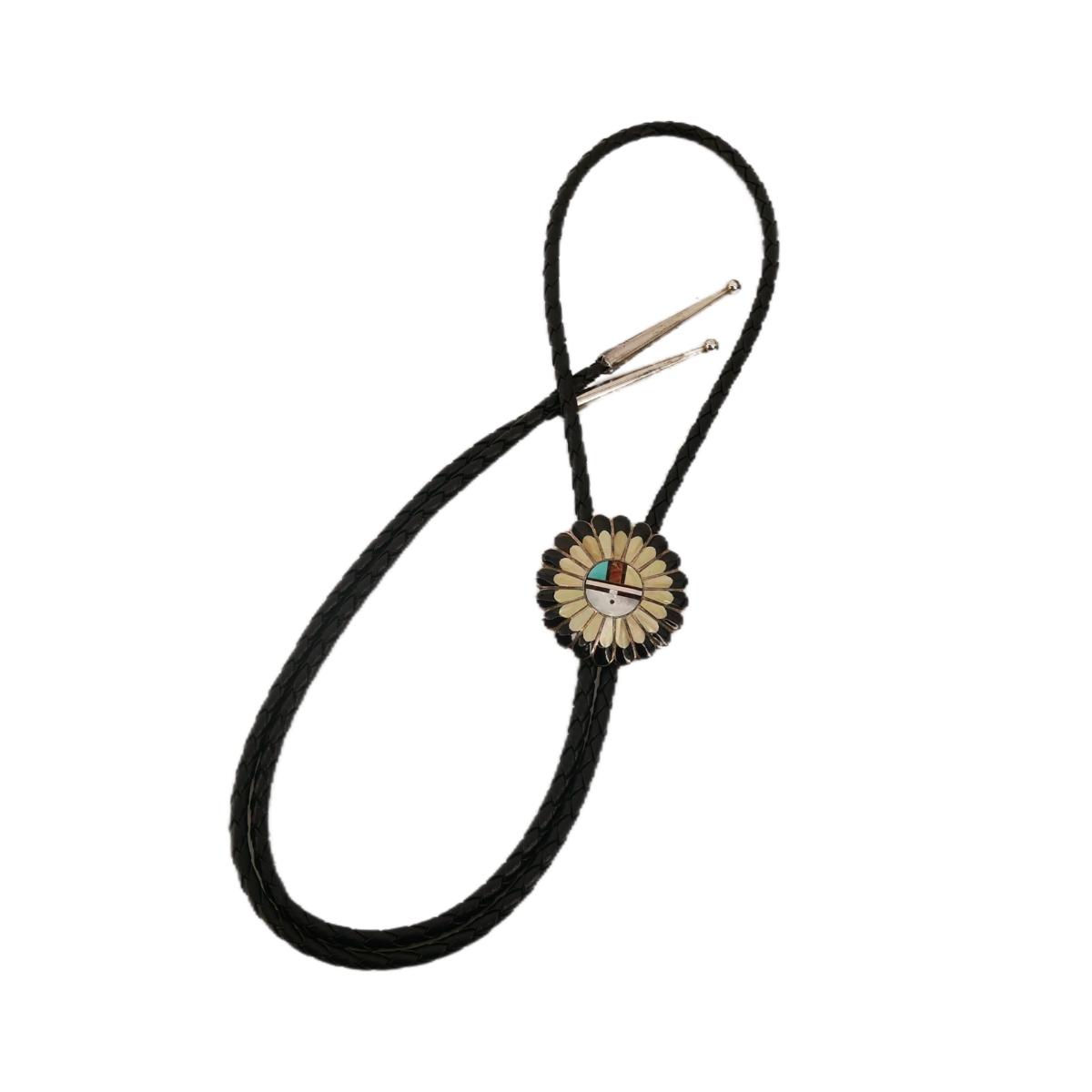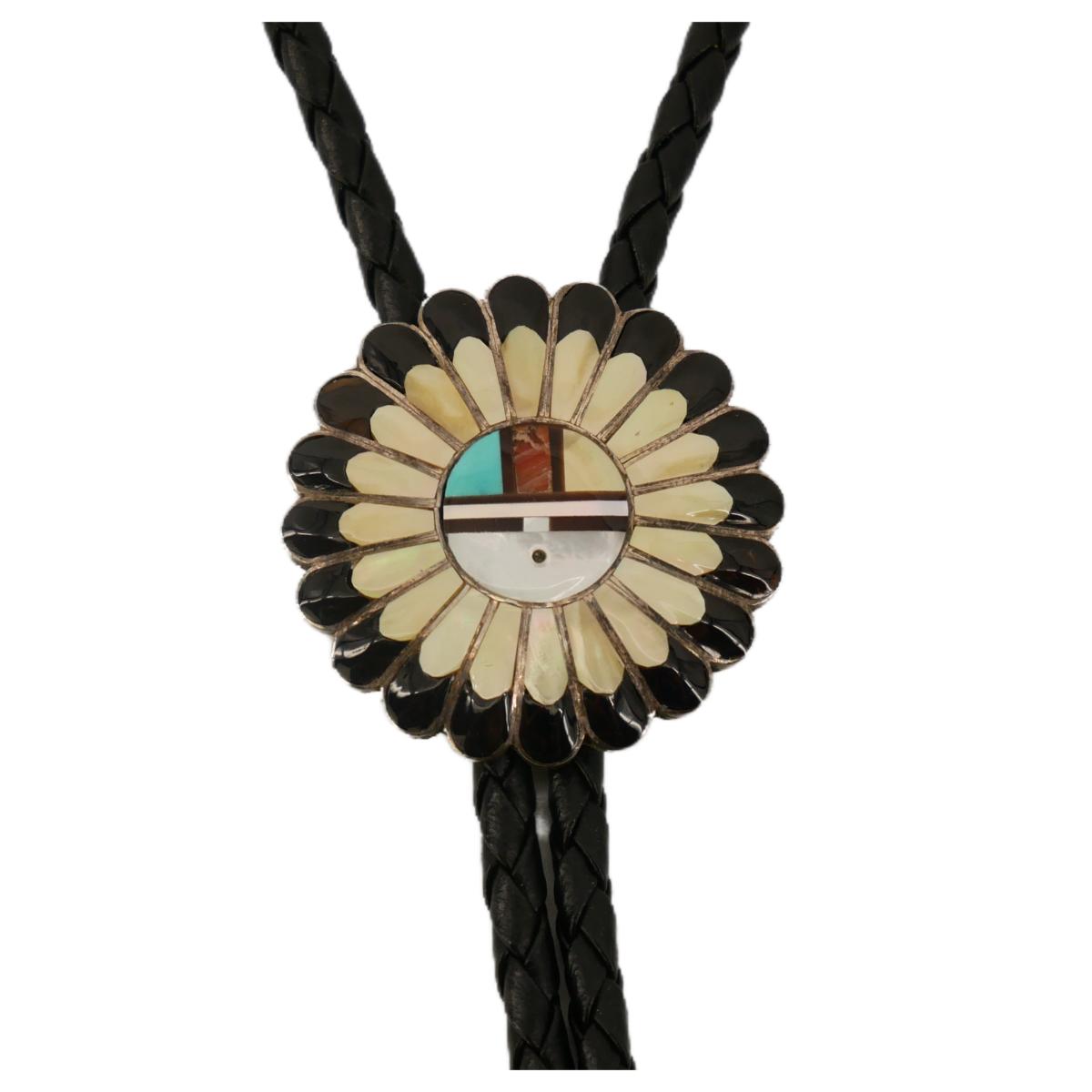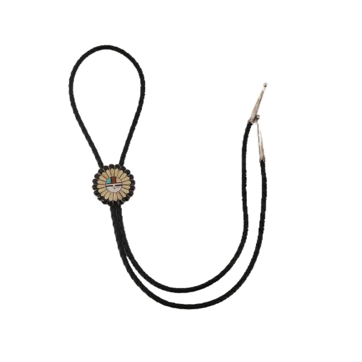 Vintage artist signed Zuni Sun Face bolo tie set with mother of pearl and natural stone inlays. Braided cord necklace with sterling silver tips. Artist signature inscribed on back. Measures 19" in length and weighs 0.9 oz. (J2)