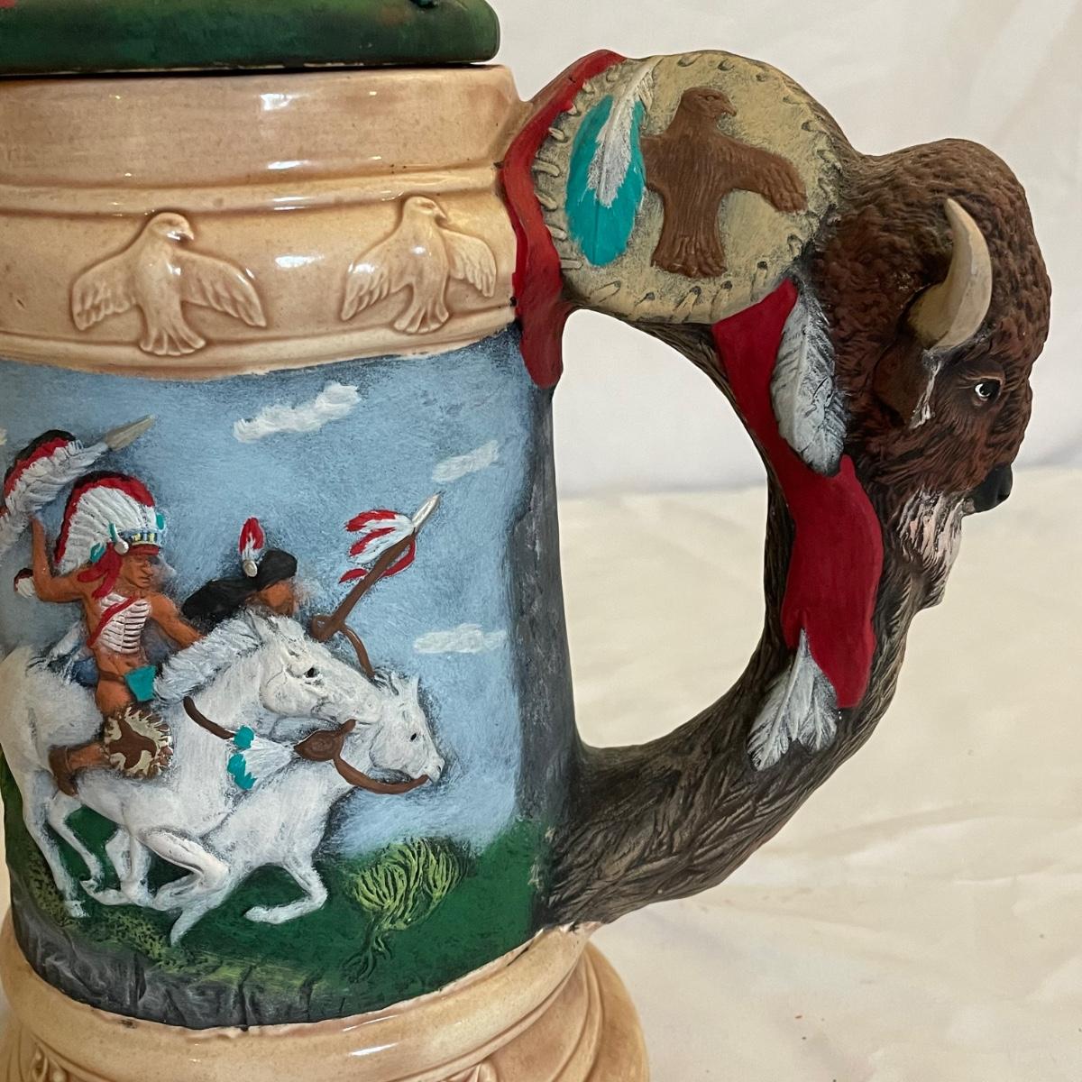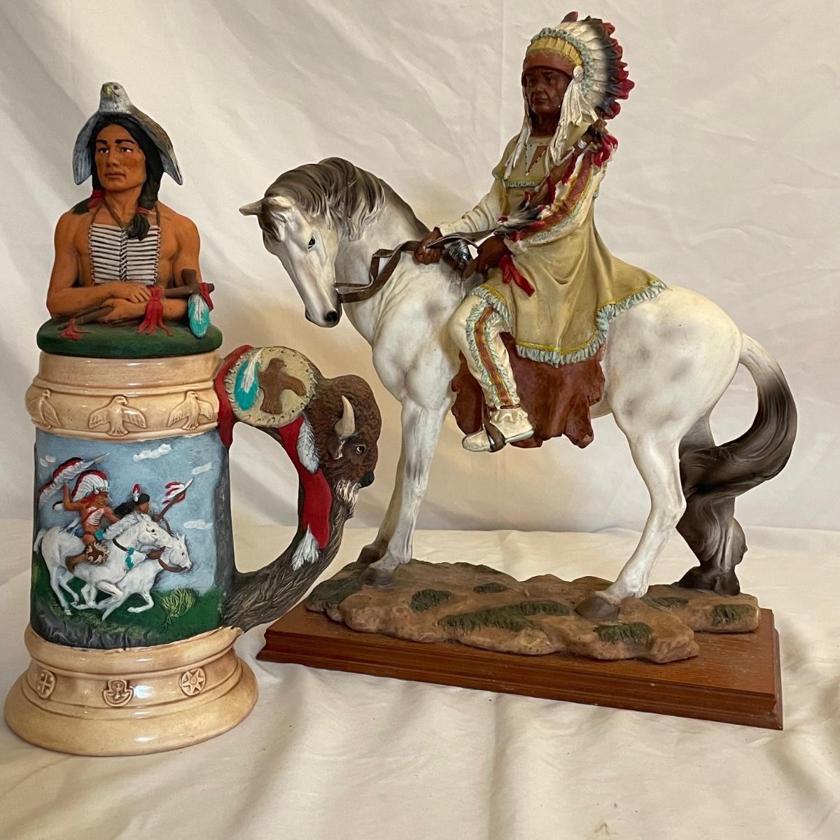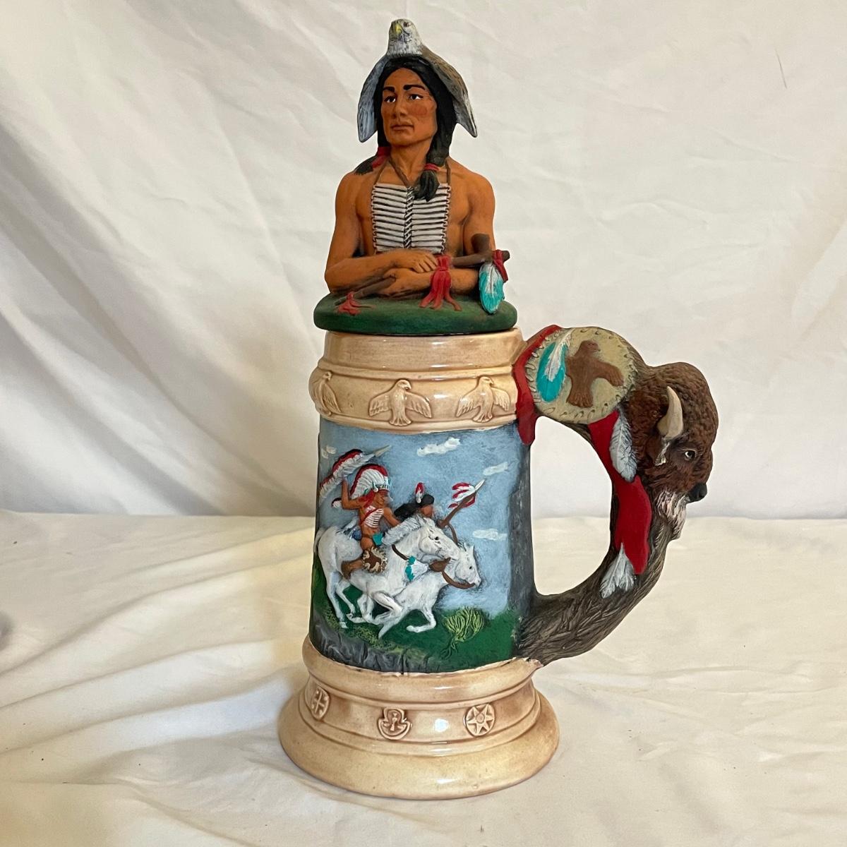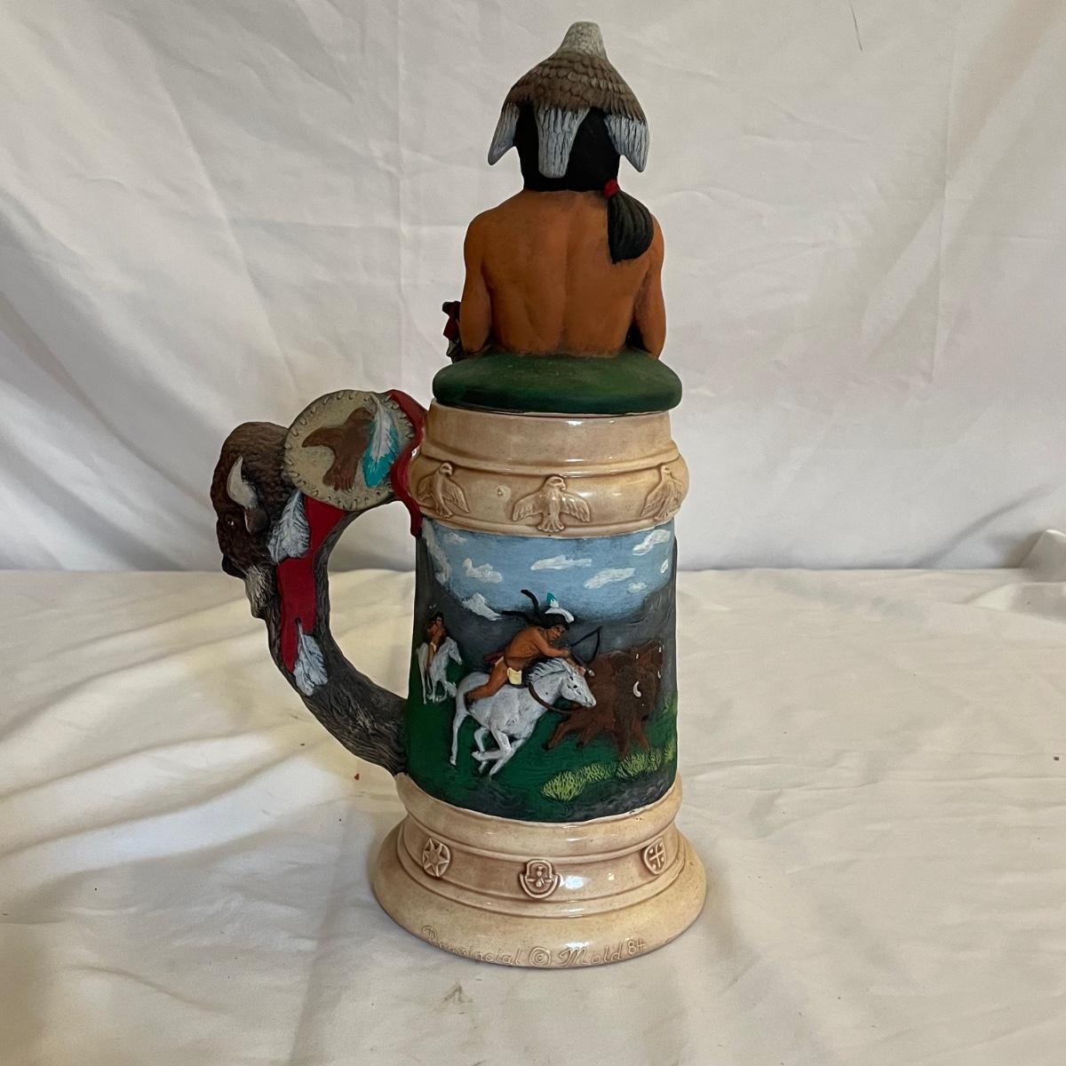 This duo includes an impressive ceramic stein that stands 13.5” tall and a figurine that appears to be made out of a resin type material mounted on a wooden base; it measures 12” x 6” x 17”.