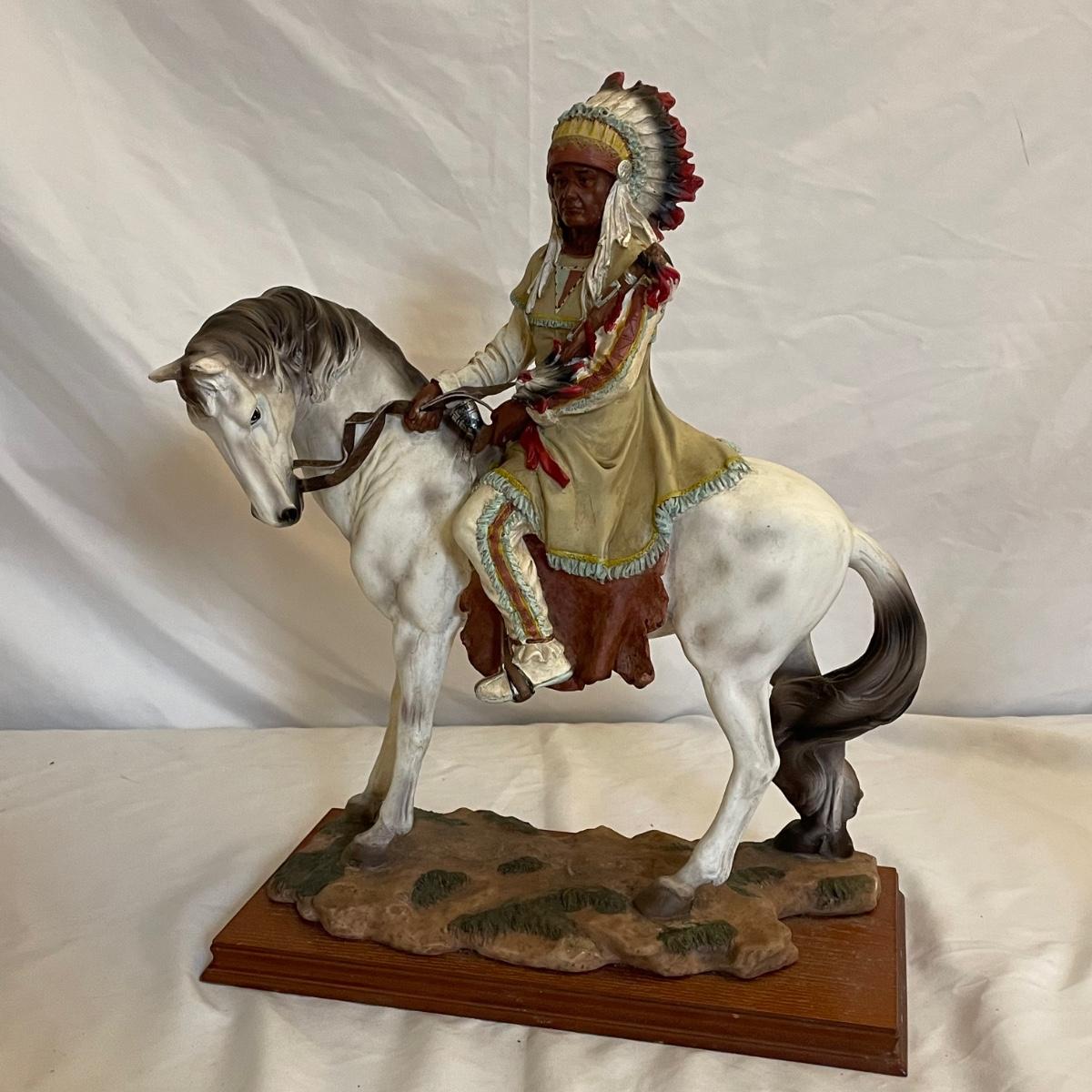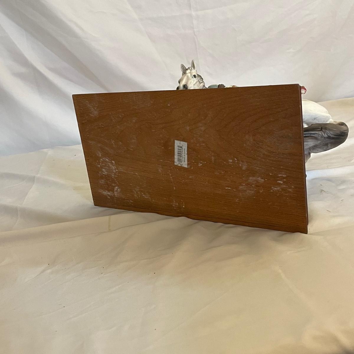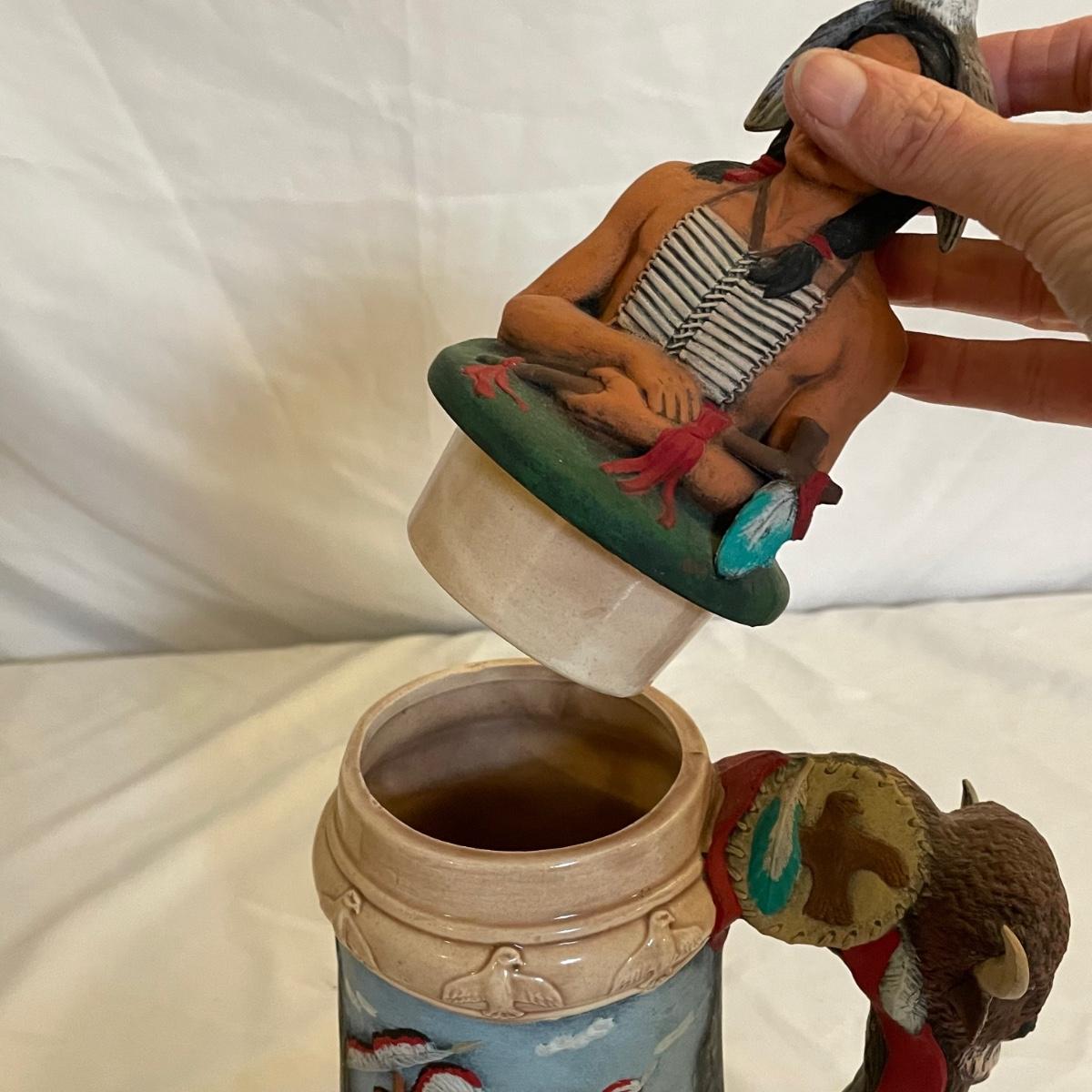 This duo includes an impressive ceramic stein that stands 13.5” tall and a figurine that appears to be made out of a resin type material mounted on a wooden base; it measures 12” x 6” x 17”.