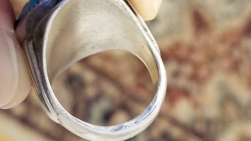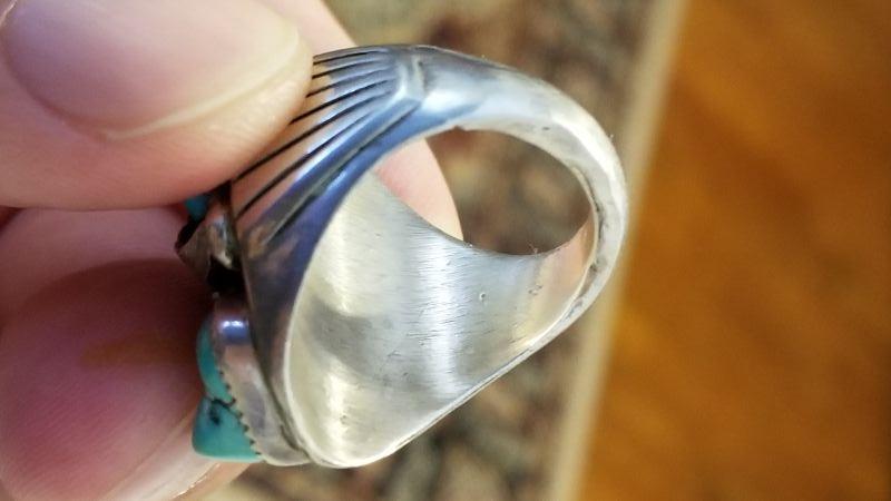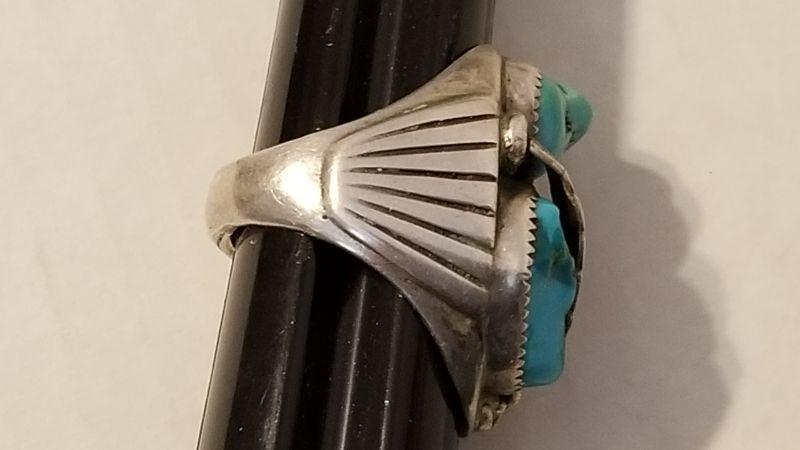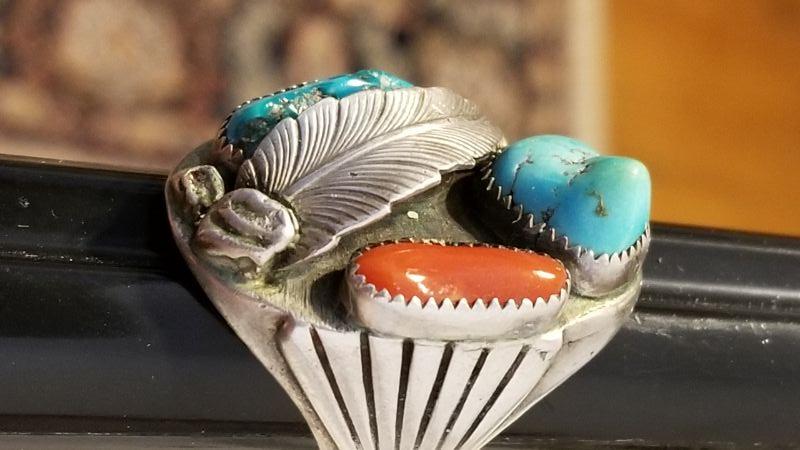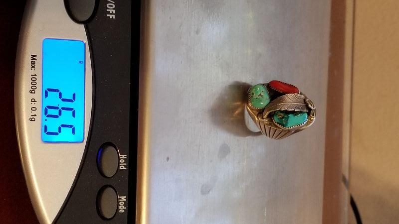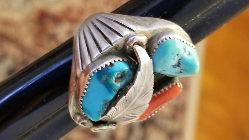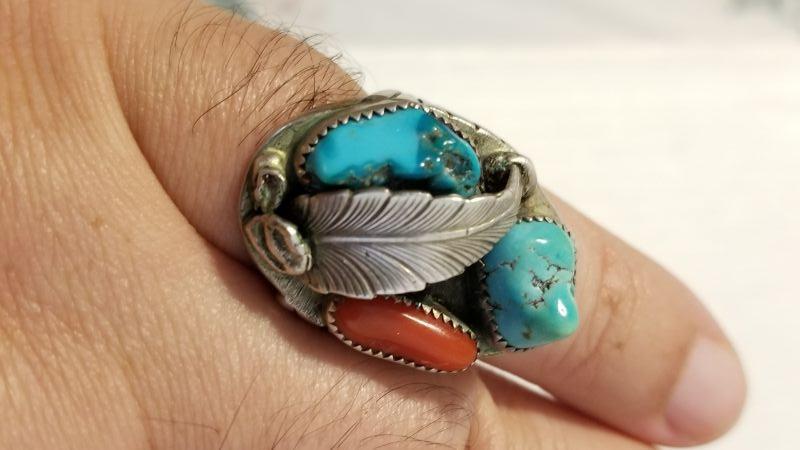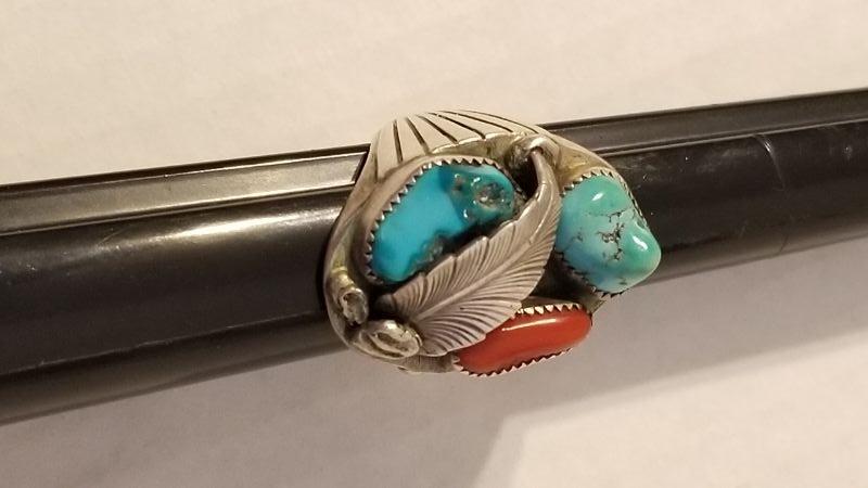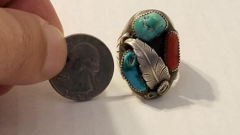Impeccably detailed Native American, Large, Heavy, Sterling Ring with turquoise and coral. Unsigned and unmarked but tested sterling.
