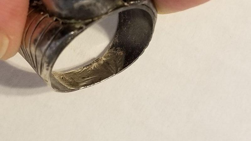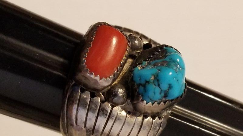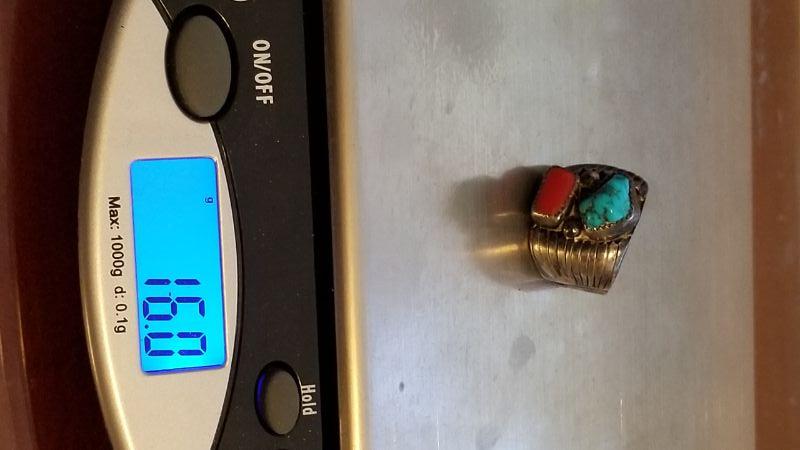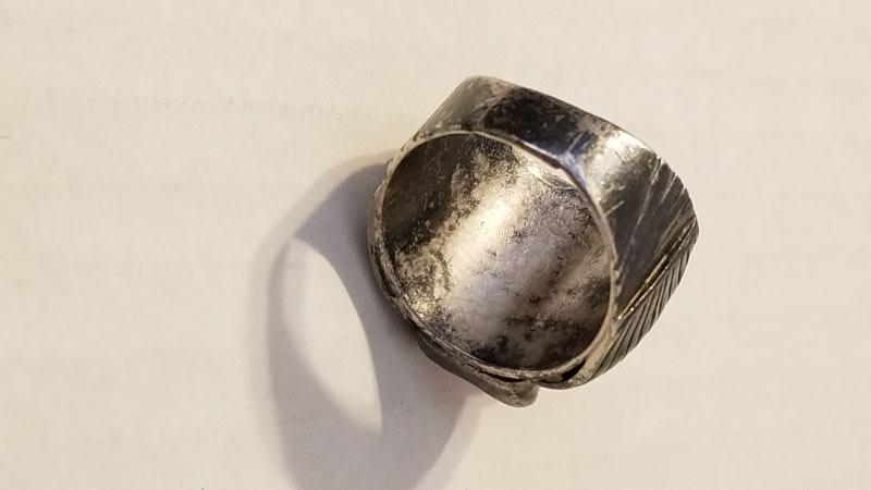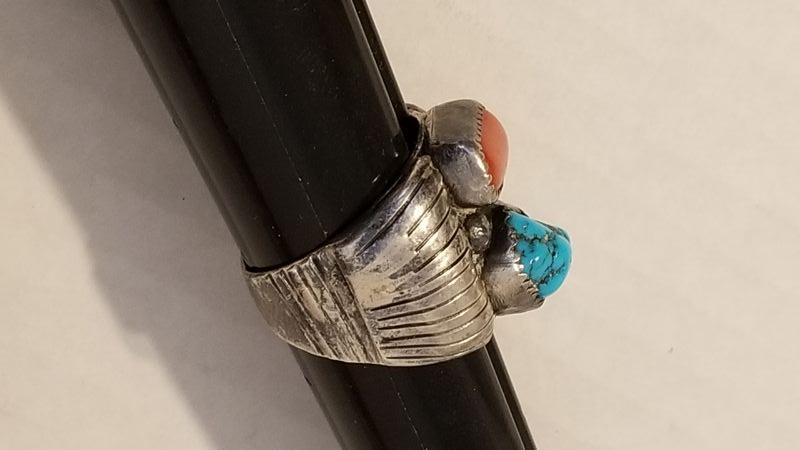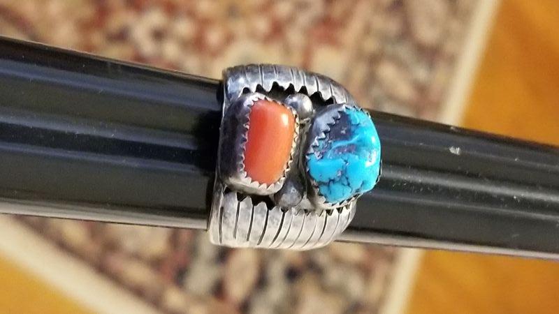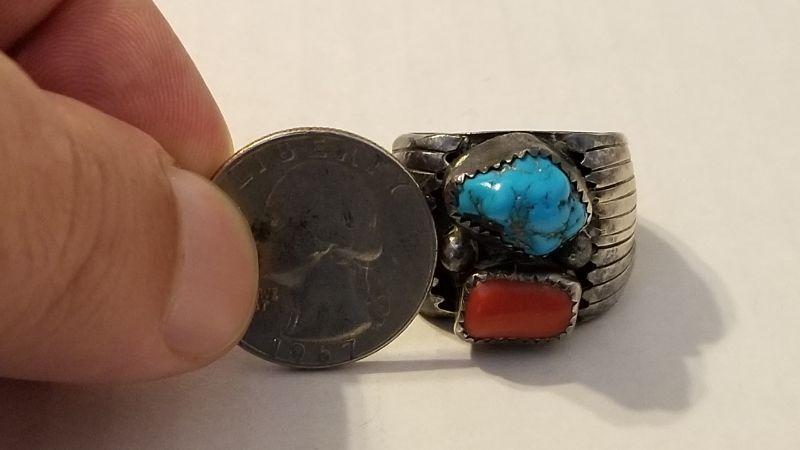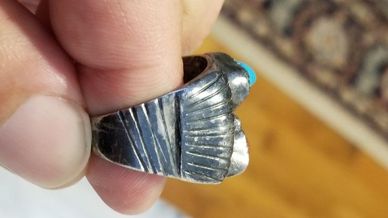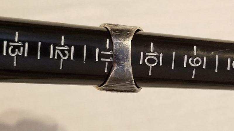 Native American Sterling, nice weight to it, beautiful craftsmanship. No markings noted, tested sterling. It looks like the bottom inside of the shank had a repair or was sized and poorly finished. It is wearable as is, but may require refinishing or strengthening down the road.
