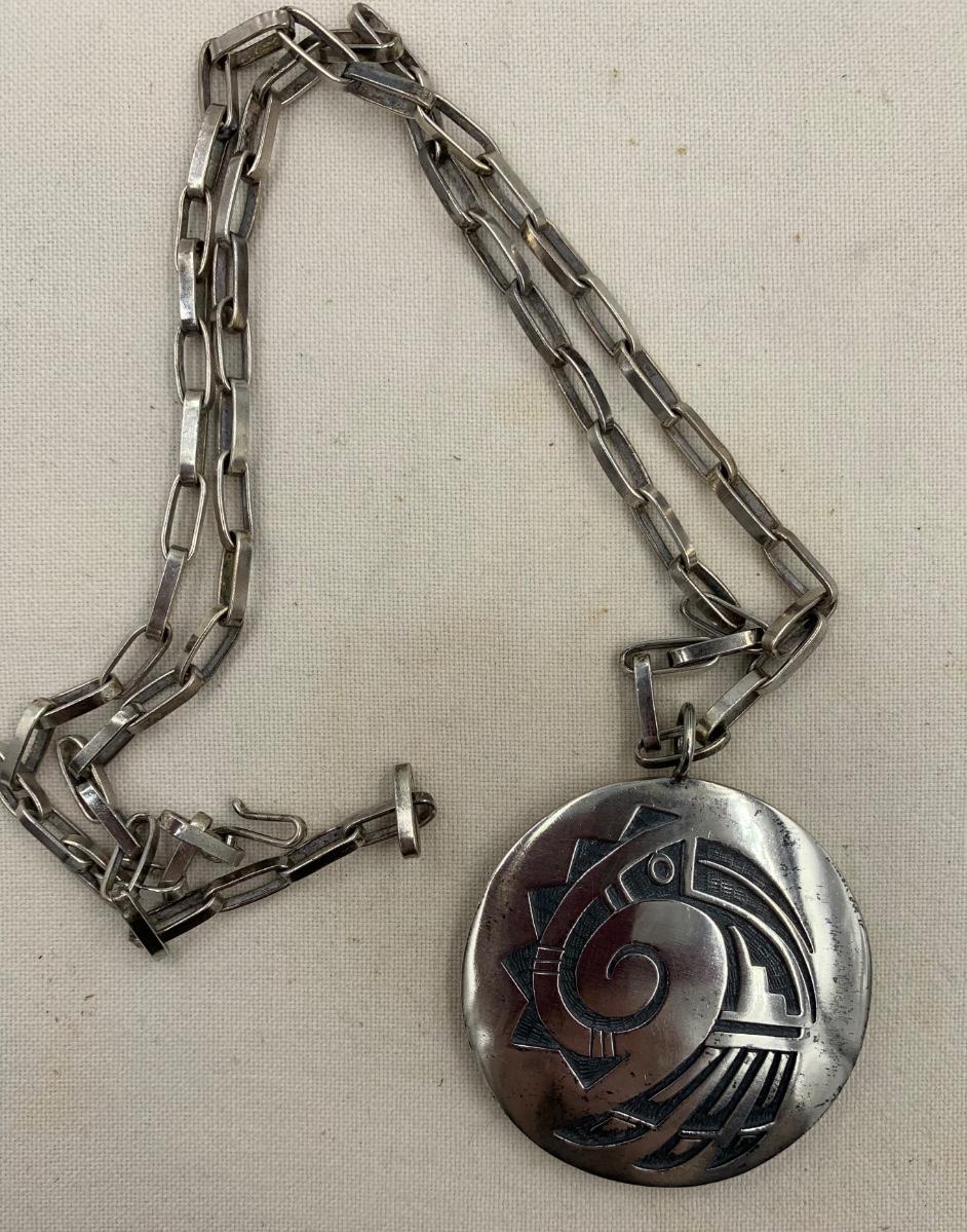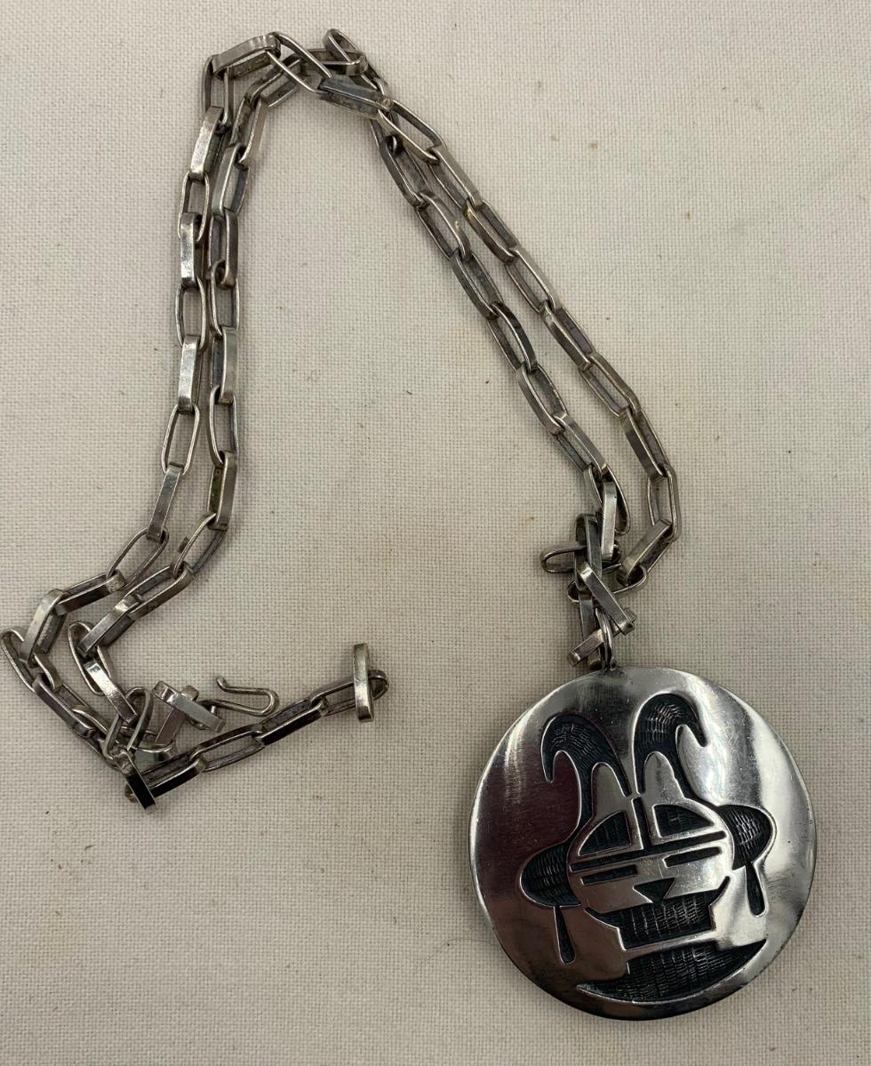 Great vintage sterling silver pendant measuring 2" wide comes with a 25” long chain. This is an awesome piece of jewelry!