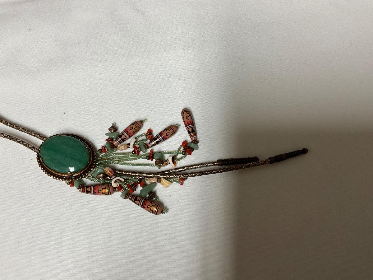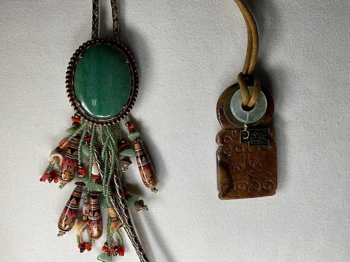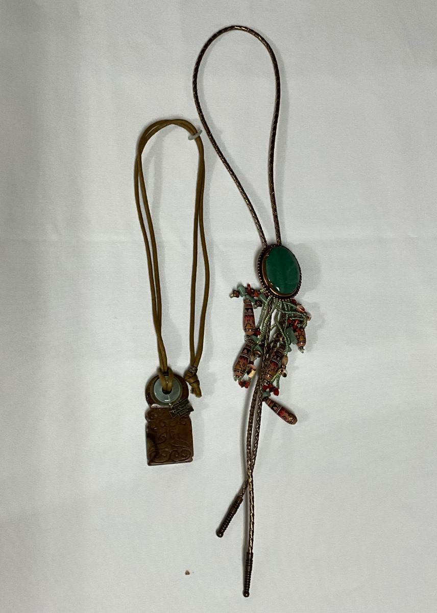 Native Am style bolo tie w/jade stone, Chinese jade pendant w/bi disc and carved pattern.