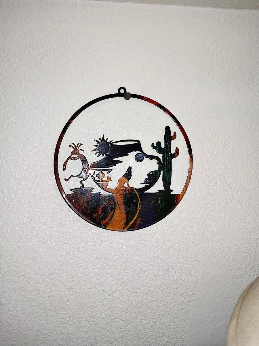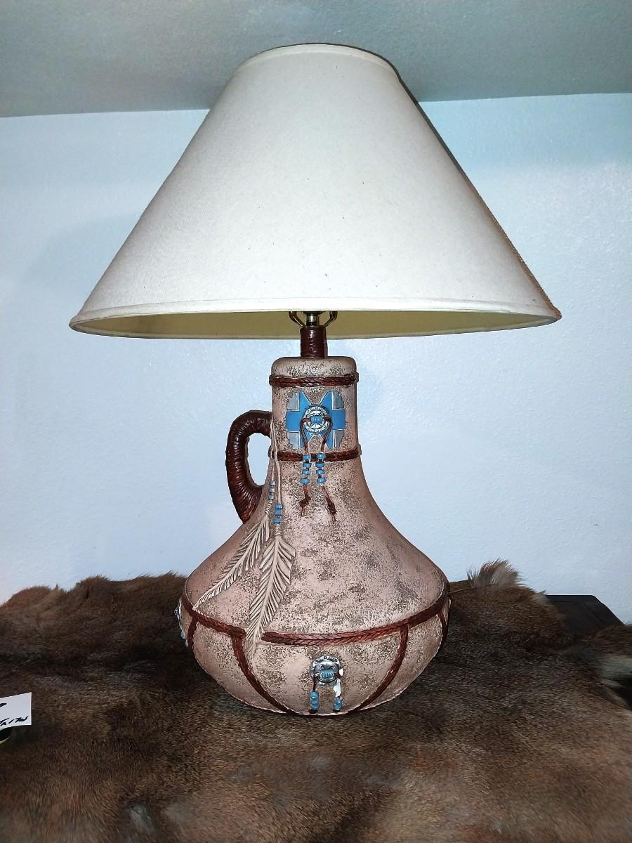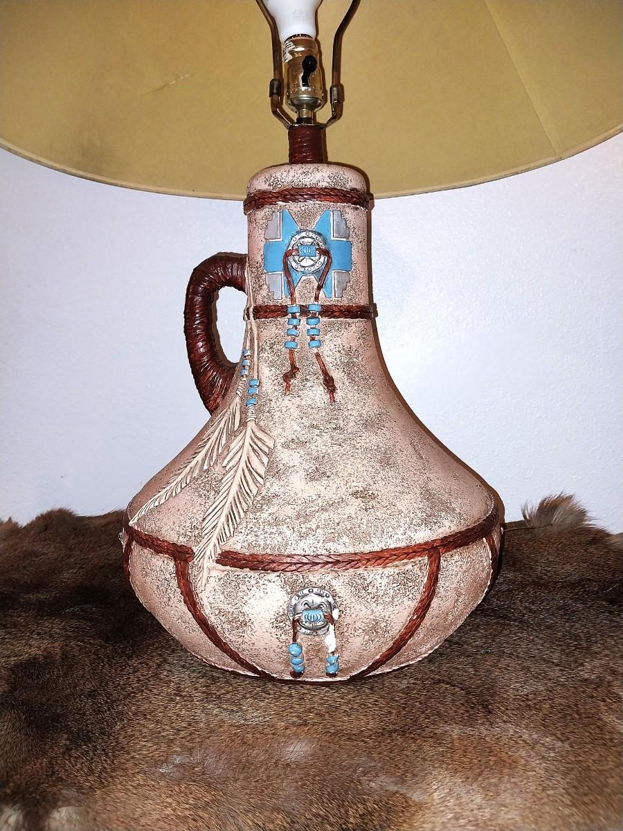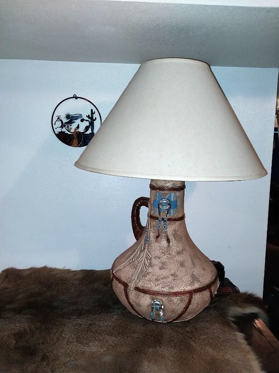 NATIVE AMERICAN THEMED LAMP AND METAL WALL HANGING