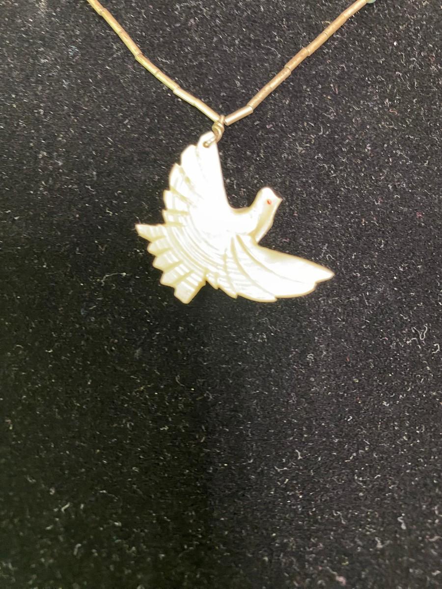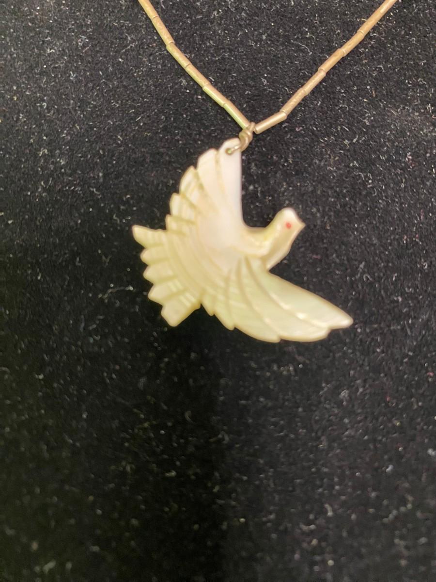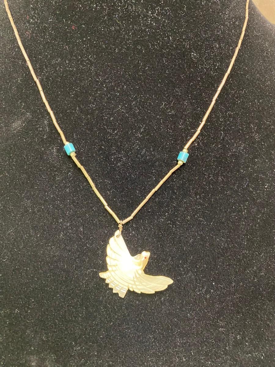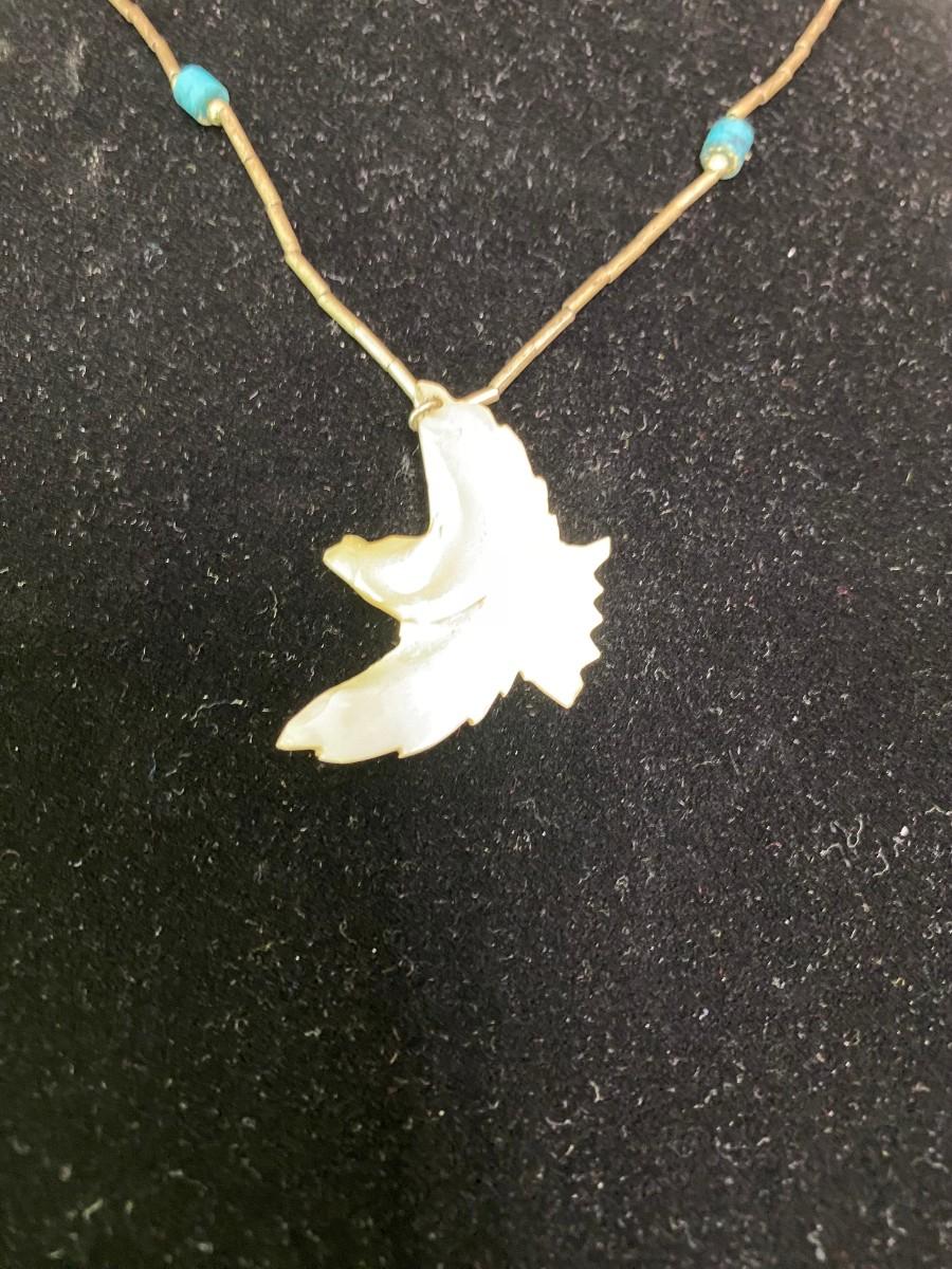 Mother of Pearl Thunderbird on liquid silver 18" chain with 2 turquoise beads.