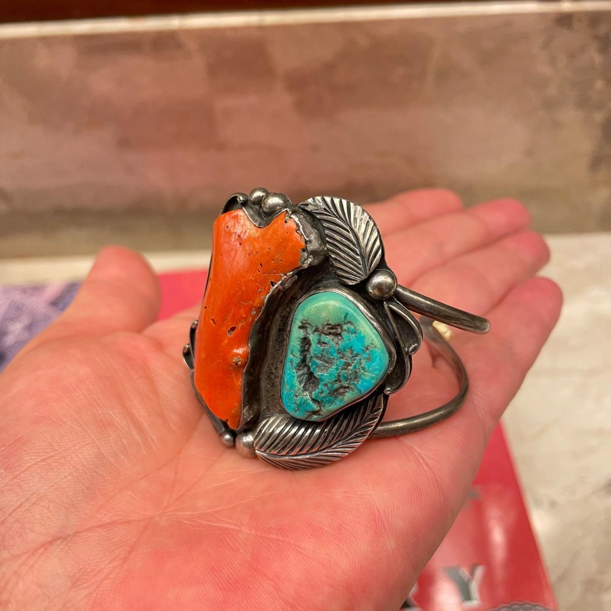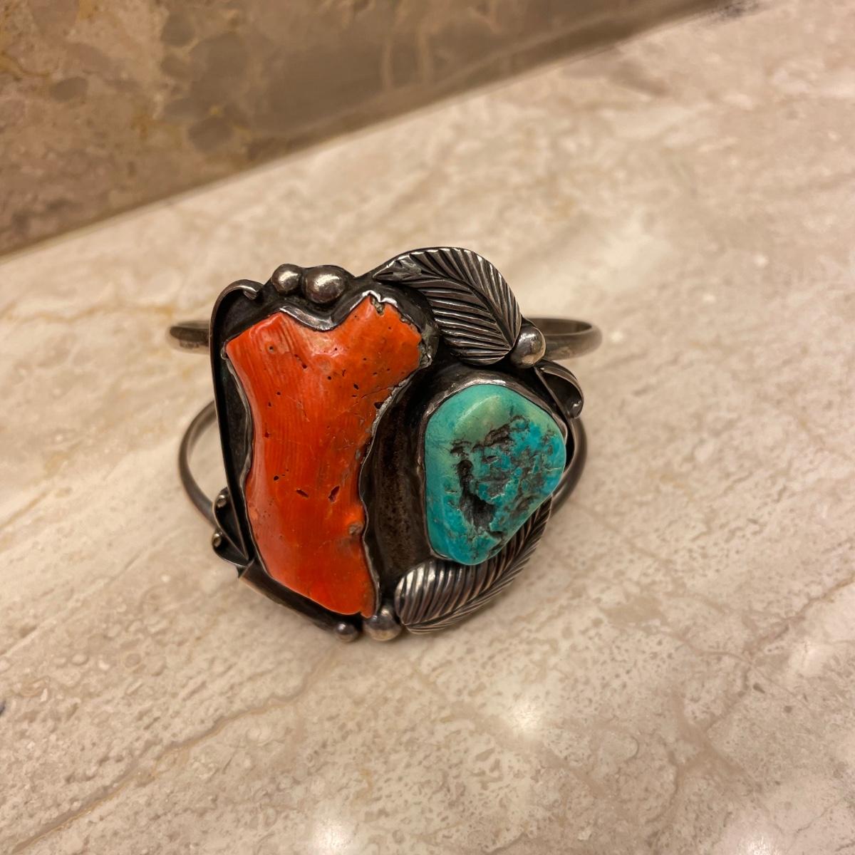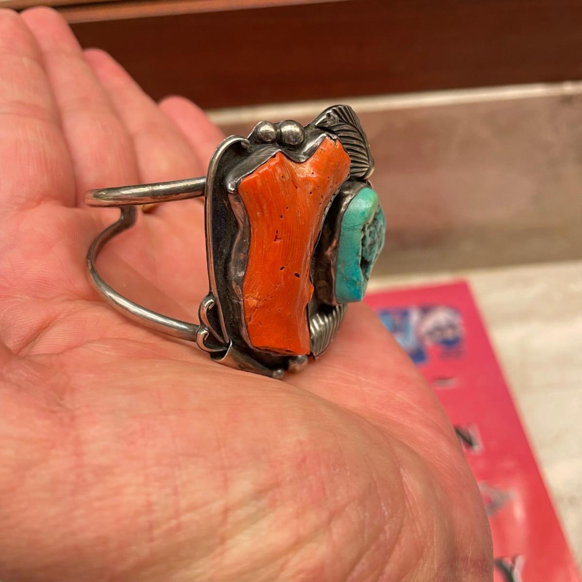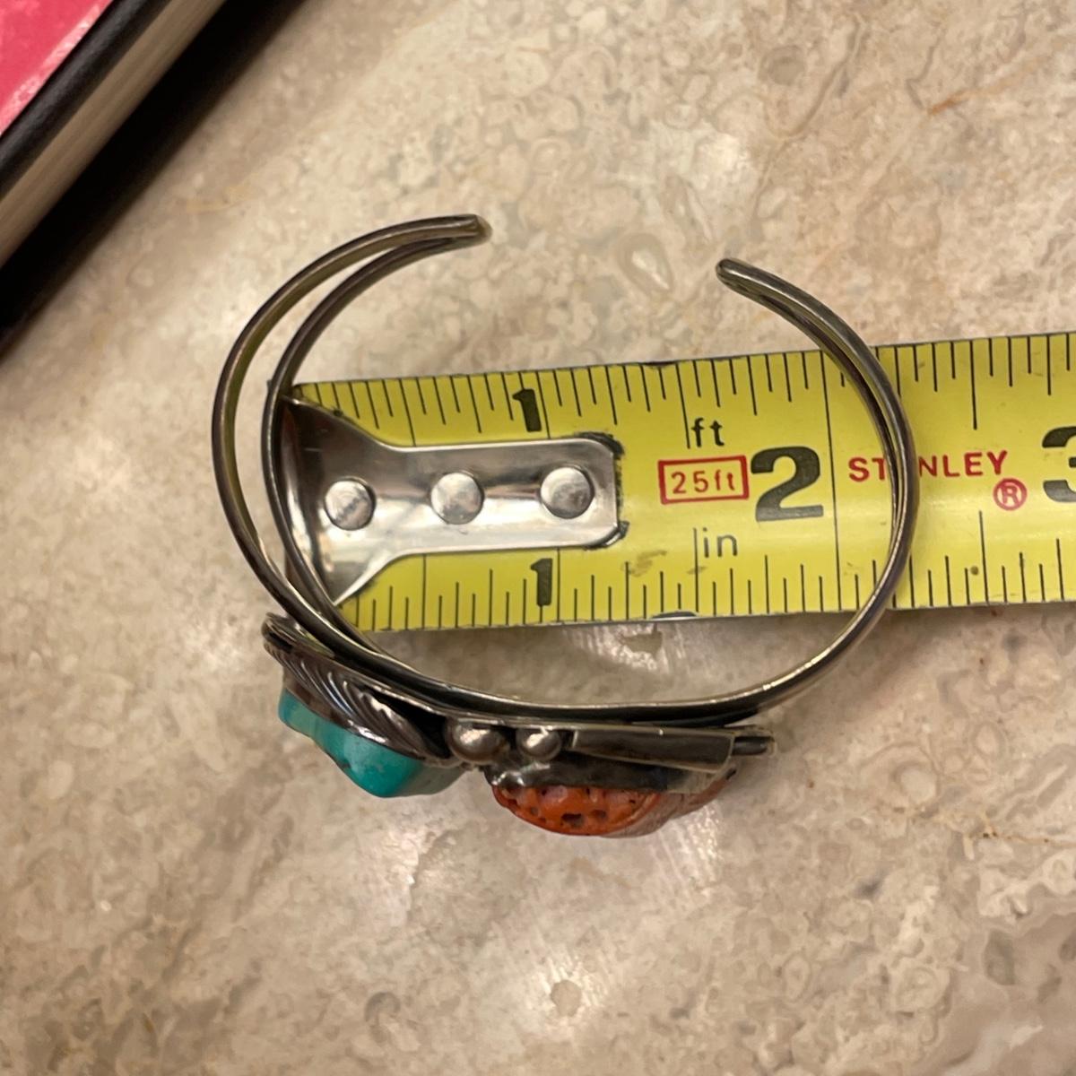 Large 2” setting with what appears to be turquoise and coral in a silver colored metal cuff bracelet. The setting is stamped on the back and has Navajo style throughout. Lot also contains South-Western Indian Jewelry book with colored photos by Dexter Cirillo. See images. Shipping available.