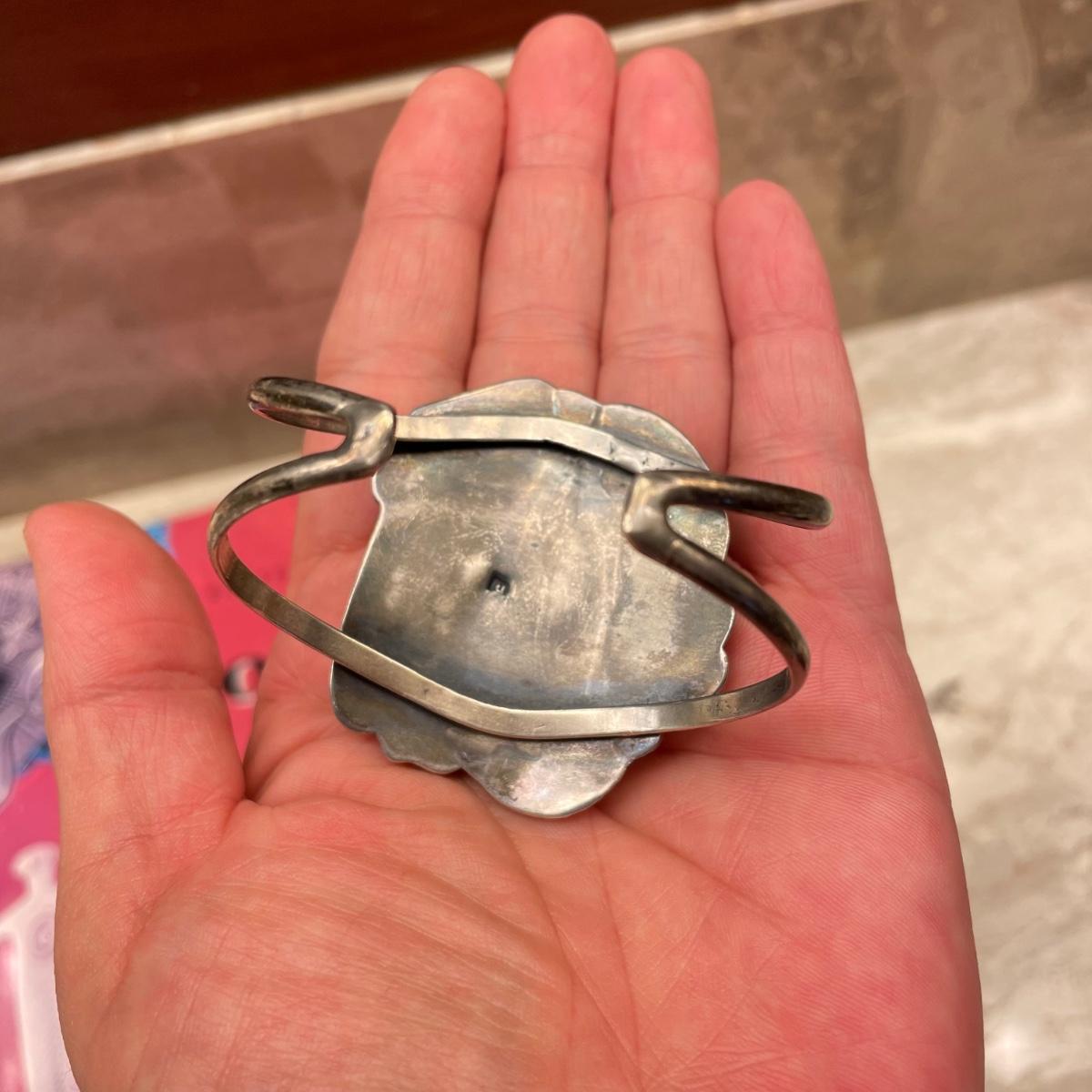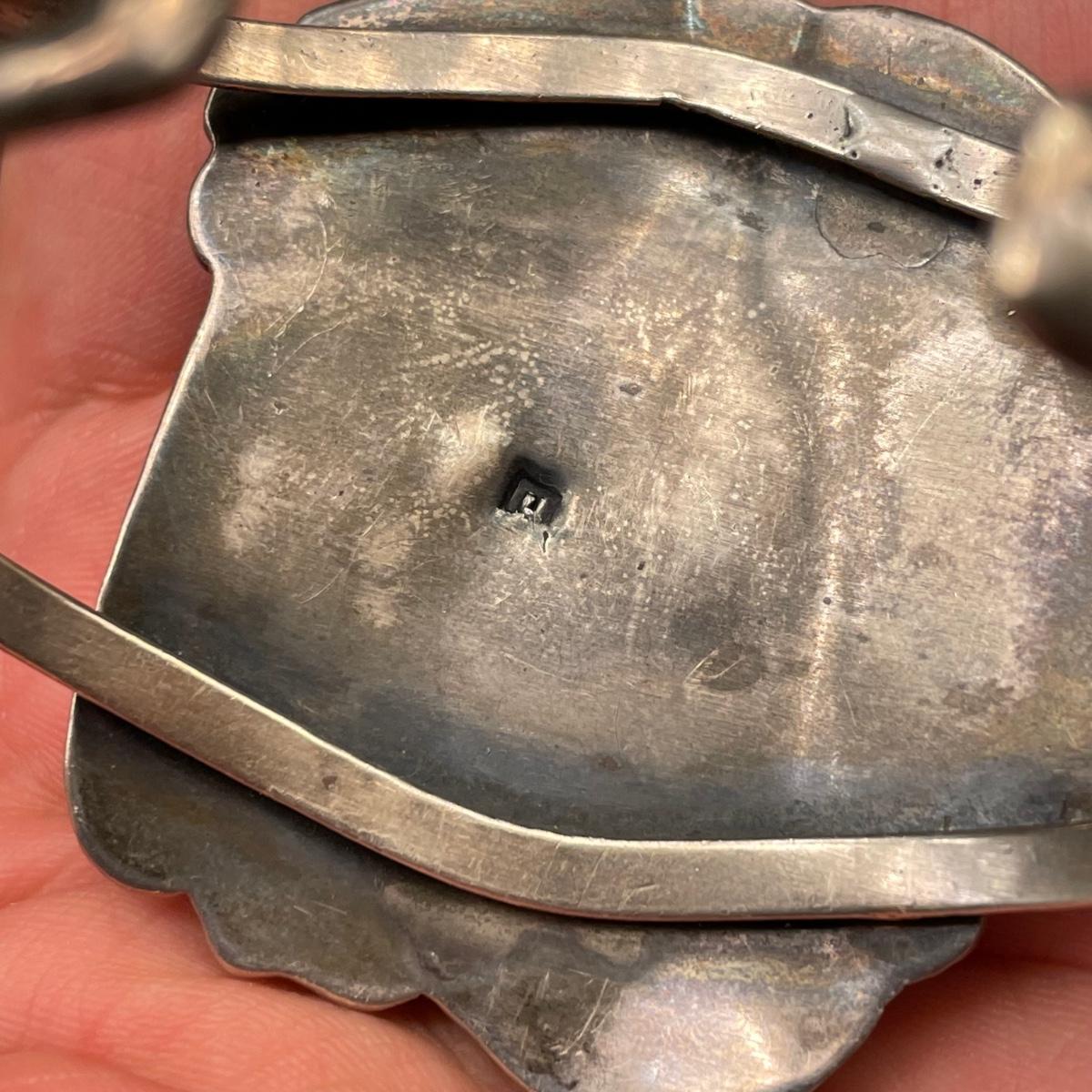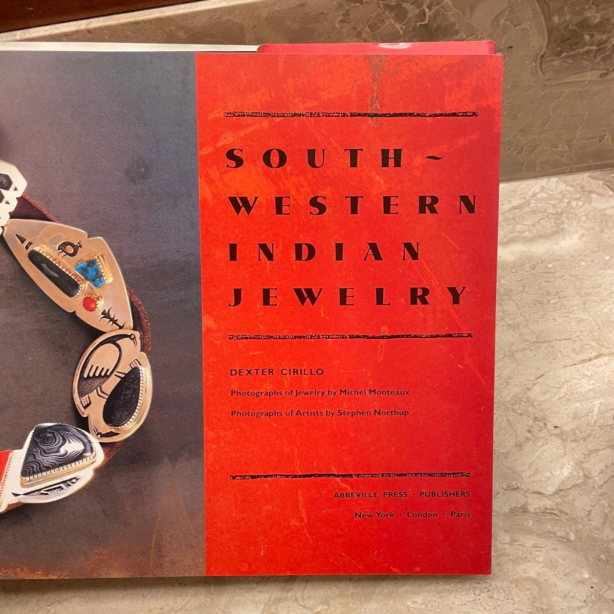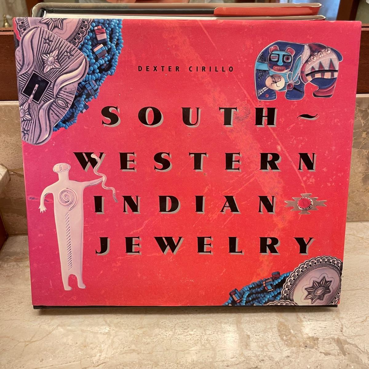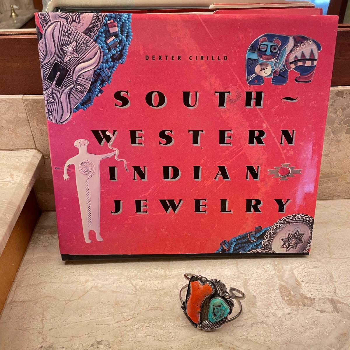 Large 2” setting with what appears to be turquoise and coral in a silver colored metal cuff bracelet. The setting is stamped on the back and has Navajo style throughout. Lot also contains South-Western Indian Jewelry book with colored photos by Dexter Cirillo. See images. Shipping available.