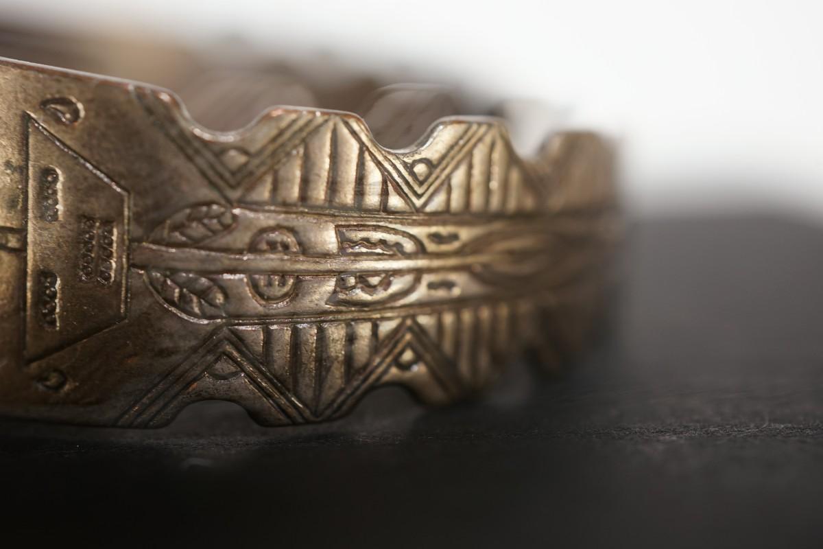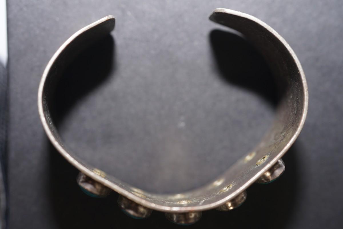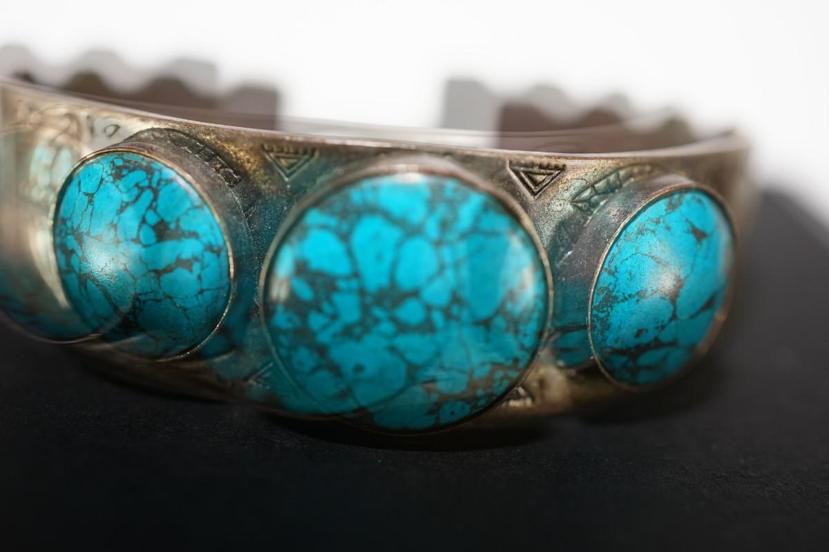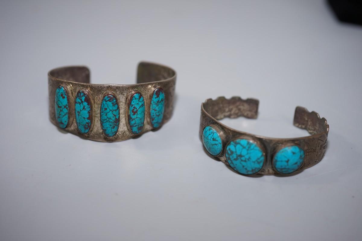 silver tone cuff bracelets with set turquoise. Intricate engravings along the band.