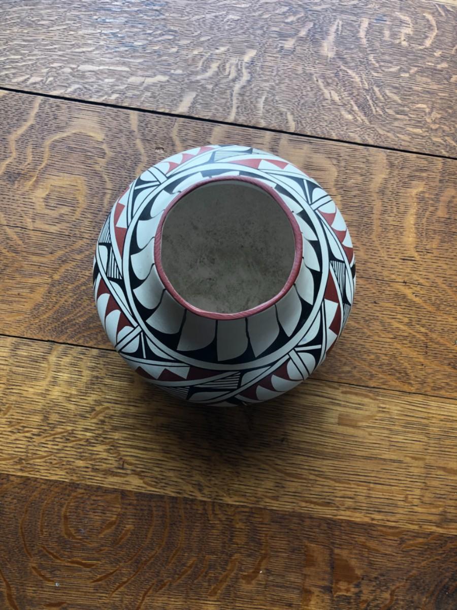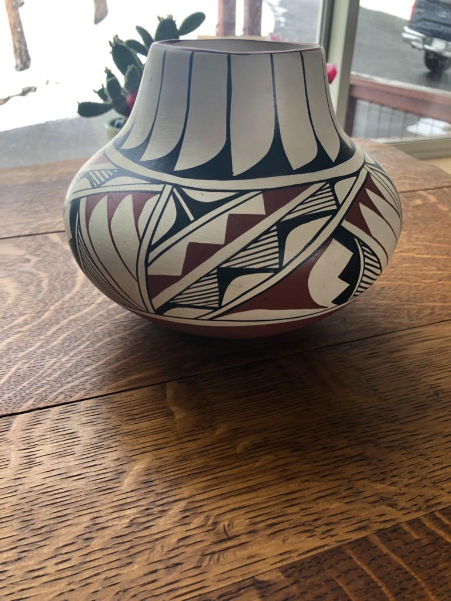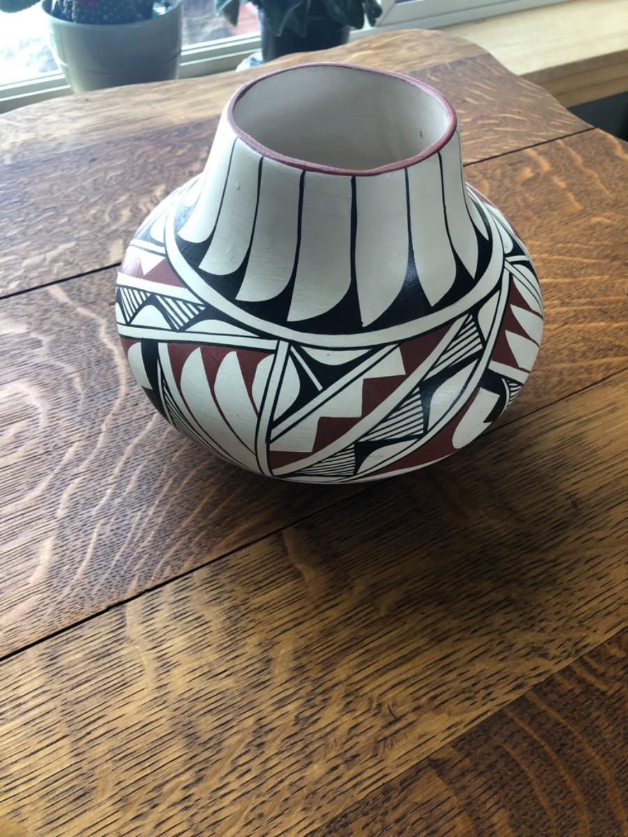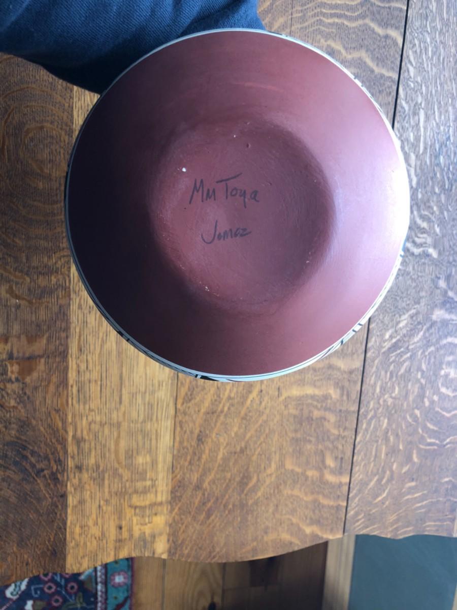 This is a Native American vase signed MM Toya Jamoz. Its in excellent condition. 6in wide and 7in tall