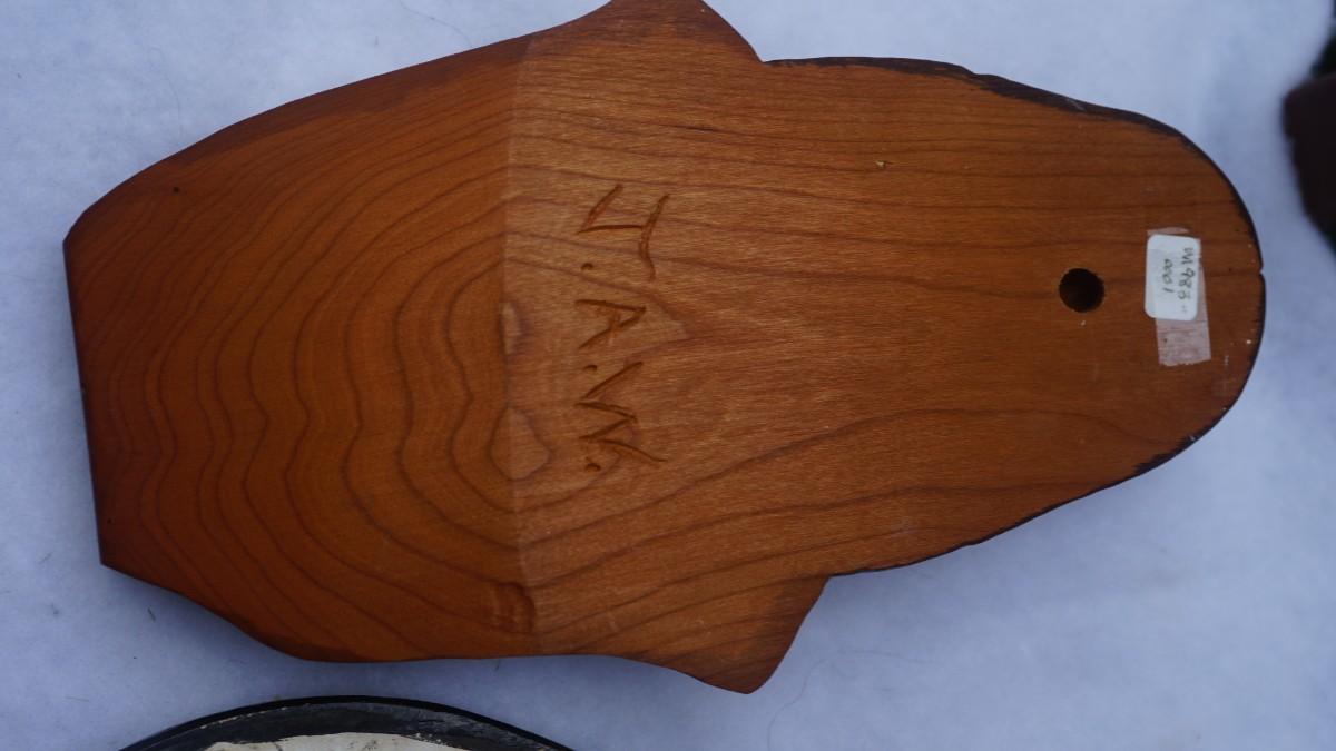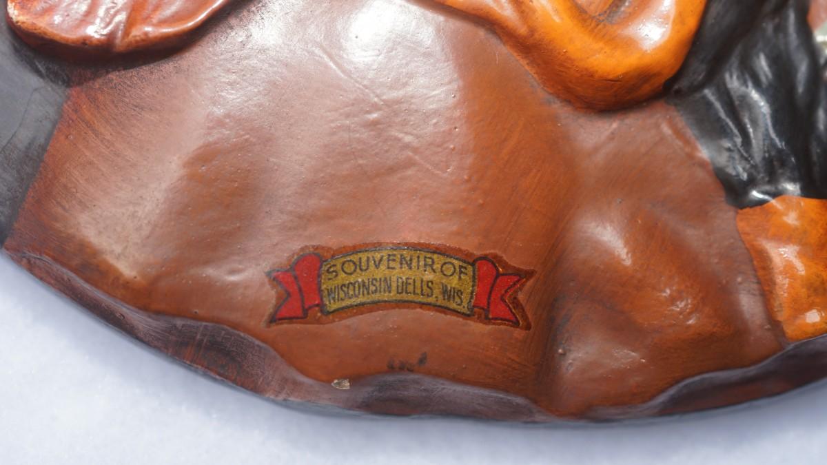 NATIVE AMERICAN WISCONSIN DELLS SOUVENIR ITEMS FROM THE 1950'S PLASTER ROUND PLAQUE AND WOOD CARVED
