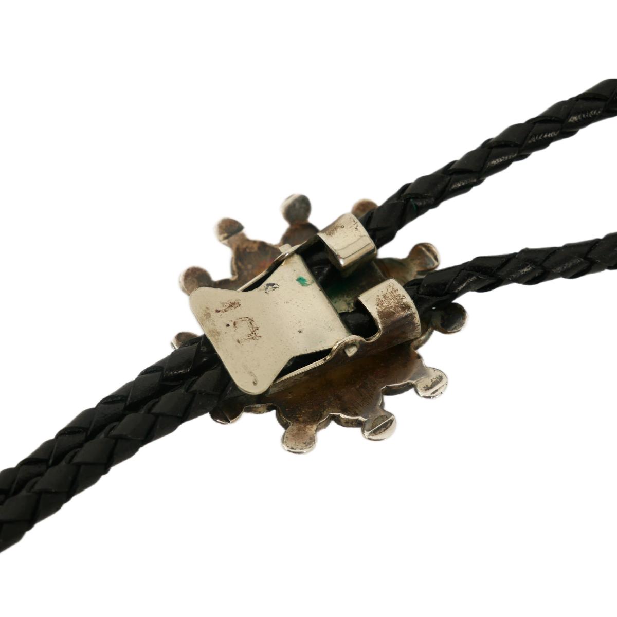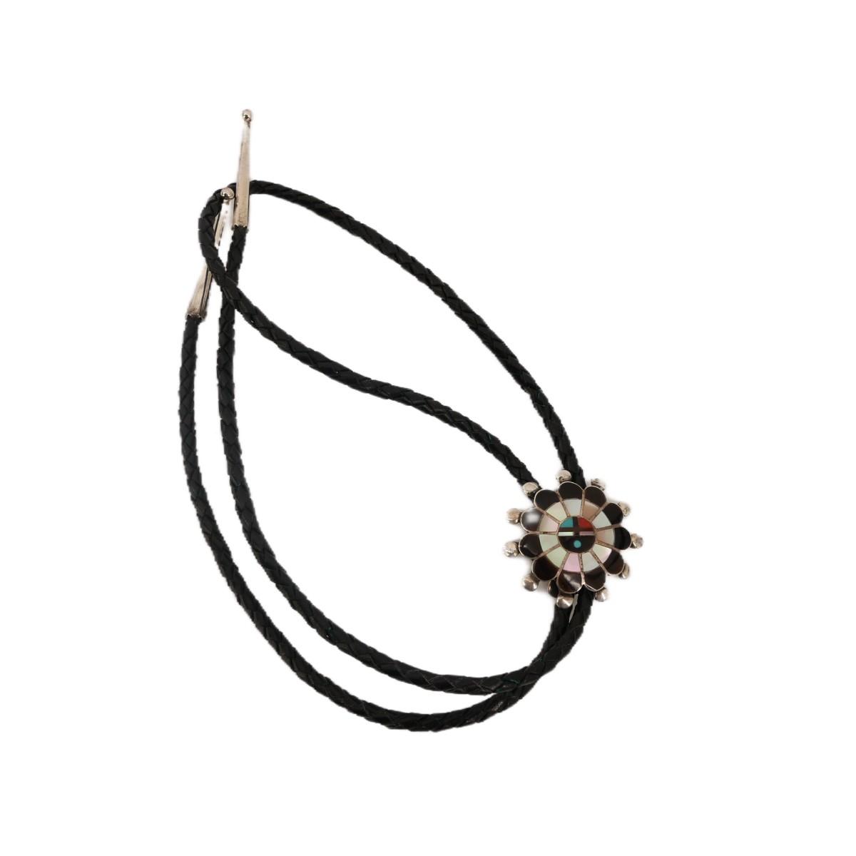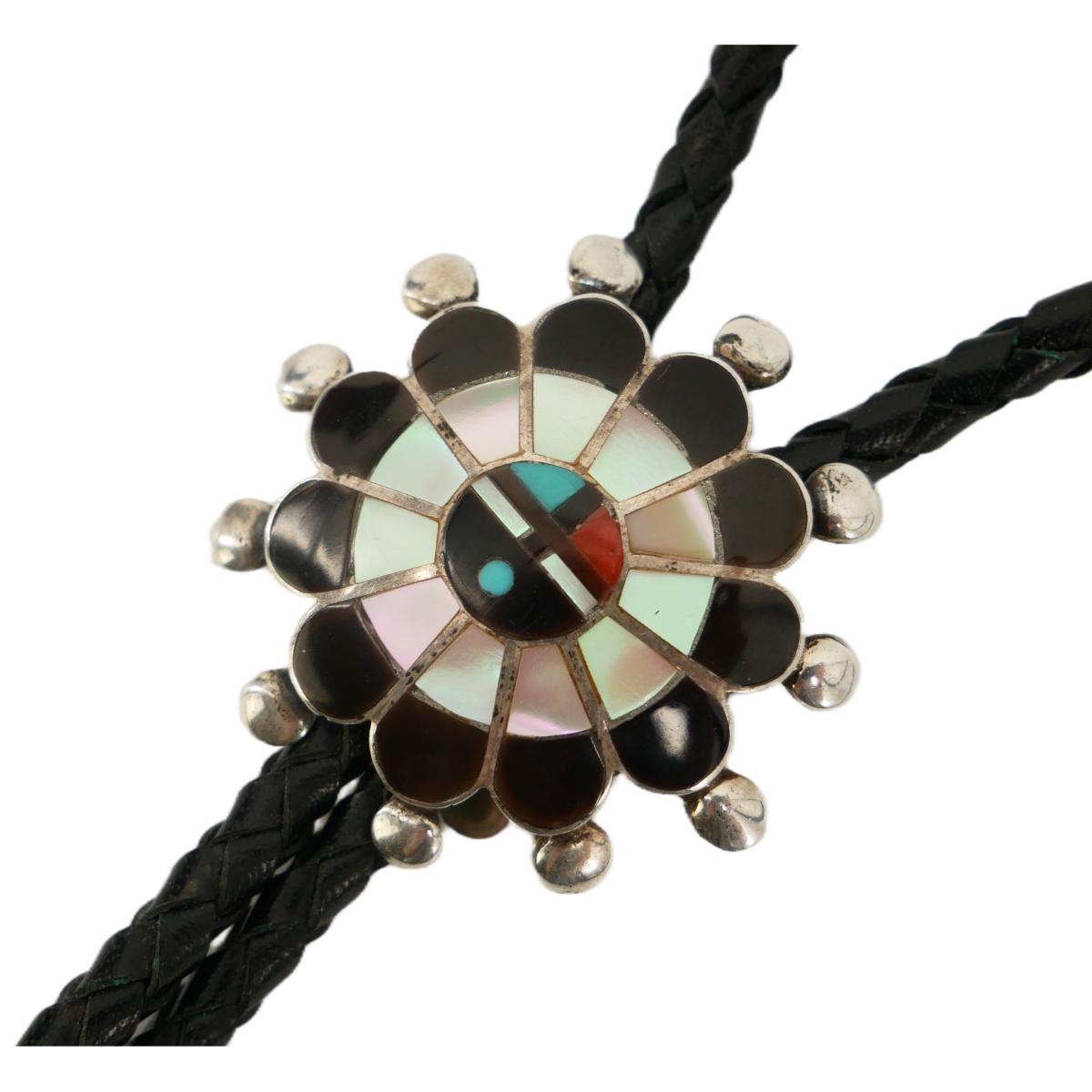 Vintage Zuni bolo tie with mother of pearl and stone inlays. Braided cord necklace with sterling silver tips. Measures 16.5" in length and weighs 0.8 oz. (J3)