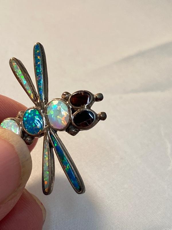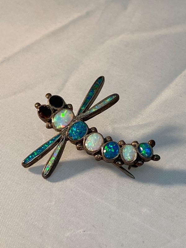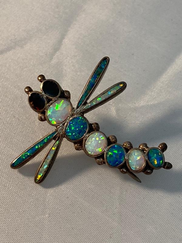 Beautiful Dragonfly Pin Pendant. Signed "J.E." "Zuni" on the back. Silver setting. Inlaid opals make up the body and wings. The eyes are really dark stone, possibly obsidian. Can be worn as a pin or on a necklace. Measures almost 1.5".